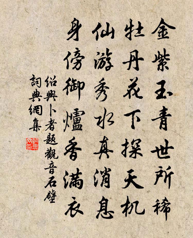 詩詞名句歷史字典書法欣賞書法字典國語詞典說文解字康熙字典古漢語字典標 題 作 者 詩 句 題觀音石壁作者:紹興卜者 朝代:宋代題觀音石壁原文金紫玉青世所稀,牡丹花下探天機。仙遊秀水真訊息,身傍御爐香滿衣。詩詞問答問:題觀音石壁的作者是誰?答:紹興卜者問:題觀音石壁寫於哪個朝代?答:宋代紹興卜者題觀音石壁書法欣賞題觀音石壁書法作品詩詞推薦感懷孟郊〔唐代〕孟冬陰氣交,兩河正屯兵。煙塵相馳突,烽火日夜驚。太行險阻高,挽粟輸連營。奈何操弧者,不使梟巢傾。猶聞風流子(前題)吳文英〔宋代〕溫柔酣紫曲,揚州路、夢繞翠盤龍。似日長傍枕,墮妝偏髻,露濃如酒,微醉敧紅。自別楚嬌天正遠,傾國見吳宮龜堂雜興陸游〔宋代〕二三鄰曲偶相尋,小醉悠然臥竹陰。醒後自看還自笑,溪雲猶未是無心。新喻縣蘇晉叔相會戴復古〔宋代〕偶作榆溪客,還逢橘井仙。多才出人上,笑我老吟邊。買錦囊詩卷,典衣供酒錢。竹林青眼叔,常說仲容賢。春日汎舟南湖因遍游近港坐間書客所攜四扇張鎡〔宋代〕遠近高低錦樹明,直疑春教蝶多情。人間萬事思量盡,只好園居過此生。尾犯佚名〔宋代〕輕風淅淅,正園林蕭索,未回暖律。嶺頭昨夜,寒梅初發,一枝訊息。香苞漸拆。天不許、雪霜欺得。望東吳,驛陪王庶子游後湖涵虛閣徐鉉〔唐代〕懸圃清虛乍過秋,看山尋水上茲樓。輕鷗的的飛難沒,紅葉紛紛晚更稠。次韻毛君偶成蘇轍〔宋代〕年來衰病正相兼,薄宦賓士尚未厭。詩句空多渾漫與,俗緣已重不須添。聱牙向物知難合,疏懶憐公獨未嫌。時聽次常熟縣先君舊所攝宰也袁說友〔宋代〕沖寒一舸下琴川,小纜依依市柳邊。花縣重來聽好語,棠陰深處不論年。釣游頗憶兒童舊,風物徒驚歲月遷。老恐春景呂徽之〔宋代〕前溪凍解綠生波,好雨催花向曉過。宿酒未醒眠未起,半窗紅日鳥聲多。行腳萬壽祺〔清代〕杖缽孤蹤去,淒其驛路間。水喧沂北道,風撼穆南關。飛鳥移前浦,歸雲滿故山。五年江上客,今有幾人還?還至張掖古城,聞東軍告捷,贈韋五虛己陳子昂〔唐代〕孟秋首歸路,仲月旅邊亭。聞道蘭山戰,相邀在井陘。屢斗關月滿,三捷虜雲平。漢軍追北地,胡騎走南庭。君為喜知命弟自青原歸黃庭堅〔宋代〕為吏困米鹽,曲肱夢靈泉。諒非調鼎手,正覺荷鋤便。在公雖勤苦,歸喜叔山禪。去我忽數日,草蟲傍床煎。屋角諒公洞庭孤橘歌顧況〔唐代〕不種自生一株橘,誰教渠向階前出,不羨江陵千木奴。下生白蟻子,上生青雀雛。飛花檐卜旃檀香,結實如綴摩尼余臥疾深村聞一二郎官今稱繼使閩越笑余迂古…因成此篇韓偓〔唐代〕枕流方采北山薇,驛騎交迎市道兒。霧豹只憂無石室,泥鰍唯要有洿池。不羞莽卓黃金印,卻笑羲皇白接罒離。莫四月八日三絕劉克莊〔宋代〕九龍吐香水,茲事已千秋。道是本無垢,年年浴未休。敲爻歌呂岩〔唐代〕漢終唐國飄蓬客,所以敲爻不可測。縱橫逆順沒遮欄,靜則無為動是色。也飲酒,也食肉,守定胭花斷淫慾。行歌丙寅十四首效韋蘇州黃庭堅〔宋代〕少小尚狷介,與人常不款。置身稍雍容,遇酒輒引滿。自是鶴長足,難齊鳧脛短。贈陳起劉克莊〔宋代〕陳侯生長紛華地,卻以芸香自沐薰。鍊句豈非林處士,鬻書莫是穆參軍。雨檐兀坐忘春去,雪案清談至夜分。何日聽歌六絕句。離別難白居易〔唐代〕綠楊陌上送行人,馬去車回一望塵。不覺別時紅淚盡,歸來無淚可沾巾。名句推薦待人宜寬,惟待子孫不可寬;行禮宜厚,惟行嫁娶不必厚。王永彬《圍爐夜話·第一七八則》 髻子傷春慵更梳。晚風庭院落梅初。李清照《浣溪沙·髻子傷春慵更梳》 鳳林關里水東流,白草黃榆六十秋。張籍《涼州詞三首·其三》 但願蒼生俱飽暖,不辭辛苦出山林。于謙《詠煤炭》 鳥飛反鄉,兔走歸窟,狐死首丘,寒將翔水,各哀其所生。劉安及其門客《淮南子·說林訓》 夢裡不知身是客,一晌貪歡。李煜《浪淘沙令·簾外雨潺潺》 危橋屬幽徑,繚繞穿疏林。柳宗元《巽公院五詠·苦竹橋》 卓眾來東下,金甲耀日光。蔡琰《悲憤詩》 林外鳴鳩春雨歇,屋頭初日杏花繁。歐陽修《田家》 故國神遊,多情應笑我,早生華髮。蘇軾《念奴嬌·赤壁懷古》