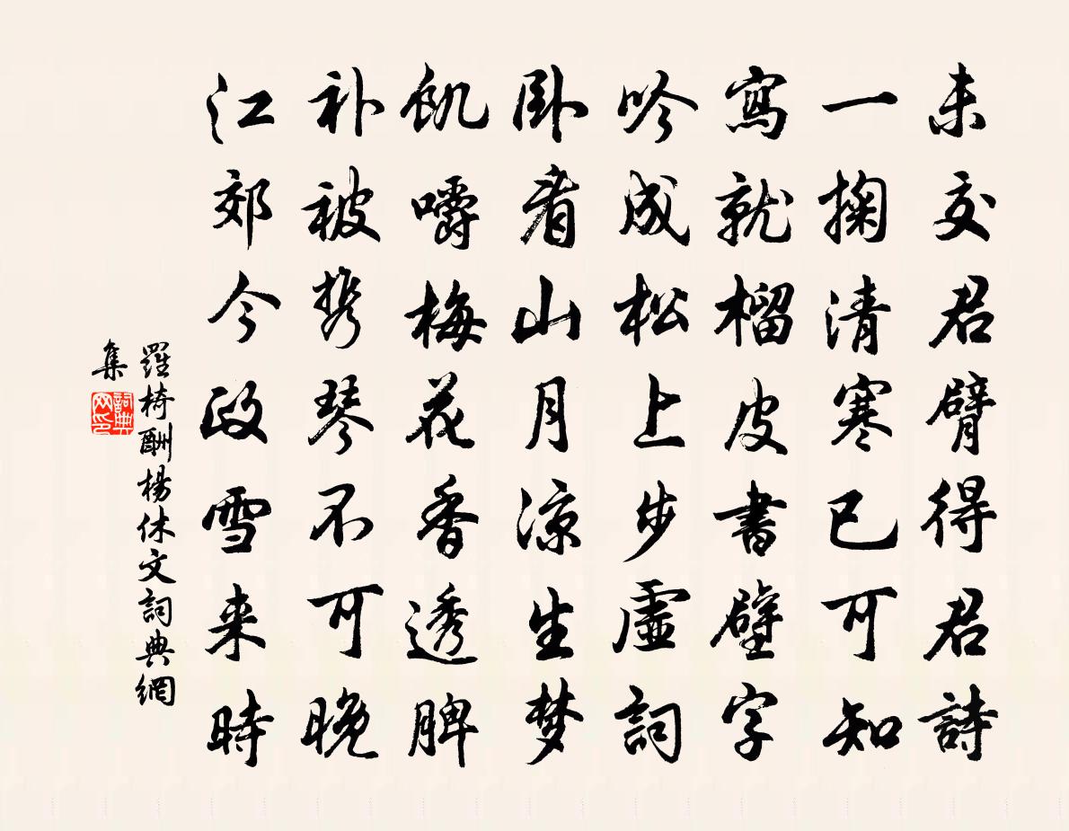 詩詞名句歷史字典書法欣賞書法字典國語詞典說文解字康熙字典古漢語字典標 題 作 者 詩 句 酬楊休文作者:羅椅 朝代:宋代酬楊休文原文未交君臂得君詩,一掬清寒已可知。寫就榴皮書壁字,吟成松上步虛詞。臥看山月涼生夢,飢嚼梅花香透脾。補被攜琴不可晚,江郊今政雪來時。詩詞問答問:酬楊休文的作者是誰?答:羅椅問:酬楊休文寫於哪個朝代?答:宋代羅椅酬楊休文書法欣賞酬楊休文書法作品詩詞推薦送連氏昆仲還省侍宋祁〔宋代〕酥酪君家伯仲賢,相從黌舍倏經年。三卮酒薄難為聖,一腹書空但喜眠。庾信刻筠懷舊塢,隱侯題壁有新篇。糅甘題人畫扇十首曹勛〔宋代〕雪余蒲葦襯沙黃,野水寒清雁半翔。柳下搖風雲漠漠,飛鳴應喜下瀟湘。壽鄧提乾母陽枋〔宋代〕爭似瑤仙捧玉觴,一堂四世聚簪裳。間中尊俎江山久,靜里襟懷日月長。蓂紫爛連庭桂此,橘香濃引誥花香。陵溪秋風梅堯臣〔宋代〕秋風不饒物,斗至聲已惡。青林葉尚繁,雖好將恐落。人意誠愛惜,節候肯相若。白髮無再玄,盛衰茲可度。早春閒行白居易〔唐代〕鶯早乍啼猶冷落,花寒欲發尚遲疑。 同水部張員外籍曲江春遊,寄白二十二舍人韓愈〔唐代〕漠漠輕陰晚自開, * 映樓台。曲江水滿花千樹,有底忙時不肯來。送明甫初筮十首劉克莊〔宋代〕寧游屋溪畔,勿傍盜泉邊。監竹不食筍,先賢樣在前。送李明甫召除奉常簿陳棣〔宋代〕壑主臨軒達四聰,皎如麗日明高穹。傾葵發蔀燭幽隱,熙然萬物還春風。鼎新百度躋時雍,西垣東省羅鵷鴻。鋒車浣溪沙(再用韻)張孝祥〔宋代〕宮柳垂垂碧照空。九門深處五雲紅。朱衣只在殿當中。細拈絲梢龍尾北,緩攜綸旨鳳池東。阿婆三五笑春風。酒泉子(同前)晁補之〔宋代〕萱草戎葵,松菊堂深猶畏暑,晚雲催雨靄簾櫳。滿樓風。池蓮翻倒小蓮紅。看掃鑒、天清似水,一輪明月卻當空。送李著和之漢陽徐鉉〔唐代〕聞道驅征旆,行行至漢陽,初程微雨齊,滿路落花香。遠宦心常適,青雲去未妨。惟余親戚分,惆悵上河梁。解連環奚岊〔宋代〕霽環新掠。正風回浪影,時搖城腳。嘆天涯、春草無倫,似凝佇當時,柳顰花弱。步錦珠沉,謾一眸、千年如昨。句劉師道〔宋代〕逝波帝子魂何在,芳草王孫怨未歸。浣溪沙李氏〔宋代〕無力薔薇帶雨低。多情蝴蝶趁花飛。流水飄香乳燕啼。南浦魂銷春不管,東陽衣減鏡仙知。小樓今夜月依依。紙衾三首沈說〔宋代〕繭面新乾帶露揉,春回斗帳伴吟愁。殘年已辦蒙頭過,風雪從教打戍樓。敘州陸游〔宋代〕畫船沖雨入戎州,縹緲山橫杜若洲。須信時平邊堠靜,傳烽夜夜到西樓。贈廣宣大師范仲淹〔宋代〕憶昔同游紫閣雲,別來三十二迥春。白頭相見雙林下,猶是清朝未退人。落葉曾鞏〔宋代〕秋雨與風相噴薄,樹木可能無葉落。琅玕散漫不可收,野步滿船誰掃掠。垂楊千樹舊所惜,顏色易衰由力弱。空條次黃山中山居韻二首楊公遠〔宋代〕結茅林麓久,老大鬢絲多。浮世幾棋局,生涯一釣蓑。位卑希少室,飲醉達無何。勘破紅塵事,風恬水不波。自入南與二陸丈游知其為侍郎族也小陸丈除欽曾豐〔宋代〕叔侄嶺南邊,熊車相後先。同時持紫橐,指日復青氈。契分膠投漆,離情雨帶煙。吾窮公富貴,勿廢往來箋。名句推薦水波而上,盡其搖而復下,其勢固然者也。管仲《管子·君臣下》 縱使有花兼有月,可堪無酒又無人。李商隱《春日寄懷》 洞房昨夜停紅燭,待曉堂前拜舅姑。朱慶餘《近試上張籍水部 / 近試上張水部 / 閨意獻張水部》 昔時人已沒,今日水猶寒。駱賓王《於易水送人 / 於易水送別》 自誠明,謂之性;自明誠,謂之教。子思《中庸·第二十一章》 風也蕭蕭,雨也蕭蕭,瘦盡燈花又一宵。納蘭性德《採桑子·誰翻樂府淒涼曲》 曾把芳心深相許。故夢勞詩苦。史達祖《留春令·詠梅花》 松葉堪為酒,春來釀幾多。張九齡《答陸澧》 淒涼寶劍篇,羈泊欲窮年。李商隱《風雨》 凡人之患,蔽於一曲,而闇於大理。荀子《荀子·解蔽》