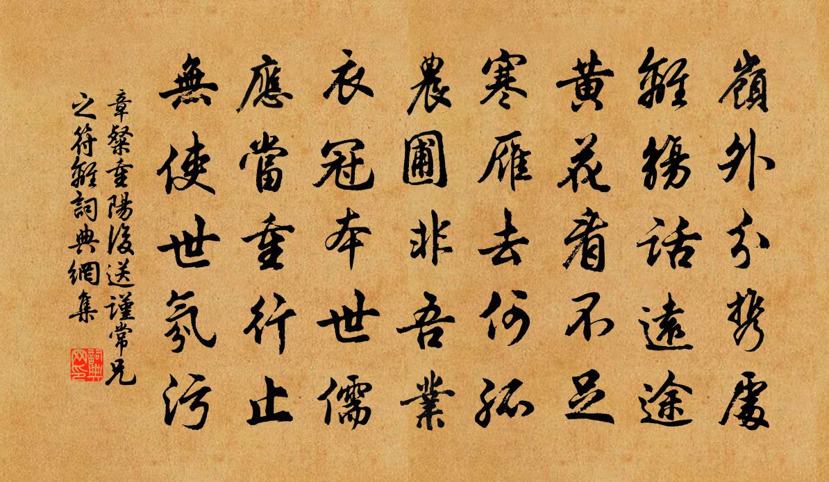 詩詞名句歷史字典書法欣賞書法字典國語詞典說文解字康熙字典古漢語字典標 題 作 者 詩 句 重陽後送謹常兄之符離作者:章粲 朝代:宋代重陽後送謹常兄之符離原文嶺外分攜處,離觴話遠途。黃花看不足,寒雁去何孤。農圃非吾業,衣冠本世儒。應當重行止,無使世氛污。詩詞問答問:重陽後送謹常兄之符離的作者是誰?答:章粲問:重陽後送謹常兄之符離寫於哪個朝代?答:宋代章粲重陽後送謹常兄之符離書法欣賞重陽後送謹常兄之符離書法作品詩詞推薦山居五首釋子淳〔宋代〕不戀白雲關,家山撒手還。玉爐香旖旎,石辜水潺湲。庭樹煙籠合,窗軒雨灑斑。經行及坐臥,常在寂寥間。送升上人馳法嗣書釋子淳〔宋代〕飛花暖日輕相送,烈焰須憑作者通。覿面不伸語路,丹山千里事同風。江亭晚望宋之問〔唐代〕浩渺浸雲根,煙嵐出遠村。鳥歸沙有跡,帆過浪無痕。望水知柔性,看山欲斷魂。縱情猶未已,回馬欲黃昏。句朱長文〔唐代〕夜靜忽疑身是夢,更聞寒雨滴芭蕉。續古詩十首白居易〔唐代〕戚戚復戚戚,送君遠行役。行役非中原,海外黃沙磧。伶俜獨居妾,迢遞長征客。君望功名歸,妾憂生死隔。誰家重題小舫,贈周從事,兼戲微之白居易〔唐代〕細篷青篾織魚鱗,小眼紅窗襯麴塵。闊狹才容從事座,高低恰稱使君身。舞筵須揀腰輕女,仙棹難勝骨重人。不似次韻趙青之水口道中李彌遜〔宋代〕我從楚江來,不見閩江大。雲山路嶮巘,水石勢澎湃。舟行曲屈間,溪面浮百怪。蒿師力推拿,如下吾儂拜。丈人禪人並化主寫真求贊釋正覺〔宋代〕身心山野,面目草灰。默說一句,明暗全該。機流電天上之火,動發陽地中之雷。變化窮通有許事,向道俱從恁麽曲河驛初見嵩少張耒〔宋代〕我行日益深,所遇日益好。森然過絕壁,慘澹石色老。層峰乍崩奔,峻峽忽開導。清溪瀉兩間,淺瀨浮水鳥。縈紆山中方岳〔宋代〕無心出岫懶於雲,生死交情一付君。五柳當門陶令宅,百梅共塢老逋墳。山雖甚淺略堪隱,硯不能靈並可焚。我亦竹王睿〔唐代〕庭竹森疏玉質寒,色包蔥碧盡琅玕。翠筠不樂湘娥淚,斑籜堪裁漢主冠。成韻含風已蕭瑟,媚漣凝淥更檀欒。此君經故洛城王貞白〔唐代〕卜世何久遠,由來仰聖明。山河徒自壯,周召不長生。幾主任奸諂,諸侯各戰爭。但余崩壘在,今古共傷情。寄無願上人齊己〔唐代〕六十八去七十歲,與師年鬢不爭多。誰言生死無消處,還有修行那得何。開士安能窮好惡,故人堪憶舊經過。會歸送金吾侍御奉使日東許棠〔唐代〕還鄉兼作使,到日倍榮親。向化雖多國,如公有幾人。孤山無返照,積水合蒼旻。膝下知難住,金章已系身。病癒陸游〔宋代〕倦榻呻吟每自哀,占蓍來告出余災。自能洗研拂書幾,時亦折花尋酒杯。久類寒蛟潛岫穴,忽如老馬噴風埃。霜晴庭竹厲文翁〔宋代〕渭川未暇栽千畝,庭檻聊須種數根。敢愛深秋群木脫,獨欺風雨戰黃昏。過真州沈德潛〔清代〕揚州西去真州路,萬樹垂楊繞岸栽。野店酒香帆盡落,寒塘漁散鷺初回。曉風殘月屯田墓,零露浮雲魏帝台。此夕高陽台(芙蓉)蔣捷〔宋代〕霞鑠簾珠,雲蒸篆玉,環樓婉婉飛鈴。天上王郎,飈輪此地曾停。秋香不斷台隍遠,溢萬叢、錦艷鮮明。事成塵,瑞鷓鴣(二之二)柳永〔宋代〕全吳嘉會古風流。渭南往歲憶來游。西子方來、越相功成去,千里滄江一葉舟。至今無限盈盈者,盡來拾翠芳洲。讀沈下賢集絕句二呈圓機晁說之〔宋代〕荷葉拳拳恨未舒,伊人歸興問何如。空看蠅鼻燈花喜,不得平安一紙書。名句推薦草滿池塘水滿陂,山銜落日浸寒漪。雷震《村晚》 江南幾度梅花發,人在天涯鬢已斑。劉著《鷓鴣天·雪照山城玉指寒》 別裁偽體親風雅,轉益多師是汝師。杜甫《戲為六絕句》 湖水無端浸白雲,故人書斷孤鴻沒。黃庭堅《秋懷二首》 野老念牧童,倚杖候荊扉。王維《渭川田家》 天地交而萬物通也,上下交而其志同也。佚名《易傳·彖傳上·泰》 夜來風雨聲,花落知多少。孟浩然《春曉》 巴山楚水淒涼地,二十三年棄置身。劉禹錫《酬樂天揚州初逢席上見贈》 夕陽鳥外,秋風原上,目斷四天垂。柳永《少年游·長安古道馬遲遲》 長使英雄淚滿襟,天意高難問。楊冠卿《卜運算元·秋晚集杜句吊賈傅》