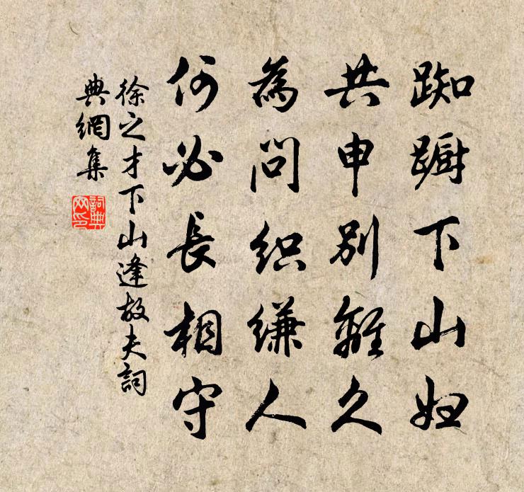 詩詞名句歷史字典書法欣賞書法字典國語詞典說文解字康熙字典古漢語字典標 題 作 者 詩 句 下山逢故夫作者:徐之才 朝代:唐代下山逢故夫原文踟躕下山婦,共申別離久。為問織縑人,何必長相守。詩詞問答問:下山逢故夫的作者是誰?答:徐之才問:下山逢故夫寫於哪個朝代?答:唐代問:下山逢故夫是什麼體裁?答:五絕徐之才下山逢故夫書法欣賞下山逢故夫書法作品注釋全唐詩:卷773-2詩詞推薦孤城王安石〔宋代〕孤城回望距幾何,記得好處常經過。最思東山煙樹色,更憶南湖秋水波。百年顛倒如夢寐,萬事乖隔徒悲歌。應須雜曲歌辭。悲哉行白居易〔唐代〕悲哉為儒者,力學不能疲。讀書眼欲暗,秉筆手生胝。十上方一第,成名常苦遲。縱有宦達者,兩鬢已成絲。可憐挽蔡西山先生翁升〔宋代〕傷哉道學不容時,力抵先生蹈至危。槐棘僉謀雖日偽,草茅公論實難欺。蒼梧千里地雖遠,白首一心天自知。借問送張丞歸使幕(一作張繼詩)韓翃〔唐代〕獨受主恩歸,當朝似者稀。玉壺分御酒,金殿賜春衣。拂席流鶯醉,鳴鞭駿馬肥。滿台簪白筆,捧手戀清暉。秋登巴陵望洞庭李白〔唐代〕清晨登巴陵,周覽無不極。明湖映天光,徹底見秋色。秋色何蒼然,際海俱澄鮮。山青滅遠樹,水綠無寒煙。來帆次韻梅山弟感春陳著〔宋代〕老來危跡感秋蓬,萬事都歸馬耳風。百五節為春好處,兩三年在亂離中。濺花難禁少陵淚,縛柳休辭韓子窮。最是書補之梅王柏〔宋代〕玉質敷腴宮樣妝,風流終媿水雲鄉。一邨飛落人間世,添卻逃禪百倍香。用元韻答徐尉王炎〔宋代〕于越亭亭羊角峰,下有團團桂樹叢。何人為賦反招隱,虞羅亦罥碣石鴻。學詩妙處如學仙,功成換骨參喬松。肯來淳化鄉飲酒三十三章佚名〔宋代〕伊鵲成巢,珍禽攸處,內助賢侯,弼於明主。伊鵲成巢,珍禽輯睦。均養嘉兒,致於蕃育。句邵拙〔唐代〕萬國不得雨,孤雲猶在山。詠畫屏風詩 五庾信〔南北朝〕逍遙遊桂苑。寂絕到桃源。狹石分花徑。長橋映水門。管聲驚百鳥。人衣香一園。定知歡未足。橫琴坐石根。酬江西盧端公藍口阻風見寄之什許渾〔唐代〕又攜刀筆泛膺舟,藍口風高桂楫留。還似郢中歌一曲,夜來春雪照西樓。再用前韻各賦三解吳潛〔宋代〕密雲能雨自西方,不假巫{上八下幾右王}解息殃。地產固應滋物產,天涼那更挾心涼。未憂懸釜供蘇爨,何事量瑞鶴仙(元夕為王史君賦)楊炎正〔宋代〕風光開舊眼。正梅雪初消,柳絲新染。樓台競裝點。照金荷十里,珠簾齊卷。湘弦楚管。動香風、旌旗影轉。望雲木蘭花慢 壽張可與張伯淳〔元代〕對黃花爛漫,能幾日,又重陽。問眼底湖山,新□□□,別是風光。三台近臨吳地,映奎*、明處紫微郎。人道當偈頌七十六首釋師觀〔宋代〕開池不待月,池成月自來。寒山逢拾得,拊掌笑咍咍。曉行聞竹雞二首楊萬里〔宋代〕山行三日厭泥行,幸自今晨得一晴。又聽數聲泥滑滑,情知浪語也心驚。臨寂偈釋若愚〔宋代〕本自無家可得歸,雲邊有路許誰知。溪光搖落西山月,正是仙潭夢斷時。室里千花羅網,夢中七寶蓮池。踏得西歸孟嘗君歌司馬光〔宋代〕君不見薛公正齊當路時,三千豪士相追隨。邑封萬戶無自入,椎牛釃酒不為貲。門下紛紛如市人,雞鳴狗盜亦同塵蕃來湖州連與叔驥和叔明父叔寶相從又從和叔趙蕃〔宋代〕邂逅忽成三癸亥,就中和也少三年。諸公濯濯故如許,老我蕭蕭真足憐。少住政當愁雪日,欲行翻是喜晴天。東南名句推薦回首故山千里外,別離心緒向誰言?楊徽之《寒食寄鄭起侍郎》 別來春半,觸目柔腸斷。李煜《清平樂·別來春半》 去年今日臥燕台,銅鼓中宵隱地雷王守仁《元夕二首》 學而不厭,誨人不倦。孔子弟子《論語·述而篇》 幽人歸獨臥,滯慮洗孤清。張九齡《感遇十二首》 卷旗夜劫單于帳,亂斫胡兒缺寶刀。馬戴《出塞詞》 強本而節用,則天不能貧。荀子《荀子·天論》 世界微塵里,吾寧愛與憎。李商隱《北青蘿》 縞素酬家國,戈船決死生!夏完淳《即事·復楚情何極》 倚竹不勝愁,暗想江頭歸路王之道《如夢令·一晌凝情無語》