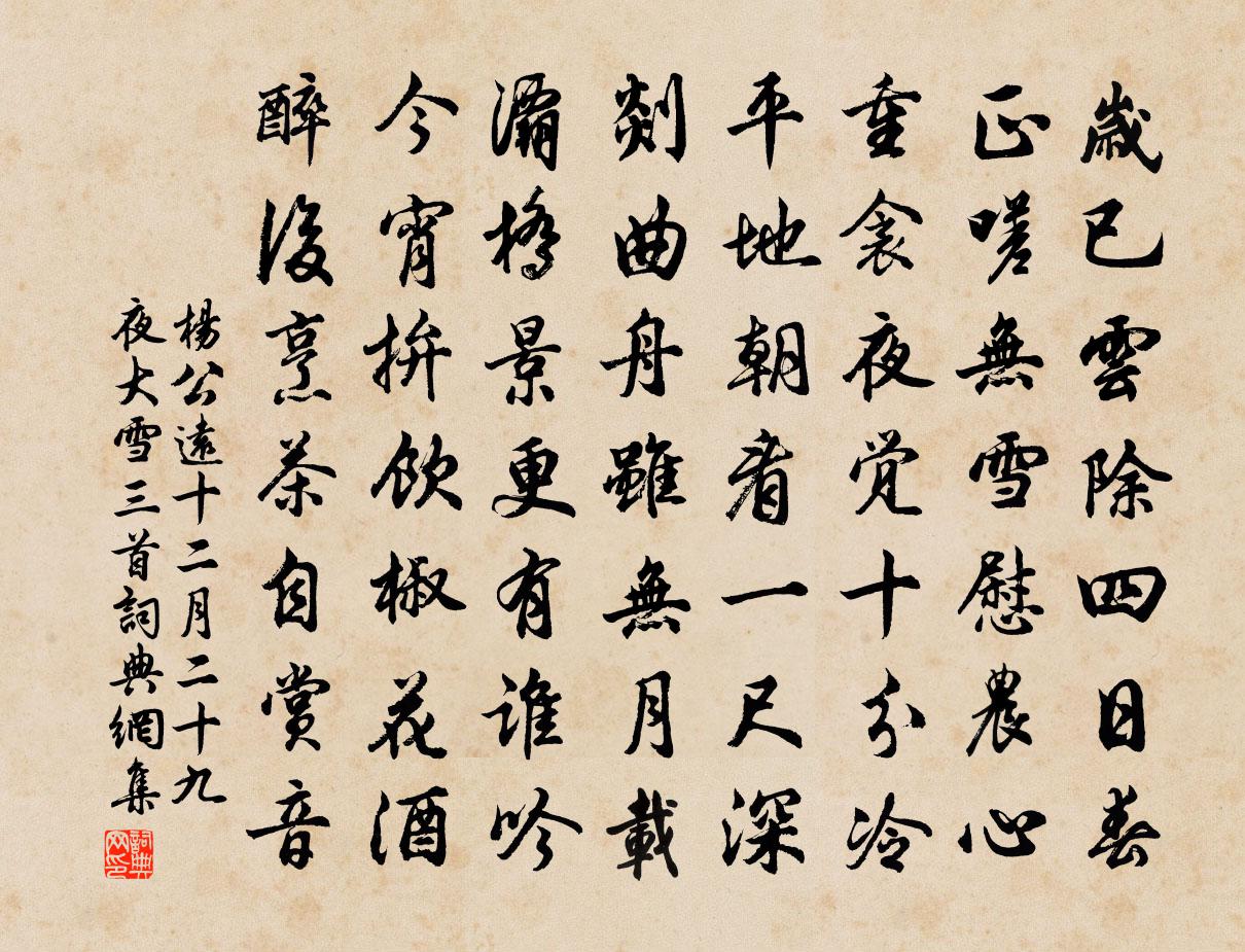 詩詞名句歷史字典書法欣賞書法字典國語詞典說文解字康熙字典古漢語字典標 題 作 者 詩 句 十二月二十九夜大雪三首作者:楊公遠 朝代:宋代十二月二十九夜大雪三首原文歲已雲除四日春,正嗟無雪慰農心。重衾夜覺十分冷,平地朝看一尺深。剡曲舟雖無月載,灞橋景更有誰吟。今宵拚飲椒花酒,醉後烹茶自賞音。詩詞問答問:十二月二十九夜大雪三首的作者是誰?答:楊公遠問:十二月二十九夜大雪三首寫於哪個朝代?答:宋代楊公遠十二月二十九夜大雪三首書法欣賞十二月二十九夜大雪三首書法作品詩詞推薦謝楊東川寄衣服白居易〔唐代〕年年衰老交遊少,處處蕭條書信稀。唯有巢兄不相忘,春茶未斷寄秋衣。春日雜書八首張耒〔宋代〕浮名一蹭蹬,萬事付莽鹵。惟余田園心,尚欲學老圃。空庭春雪盡,平地灌膏乳。買花門前翁,栽插粲可數。種之再至汝陰三絕歐陽修〔宋代〕黃栗留鳴桑葚美,紫櫻桃熟麥風涼。朱輪昔愧無遺愛,白首重來似故鄉。玩松竹二首白居易〔唐代〕龍蛇隱大澤,糜鹿游豐草。棲鳳安於梧,潛魚樂於藻。吾亦愛吾廬,廬中樂吾道。前松後修竹,偃臥可終老。各附探春慢(龜翁下世後登研意)吳文英〔宋代〕徑苔深,念斷無故人,輕敲幽戶。細草春回,目送流光一羽。重雲冷,哀雁斷,翠微空,愁蝶舞。盪鳴澌,游蓬小雪後陸游〔宋代〕雨解平檐雪,風收際海雲。根蘇萱出土,冰斷水生紋。游舫家家葺,行歌巷巷聞。太平元有象,端為謝東君。槜李道中二首周文璞〔宋代〕臥龍山下聽吟松,細雨清明似夢中。柳蔭朱欄三百尺,渴烏猶自泣春風。和吳沖卿學士石屏梅堯臣〔宋代〕吳夫,佩銀龜。乘天馬,索怪奇。忽得虢略一片石,其中白色圓如規。又有樹與烏,畫手雖妙何能為。吳乃持問歐樵歌三首鄭起〔宋代〕入城不識公與卿,行歌道上旁無人。衣衫藍樓鶉百結,與妻索笑妻生嗔,那知不是朱買臣。詠史上宣帝陳普〔宋代〕使民澒澒哭韓楊,郡國紛紛上鳳凰。太子好儒幾坐廢,王陽何用苦談王。散花注重晚泊陳造〔宋代〕略眼毛山夾,枯涸不可留。風帆劈箭去,遼少吹一漚。長年面死灰,死爭如赴仇。一飯六十里,幸泊散花洲。呼婦題宣風驛阮閱〔宋代〕淺淺瀘瀟水,粼粼碧玉光。馬蹄飛電疾,突過板橋霜。瓊姬曲白玉蟾〔宋代〕深深芙蓉城,鳳笛聲何長。綽約六銖衣,雲中弄明鐺。瓊姿夜月暖,玉唾春風香。去去勞悵想,峽猿嘯高唐。詫嗟吟邵雍〔宋代〕昨日炙手,今日張羅。人間常事,何詫何嗟。臥羊山鄭士懿〔宋代〕見羊疑是已叱石,見石翻疑未叱羊。非石非羊何所見,這些意思難商量。自道場山至何山讀故人洪舜俞內翰詩刻追和程公許〔宋代〕褊性不諧俗,泛梗歸無家。故人右扶風,雙旌擁崇牙。款門及暇日,褰裳躡飛霞。維南古道場,諸天集毗耶。巍撐華勝寺題壁翁蒙之〔宋代〕高閣登臨佛國春,逍遙聊復話前因。老來白來漸欲近,興到青山相與新。擾擾簿書拋舊夢,迢迢鐘磬著閒身。笑他贈風鑒曹老眼方逢辰〔宋代〕九重拊髀嘆才難,幣聘皇皇難未戡。老眼試尋天下看,豈無頗牧在東南。淮陰阻雨張耒〔宋代〕檣竿桃日日春風桃轉,渺渺桃孤舟數家桃縣。朝來雨暗隔淮村,白浪卷沙吹斷岸。渡頭楊柳濕青青,橋下涓涓野水送僧方及南謁柳員外劉禹錫〔唐代〕昔事廬山遠,精舍虎溪東。朝陽照瀑水,樓閣虹霓中。騁望羨游雲,振衣若秋蓬。舊房閉松月,遠思吟江風。古寺名句推薦閒門向山路,深柳讀書堂。劉昚虛《闕題》 粗繒大布裹生涯,腹有詩書氣自華。蘇軾《和董傳留別》 寡助之至,親戚畔之;多助之至,天下順之。孟子《孟子·公孫丑章句下·第一節》 湘江兩岸花木深,美人不見愁人心。盧仝《有所思》 紫泉宮殿鎖煙霞,欲取蕪城作帝家。李商隱《隋宮》 不虛美,不隱惡司馬光《資治通鑑·唐紀·唐紀十三》 山桃紅花滿上頭,蜀江春水拍山流。劉禹錫《竹枝詞·山桃紅花滿上頭》 胡蝶夢中家萬里,子規枝上月三更。崔塗《春夕》 落日無人松徑里,鬼火高低明滅。薩都剌《念奴嬌·登石頭城次東坡韻》 爭奈愁來,一日卻為長賀鑄《行路難·縛虎手》