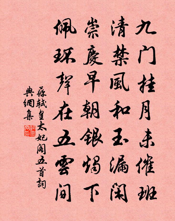 詩詞名句歷史字典書法欣賞書法字典國語詞典說文解字康熙字典古漢語字典標 題 作 者 詩 句 皇太妃閣五首作者:蘇軾 朝代:宋代皇太妃閣五首原文九門掛月未催班,清禁風和玉漏閒。崇慶早朝銀燭下,佩環聲在五雲間。詩詞問答問:皇太妃閣五首的作者是誰?答:蘇軾問:皇太妃閣五首寫於哪個朝代?答:宋代問:蘇軾的名句有哪些?答:蘇軾名句大全蘇軾皇太妃閣五首書法欣賞皇太妃閣五首書法作品詩詞推薦鵲丁謂〔宋代〕匣照光芒里,熏爐想像間。營巢登大歲,采粟上仙山。玉璞驚心起,星河盡力還。上林無限樹,枯卉莫登攀。嘲丁大全林桂龍〔宋代〕一舵中流欠把持,偏輕偏重失便宜。孤舟不是無人渡,身作風波問阿誰。鸚鵡曲 赤壁懷古馮子振〔元代〕茅廬諸葛親曾住。早賺出抱膝梁父。笑談間漢鼎三分,不記得南陽耕雨。嘆西風卷盡豪華,往事大江東去。徹如今和戴石屏王伯大〔宋代〕叫得神膽力,挽回天地心。連朝被甘澤,既雨積重有。水滿田高下,涼生秋淺深。老癃幸無死,一飽慶從今。臨江仙(將孫生日賦)劉辰翁〔宋代〕二十年前此日,女兄慶我生兒。簪萱弄彩聽孫啼。典衣沽美酒,數待冠昏時。亂後飄零獨在,紫荊墓棘風吹。尊前西江月高道寬〔元代〕混沌屯蒙如卵,昏昏默默盈空。浩然太素抱鴻蒙。一氣循環凝重。內隱真水真火,氤氳盤結如冰。中心元始造玄功謝曾子長分餉臨江軍黃雀晁公溯〔宋代〕遠遊旅食荒山里,竹鼠山雞污刀幾。鳴鞭走送來扣門,眼明忽見銜環子。江南今秋禾黍熟,場間啄穗驚不起。正緣夢遊洛中十首蔡襄〔宋代〕天際烏雲含雨重,樓前紅日照山明。嵩陽居士今安否,青眼看人萬里情。白雞謝靜講師釋居簡〔宋代〕素羽剪零雲,冠裁辰錦新。德如潮有信,雄壓牝無晨。物化寤非蝶,蟻酣驚代鄰。莫教風雨暝,緘口卻羞人。和沈守持要觀潮閣留題陳傅良〔宋代〕畢生欲賦觀潮閣,立盡斜陽倦復還。一日江山蒙筆力,百年名字滿人寰。郡從晉宋風流後,詩到蘇黃伯仲間。向去奉和杜相公移長興宅,奉呈元相公錢起〔唐代〕守貴常思儉,平津此意深。能卑丞相宅,何謝故人心。種蕙初抽帶,移篁不改陰。院梅朝助鼎,池鳳夕歸林。覺路將別歷下二首一晁補之〔宋代〕來見紅蕖隘渚香,歸塗未變柳梢黃。殷勤趵突溪中水,相送扁舟向汶陽。題米元暉畫王冕〔元代〕我生正坐山水癖,展卷見山如蜜甜。古樹含煙黑個個,遠山落日見尖尖。險絕豈惟遊子慮,清幽足慰老夫潛。行路題李公麟山莊圖其十延華洞蘇轍〔宋代〕共恨春不長,逡巡就搖落。一見洞中天,真知世間惡。金縷曲 送茅山道人,並寄山中諸道友張之翰〔元代〕回首茅山路。渺滔滔、長江南畔,碧山無數。曾被天風吹醉夢,直到華陽深處。也親見、鸞驂鶴馭。覺後分明空記與微之唱和,來去常以竹筒貯詩,陳協律美而白居易〔唐代〕揀得琅玕截作筒,緘題章句寫心胸。隨風每喜飛如鳥,渡水常憂化作龍。粉節堅如太守信,霜筠冷稱大夫容。煩君煙霞洞董嗣杲〔宋代〕萬色無如疊翠何,何僧鐫像屹嵯峨。山屏晴掩牌門杳,風鑰陰封梵屋多。象落鼻形懸洞右,佛垂手跡寄岩阿。燈輝郡齋水閣閒書蓮子文同〔宋代〕綠實填房未滿,黃茸繞殼方開。為問因誰勸酒,一時齊側金杯。送昌上座歸成都黃庭堅〔宋代〕昭學堂中有道人,龍吟虎嘯隨風雲。雨花經席冷如鐵,一縢日轉十二輪。寶勝蓬蒿荒小院,埋沒醯羅三隻眼。個是沁園春 賦鶴奴,次馬明初韻許有壬〔元代〕頂有丹砂, 服具玄明,雲胡作奴。想風霜搏擊,不如一鶚,雲霄變*名句推薦商人重利輕別離,前月浮梁買茶去。白居易《琵琶行 / 琵琶引》 東風兮東風,為我吹行雲使西來。李白《久別離》 池上柳依依,柳邊人掩扉。左緯《春晚》 十年種木,一年種穀,都付兒童。元好問《人月圓·重岡已隔紅塵斷》 博觀而約取,厚積而薄發蘇軾《稼說送張琥》 盡道隋亡為此河,至今千里賴通波。皮日休《汴河懷古二首》 夫兵權者,是三軍之司命,主將之威勢。諸葛亮《將苑·卷一·兵權》 枕中雲氣千峰近,床底松聲萬壑哀。曾公亮《宿甘露寺僧舍》 山川蕭條極邊土,胡騎憑陵雜風雨。高適《燕歌行》 抽刀斷水水更流,舉杯銷愁愁更愁。李白《宣州謝朓樓餞別校書叔雲 / 陪侍御叔華登樓歌》