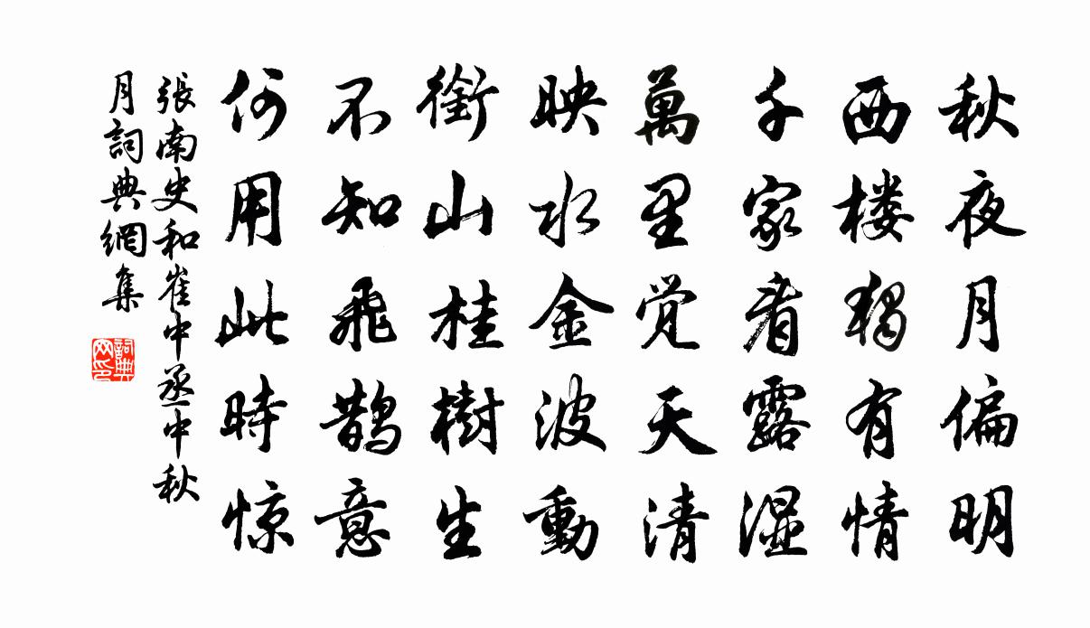 詩詞名句歷史字典書法欣賞書法字典國語詞典說文解字康熙字典古漢語字典標 題 作 者 詩 句 和崔中丞中秋月作者:張南史 朝代:唐代和崔中丞中秋月原文秋夜月偏明,西樓獨有情。千家看露濕,萬里覺天清。映水金波動,銜山桂樹生。不知飛鵲意,何用此時驚。詩詞問答問:和崔中丞中秋月的作者是誰?答:張南史問:和崔中丞中秋月寫於哪個朝代?答:唐代問:和崔中丞中秋月是什麼體裁?答:五律張南史和崔中丞中秋月書法欣賞和崔中丞中秋月書法作品注釋全唐詩:卷296_9詩詞推薦點絳唇曹組〔宋代〕小小朱橋,柳邊人過橫塘路。細風時度。□浪痕痕去。草軟沙平,穩襯尋幽步。□□處。亂紅飛舞。回首春城暮。宿山寺雪夜寄吉中孚李端〔唐代〕獨愛僧房竹,春來長到池。雲遮皆晃朗,雪壓半低垂。不見侵山葉,空聞拂地枝。鄙夫今夜興,唯有子猷知。句丁謂〔宋代〕物華如陣筆如鋒,沈射曹劉是七雄。滿江紅(雨後攜家游西湖,荷花盛開)陳三聘〔宋代〕紺谷浮空,山擁髻、晚來風急。吹驟雨、藕花千柄,艷妝新浥。窺鑒粉光猶有淚,凌波羅襪何曾濕。訝漢宮、朝罷朝中措張掄〔宋代〕慕名人似蟻貪膻。擾擾幾時閒。輸我吳松江上,一帆點破晴煙。青莎臥月,紅鱗薦酒,一醉陶然。此是人間蓬島,西掖省即事岑參〔唐代〕西掖重雲開曙暉,北山疏雨點朝衣。千門柳色連青瑣,三殿花香入紫微。平明端笏陪鵷列,薄暮垂鞭信馬歸。官拙贈李熊先輩二首強至〔宋代〕崷崒閩人秀,夫君得最完。文章醇不雜,氣質渾無刓。場屋聞新詔,鄉閭正素冠。天應老賢業,頭角壯年蟠。再次前韻蘇頌〔宋代〕巋然華屋四開扉,經構初憑佛大威。最是一州孤絕處,不因嘉客到應稀。凌虛自覺雲梯近,銷暑聊將玉盞飛。人士句韓維〔宋代〕兩君曠度皆吾黨,紅燭迎舟盡醉還。謝曾迪功松皮冠晁說之〔宋代〕松皮冠贈松山客,慚愧紅塵赤日中。好向浮雲傍歸路,定應剩聽入琴風。西湖觀新出鵝兒道損持國曼叔請予賦之梅堯臣〔宋代〕春菢畏雷後,{彀弓下卵}開形已完。嫩毛輕染櫱,小掌未全丹。見物初能啑,浮波尚怕寒。山陰無道士,更長換送江東集與王謙仲樞使,樞使和至後睡覺一首王藺〔宋代〕池塘春夢草初生,江左詩來得我驚。開秩快觀醒倦眼,挑燈細讀度寒更。追參李杜今無敵,揮斥侯劉獨有聲。一首雲封庵徐凝〔唐代〕登岩背山河,立石秋風裡。隱見浙江濤,一尺東溝水。頌古三十二首釋明辯〔宋代〕試問人間有底忙,好將春事報春光。直饒日日花前醉,一季都來九十場。哀郢陸游〔宋代〕遠接商周祚最長,北盟齊晉勢爭強。章華歌舞終蕭瑟,雲夢風煙舊莽蒼。草合故宮惟雁起,盜穿荒冢有狐藏。離騷聞子京拜掃後周視田廬因問有可為歸計者二首宋庠〔宋代〕耕疇喬木許西偏,嵩潁相望似有緣。更問具茨南復北,那邊堪作種芝田。廢烽台韓維〔宋代〕耆老不可問,高台荊棘間。一時戎馬散,千古暮鴉還。事往孤鴻斷,人來落照閒。興亡無限恨,慘澹對河關。句李兌〔宋代〕高鳥翔雲外。過梅里七首家…今敝廬數堵猶存今列題於後。翡翠塢李紳〔唐代〕翡翠飛飛繞蓮塢,一啄嘉魚一鳴舞。蓮莖觸散蓮葉欹,露滴珠光似還浦。虞人掠水輕浮弋,翡翠驚飛飛不息。直上薛公肅訪山中偶出不值公肅留詩次其韻李流謙〔宋代〕紫極朝歸謝往還,新篇落筆爛彪斑。烏藤拈起都閒事,且看西湖處處山。名句推薦鴻雁不堪愁里聽,雲山況是客中過。李頎《送魏萬之京》 有其言,無其行,君子恥之戴聖《禮記·雜記下》 夔府孤城落日斜,每依北斗望京華。杜甫《秋興八首》 又疑瑤台鏡,飛在青雲端。李白《古朗月行》 丈夫一言許人,千金不易。司馬光《資治通鑑·唐紀二》 道人善,即是善。人知之,愈思勉。李毓秀《弟子規·泛愛眾》 今日清明節,園林勝事偏。賈島《清明日園林寄友人》 彼此當年少,莫負好時光。李隆基《好時光·寶髻偏宜宮樣》 嘶馬搖鞭何處去?曉禽霜滿樹。牛希濟《謁金門·秋已暮》 獨樹沙邊人跡稀,欲行愁遠暮鍾時韋應物《賦得沙際路送從叔象》