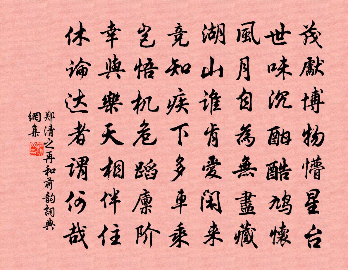 詩詞名句歷史字典書法欣賞書法字典國語詞典說文解字康熙字典古漢語字典標 題 作 者 詩 句 再和前韻作者:鄭清之 朝代:宋代再和前韻原文茂先博物懵星台,世味沉酣酷鳩懷。風月自為無盡藏,湖山誰肯愛閒來。競知疾下多車乘,豈悟機危蹈廩階。幸與樂天相伴住,休論達者謂何哉。詩詞問答問:再和前韻的作者是誰?答:鄭清之問:再和前韻寫於哪個朝代?答:宋代鄭清之再和前韻書法欣賞再和前韻書法作品詩詞推薦勝勝慢/聲聲慢李商英〔宋代〕笙簧繚繞,書鼓聲喧,佳人對舞繡簾前。高卷鋪襯,廣列華筵。人人獻香祝壽,捧流霞,永慶高年。名香爇,睹重訪李卿不遇錢起〔唐代〕畫戟朱樓映晚霞,高梧寒柳度飛鴉。門前不見歸軒至,城上愁看落日斜。山亭三首李石〔宋代〕小圃依山入,危亭隱磴斜。林塘掃寒雨,籬落臥疏花。處士七松宅,先生五柳家。柴門何所待,倚杖數昏鴉。【越調】鬥鵪鶉 元宵佚名〔元代〕聖主寬仁,堯民盡喜。一統華夷,諸邦進禮。雨順風調,時豐歲麗。元夜值,風景奇。鬧穰穰的迓鼓喧天,明晃晃和劉山居見惠之什姚勉〔宋代〕久矣蓴鱸欲趁歸,自知花樣不隨時。岩張欲保君心泰,英竦終嫌聖德詩。榮辱不知欣我在,怨尤俱泯恃天知。達官賦得金莖露徐敞〔唐代〕武帝貴長生,延年餌玉英。銅盤貯珠露,仙掌抗金莖。拂曙氛埃斂,凌空沆瀣清。岧嶢捧瑞氣,巃嵸出宮城。勢入雜詩絕句十七首梅堯臣〔宋代〕青蠅何處來,聚集滿盤間。誰知腹中物,變化如循環。除夜野宿常州城外二首蘇軾〔宋代〕行歌野哭兩堪悲,遠火低星漸向微。病眼不眠非守歲,鄉音無伴苦思歸。重衾腳冷知霜重,新沐頭輕感發稀。多謝陪裴使君登岳陽樓杜甫〔唐代〕湖闊兼雲霧,樓孤屬晚晴。禮加徐孺子,詩接謝宣城。雪岸叢梅發,春泥百草生。敢違漁父問,從此更南征。和陶詠貧士七首吳芾〔宋代〕新春來未幾,已見日在婁。遊人怕春去,把酒急獻酬。折花各盈把,行歌滿道周。貧者壁四立,若不堪其憂。亦復十一月四日雪中小飲是月十日冬至趙汝鐩〔宋代〕書雲猶七日,陰極剛未長。風吹六花開,飛舞隘穹壤。一陽方欲來,和氣已摩盪。著地寂不聲,入林發餘響。與客辛丑除日寄子瞻蘇轍〔宋代〕一歲不復居,一日安足惜。人心畏增年,對酒語終夕。夜長書室幽,燈燭明照席。盤飧雜梁楚,羊炙錯魚臘。庖人梁武修懺圖劉克莊〔宋代〕紫袍臨蜀殿,黃屋建梁台。異世為鵑去,前身作蚓來。庚申七月自桂歸資壽作李曾伯〔宋代〕三載煙嵐在嶺陬,幾番清夢到松楸。每憐老子身關塞,長憶童時某水丘。今得歸來訪漁隱,不妨高臥老菟裘。據鞍簾陸暢〔唐代〕勞將素手卷蝦須,瓊室流光更綴珠。玉漏報來過半夜,可憐潘岳立踟躕。進讀唐鑒徹章謝恩唐律一首二十韻劉克莊〔宋代〕勛華嗟已遠,最近莫如唐。祖禹忠於宋,雲周監有商。雖然張萬目,終未立三綱。貞觀初勤恤,開元未怠荒。錄忘和蘆洲劉子泉秋懷葛起耕〔宋代〕雨送秋歸雁帶霜,凝情無處寄詩狂。一庭莎草蛩吟老,萬里梅花鶴夢長。德誼可踰鐘鼎貴,聖賢不死簡編香。邇來答龐龍圖塞下秋意宋祁〔宋代〕故人握節遠屯邊,三見寒飈折塞綿。俎豆何妨學軍旅,兜鍪遂欲出貂蟬。酒酣帳下摐金夕,雪灑軍中蹋鞠天。不惜題城南書院三十四詠張栻〔宋代〕秋後冬前一月晴,小園佳處日經行。半山木落樓台露,幾樹霜余橘柚明。笠澤亭劉嘉謨〔宋代〕荷笠扁舟上,持綸巨澤中。無勞問名字,便是此亭公。名句推薦愛棄發之費,而忘長發之利,不知權者也。韓非及後人《韓非子·六反》 大道之行也,天下為公。戴聖《禮記·禮運》 平生不做皺眉事,世上應無切齒人。佚名《增廣賢文·上集》 李白能詩復能酒,我今百杯復千首。唐寅《把酒對月歌》 朱弦已為佳人絕,青眼聊因美酒橫。黃庭堅《登快閣》 人生有情淚沾臆,江水江花豈終極!杜甫《哀江頭》 佯愛人,不得復憎也;佯憎人,不得復愛也。韓非及後人《韓非子·外儲說右下》 波漂菰米沉雲黑,露冷蓮房墜粉紅杜甫《秋興八首》 三冬暫就儒生學,千耦還從父老耕。陸游《觀村童戲溪上》 興亡千古繁華夢,詩眼倦天涯。張可久《人月圓·山中書事》