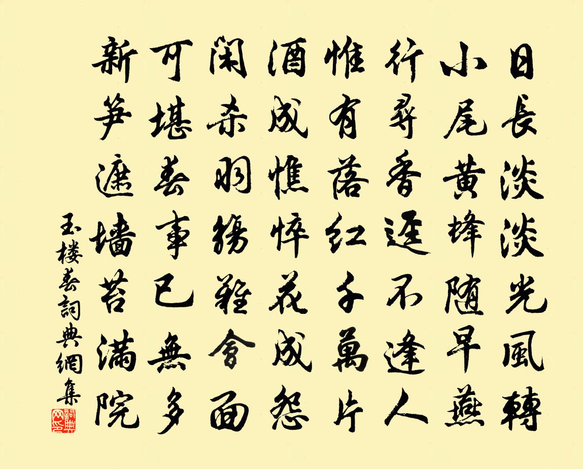 日長淡淡光風轉。小尾黃蜂隨早燕。行尋香逕不逢人,惟有落紅千萬片。