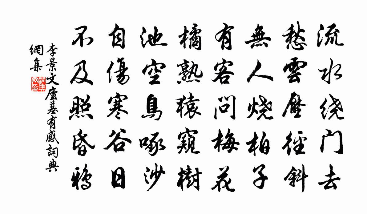 詩詞名句歷史字典書法欣賞書法字典國語詞典說文解字康熙字典古漢語字典標 題 作 者 詩 句 廬墓有感作者:李景文 朝代:宋代廬墓有感原文流水繞門去,愁雲壓徑斜。無人燒柏子,有客問梅花。橘熟猿窺樹,池空鳥啄沙。自傷寒穀日,不及照昏鴉。詩詞問答問:廬墓有感的作者是誰?答:李景文問:廬墓有感寫於哪個朝代?答:宋代李景文廬墓有感書法欣賞廬墓有感書法作品詩詞推薦和鄭康道探梅十絕句李洪〔宋代〕學詩少日賦梅花,詩老忘言借齒牙。媟語淫言漫元白,單傳衣缽勿矜誇。贈陳先生三首白玉蟾〔宋代〕木人手裡揮泥劍,石女頭邊帶鐵花。龍漢元年冬上巳,相逢一盞趙州茶。日本門上人請贊釋妙倫〔宋代〕須彌繞白日,碧落穿紅霞。喚作真則錯,喚作相則差。只此一門難摸索,賺他個失腳走天涯。效陶四首用葛秋岩韻釋文珦〔宋代〕坐石滋南風,幽抱和且衎。志唯在山水,身不關治亂。終曲遂忘言,舉目送飛翰。所得皆天真,初不加習玩。胡講書赴張國錄講席之招良月也曾由基〔宋代〕初日融霜泮水清,鵠袍翔集宿中庭。先生有道如陽月,太白占祥聚德星。安定重來闡湖學,渠水端坐講西銘。自憐喜??公自武陵至齊己〔唐代〕已盡滄浪興,還思相楚行。鬢全無舊黑,詩別有新清。暫憩臨寒水,時來扣靜荊。囊中有靈藥,終不獻公卿。山東蘭若遇靜公夜歸唐求〔唐代〕松門一徑微,苔滑往來稀。半夜聞鍾後,渾身帶雪歸。問寒僧接杖,辨語犬銜衣。又是安禪去,呼童閉竹扉。題畫卷五首范成大〔宋代〕欹傾棧路繞山明,隔隴人家犬吠聲。無限白雲堆去路,不知誰識許宣平。過鳳隱山王炎〔宋代〕落日孤村靜,青松一徑斜。問程愁客路,托宿到僧家。香鼎生雲穗,茶甌涌雪花。胸襟添道氣,隱几息喧譁。離蘇州回寄太守袁起岩郎中張鎡〔宋代〕吳中佳地舊長洲,來往空回信宿留。泰伯廟存那暇問,麗姓鄉近未曾游。詩翁燕坐迎香閣,閒客歸乘釣月舟。想見宮詞王仲修〔宋代〕四輔論思政事堂,盡收才傑置周行。掖庭職事分司局,銓擇畢由紫極房。感皇恩賀鑄〔宋代〕歌笑見余妍,情生眄睞。擁髻揚蛾黛。多態。小花深院,漏促離襟將解。惱人紅蠟淚。啼相對。芳草喚愁,愁來難宿齋太一宮即事五首宋庠〔宋代〕宮垣寶勢壓靈鰲,窈窱齋房宿幕高。倦枕不知秋已至,商音半夜入雲璈。赴任南康將經九江游二林先寄交代關屯田祖無擇〔宋代〕平生山不有心期,今得軍麾慰所思。我欲因行訪蓮社,君應未訝過瓜時。若逢勝概終朝住,兼領閒僧到外隨。莫遺古絕句佚名〔兩漢〕日暮秋雲陰,江水清且深。何用通音信,蓮花玳瑁簪。攜得秘監詩一編登舟因成二絕張鎡〔宋代〕今日何曾獨自來,船中相伴有誠齋。須知不局詩編里,妙用方能處處皆。出定力院作王安石〔宋代〕江上悠悠不見人,十年塵垢夢中身。殷懃為解丁香結,放出枝間自在春。雜言送王無咎及第後授江都尉先歸建昌梅堯臣〔宋代〕白袍來,黃綬回。來跨騫驢回跨馬,麻源三谷桂花開。江都作尉入風埃,主人劉向西京才。心如明月無不照,恐君對雨杜甫〔唐代〕莽莽天涯雨,江邊獨立時。不愁巴道路,恐濕漢旌旗。雪嶺防秋急,繩橋戰勝遲。西戎甥舅禮,未敢背恩私。越中言事二首(鹹通八年琅琊公到任後作)方乾〔唐代〕異術閒和合聖明,湖光浩氣共澄清。郭中雲吐啼猿寺,山上花藏調角城。香起荷灣停棹飲,絲垂柳陌約鞭行。遊人名句推薦沅有芷兮澧有蘭,思公子兮未敢言。屈原《九歌·湘夫人》 喃喃教言語,一一刷毛衣。白居易《燕詩示劉叟》 靄芳陰未解,乍天氣、過元宵。周端臣《木蘭花慢·送人之官九華》 鳳簫聲斷月明中,舉手謝、時人慾去。蘇軾《鵲橋仙·七夕送陳令舉》 盪而失水,螻蟻得意焉。韓非及後人《韓非子·說林下》 夕陽西下,斷腸人在天涯。馬致遠《天淨沙·秋思》 金風玉露一相逢,便勝卻人間無數。秦觀《鵲橋仙·纖雲弄巧》 長恨春歸無覓處,不知轉入此中來。白居易《大林寺桃花》 命里無時,求之不來。馮夢龍《醒世恆言·卷十八》 三杯吐然諾,五嶽倒為輕。李白《俠客行》