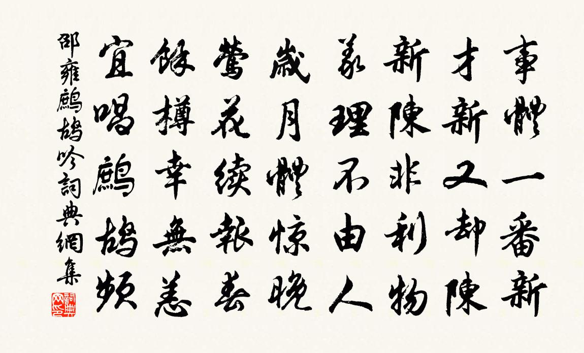 詩詞名句歷史字典書法欣賞書法字典國語詞典說文解字康熙字典古漢語字典標 題 作 者 詩 句 鷓鴣吟作者:邵雍 朝代:宋代鷓鴣吟原文事體一番新,才新又卻陳。新陳非利物,義理不由人。歲月體驚晚,鶯花續報春。余樽幸無恙,宜唱鷓鴣頻。詩詞問答問:鷓鴣吟的作者是誰?答:邵雍問:鷓鴣吟寫於哪個朝代?答:宋代邵雍鷓鴣吟書法欣賞鷓鴣吟書法作品詩詞推薦偈頌十九首釋紹曇〔宋代〕宮花壓鬢墜烏雲,傾國風流宛勝秦。玉笛插 * 不見,夜深吹起鳳樓春。竹枝歌孫嵩〔宋代〕灩澦灘頭君莫行,瞿塘峽里不論程。龍吟小雨蜀天黑,等有明朝春水生。送虞提宮李流謙〔宋代〕桃花未落春水生,百川合流如鏡平。江神約束蛟與鱷,東閣郎君將母行。一帆萬里無荊越,非霧非煙鎖雙闕。只今蜀道汪元量〔宋代〕蜀道難行高接天,秦關勒馬望西川。峨眉崒嵂知何處,劍閣崔巍若箇邊。重九與子通游虎丘謁祖印大師三首朱長文〔唐代〕絕境良辰少兩全,支筇莫倦到山巔。清談已可忘樽俎,真樂何勞聽管弦。才子就題黃絹語,高僧多諷碧雲篇。孤舟安樂窩示元德第二首裘萬頃〔宋代〕清泉出石竇,白雲臥山窩。淋淫乍開霽,原野歡聲多。吾廬近西峰,其下林婆娑。解衣坐磐石,持竿釣清波。主人題張季良適性齋傅察〔宋代〕揚雄家無儋石儲,閉門作賦擬相如。鄴侯插架多異書,牙籤萬軸吞石渠。吾友張子斯人徒,嗜好酸鹹與眾殊。被褐哭柏岩禪師李益〔唐代〕遍與傍人別,臨終盡不愁。影堂誰為掃,坐塔自看修。白日鍾邊晚,青苔缽上秋。天涯禪弟子,空到柏岩游。次韻晁元忠西歸十首黃庭堅〔宋代〕人言貧在家,殊勝富作客。雞棲牛羊下,君子亦安息。千里求明師,贏糧從事役。學問非物外,室虛生純白。沁園春劉氏〔宋代〕我生不辰,逢此百罹,況乎亂離。奈惡因緣到,不夫不主,被擒捉去。為妾為妻。父母公姑,弟兄姐妹,流落不知北湖水月王橚〔宋代〕奩鏡平開碧四圍,百重山里亦希奇。寫成萬古空明趣,只為中秋一首詩。冬至宿齋時郡君南內朝謁因寄權德輿〔唐代〕清齋獨向丘園拜,盛服想君興慶朝。明日一陽生百福,不辭相望阻寒宵。懷黽池寄子瞻兄蘇轍〔宋代〕相攜話別鄭原上,共道長途怕雪泥。歸騎還尋大梁陌,行人已度古崤西。曾為縣吏民知否?舊宿僧房壁共題。遙想題汪表叔對袁府起借軒和韻陳宗遠〔宋代〕朱門虛老濟川材,鏡面芙蕖取次開。莫怪偷光鄰士壁,絕勝附火乞兒堆。拂塵尚欠千尋竹,極目何須百尺台。魚鱉醉歸陸游〔宋代〕夜分飲散酒家壚,歸路迢迢月滿湖。小豎竊言翁未醉,入門猶記露菖蒲。送客往夏州楊凝〔唐代〕憐君此去過居延,古塞黃雲共渺然。沙闊獨行尋馬跡,路迷遙指戍樓煙。夜投孤店愁吹笛,朝望行塵避控弦。聞有甘州(寄李筠房)張炎〔宋代〕望涓涓、一水隱芙蓉,幾被暮雲遮。正憑高送目,西風斷雁,殘月平沙。未覺丹楓盡老,搖落已堪嗟。無避秋聲處依韻和孫之翰對雪范仲淹〔宋代〕江乾往往臘不雪,今喜紛紛才孟冬。乃知王澤寢及遠,益明天意先在農。有年預可慰四海,大瑞且當聞九重。況此戊申年七夕五絕薛映〔宋代〕月放冰輪傍絳河,丁期寶婺夜經過。嫦娥不惜宮中桂,乞與天香分外多。頌古十一首釋鹹傑〔宋代〕天高地厚人難見,海闊山遙只自知。勘破卻回休借部,得便宜是落便宜。名句推薦流水落花春去也,天上人間。李煜《浪淘沙令·簾外雨潺潺》 風光人不覺,已著後園梅。史青《應詔賦得除夜》 兄弟不睦,則子侄不愛顏之推《顏氏家訓·兄弟篇》 所向泥活活,思君令人瘦。杜甫《九日寄岑參》 天油然作雲,沛然下雨,則苗浡然興之矣。孟子《孟子·梁惠王章句上·第六節》 夜來南風起,小麥覆隴黃。白居易《觀刈麥》 水來土掩,兵到將迎。施耐庵《水滸傳·第二十回》 昨別今已春,鬢絲生幾縷。韋應物《長安遇馮著》 人言落日是天涯,望極天涯不見家。李覯《鄉思》 落日熔金,暮雲合璧,人在何處。李清照《永遇樂·落日熔金》