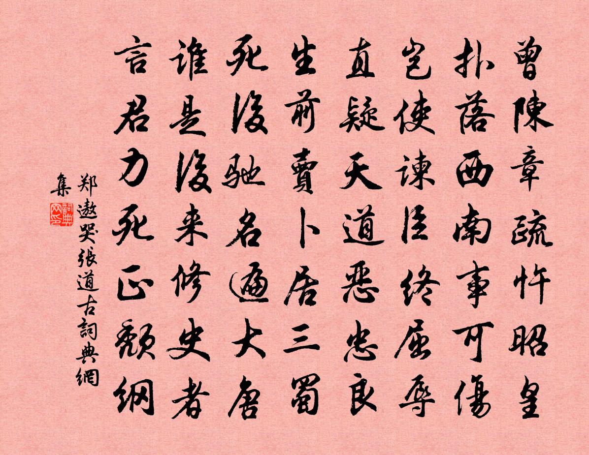 詩詞名句歷史字典書法欣賞書法字典國語詞典說文解字康熙字典古漢語字典標 題 作 者 詩 句 哭張道古作者:鄭遨 朝代:唐代哭張道古原文曾陳章疏忤昭皇,撲落西南事可傷。豈使諫臣終屈辱,直疑天道惡忠良。生前賣卜居三蜀,死後馳名遍大唐。誰是後來修史者,言君力死正頹綱。詩詞問答問:哭張道古的作者是誰?答:鄭遨問:哭張道古寫於哪個朝代?答:唐代問:哭張道古是什麼體裁?答:七律鄭遨哭張道古書法欣賞哭張道古書法作品注釋全唐詩:卷855-3詩詞推薦游清潭呂資益蟠谷絕漱玉劉過〔宋代〕帝所森瑞寂不喧,九關虎豹守天門。何人奏事含風殿,日晏鳴珂下紫垣。過淮三首贈景山兼寄子由蘇軾〔宋代〕過淮山漸好,松檜亦蒼然。靄靄藏孤寺,冷冷出細泉。故人真吏隱,小檻帶岩偏。卻望臨淮市,東風語笑傳。龍川道士蘇轍〔宋代〕昔我遷龍川,不見平生人。傾囊買破屋,風雨庇病身。頎然一道士,野鶴墮雞群。飛鳴閭巷中,稍與季子親。刺口潘上舍父輓詩許應龍〔宋代〕蘭玉賢關雋譽飛,詞場幾見捷音馳。登雲將慰椿庭望,陟岵俄驚薤露悲。榮養痛嗟今日隔,嘉封賴有異時追。前岡常棣佚名〔先秦〕常棣之華,鄂不韡韡。凡今之人,莫如兄弟。死喪之威,兄弟孔懷。原隰裒矣,兄弟求矣。脊令在原,兄弟急難。行住坐臥三十二頌釋印肅〔宋代〕眾生垢重汩塵緣,豈自收心同覺源。挈水拾薪時節至,三通鼓罷物皆鮮。贈朱遜之蘇軾〔宋代〕黃花候秋節,遠自夏小正。坤裳有正色,鞠衣亦令名。一從人偽勝,遂與天力爭。易姓寓非族,改顏隨所令。新奇漁父吳鎮〔元代〕舴艋為舟力幾多。江頭雲雨半相和。殷勤好,下長波。半夜潮生不那乙巳邵武建寧夜坐書呈諸公陳普〔宋代〕投燈飛燭未為愚,接跡紛紛是可誅。緣木得魚還有樣,便教焚卻孔明廬。角聲譚嗣同〔清代〕江漢夜滔滔,嚴城片月高。聲隨風咽鼓,淚雜酒沾袍。思婦勞人怨,長歌短劍豪。壯懷消不盡,馬首向臨洮。江西逢僧省文曹松〔唐代〕閩地高僧楚地逢,僧游蠻錫掛垂松。白雲逸性都無定,才出雙峰愛五峰。高僧不負雪峰期,卻伴青霞入翠微。百葉飲東窗一首蘇籀〔宋代〕丈夫蘊挾胸懷奇,浩然幅郁乾虹霓。俚蜺婉孌習和雅,竊笑胡為瓶井湄。奈何平世事蹇蹇,奇士矯犖矜云為。伏波村樂圖釋智愚〔宋代〕一年田地熟,賦外樂天真,便不打鼓笛,也是太平人。舞曲歌辭。吳俞兒舞歌。矛俞陸龜蒙〔唐代〕手盤風,頭背分,電光戰扇,欲刺敲心留半線。纏肩繞脰縖合,眩旋,卓植赴列,奪避中節。前沖函禮穴,上指孛次韻梅花絕句喻良能〔宋代〕玉裙練帨清無塵,一笑喚回幽谷春。天寒日暮故相惱,不怕近前丞相嗔。送杜起莘殿院出守遂寧陸游〔宋代〕羽檄聯翩晝夜馳,臣憂顧不在邊陲。軍容地密寧當議,陛下恩深不忍欺。白簡萬言幾慟哭,青編一傳可前知。平生蛙趙希邁〔宋代〕閒池草色青,蝌蚪自滋生。尚覺窺天小,何因妒月明。通宵成樂部,過雨雜棋聲。靜者心無役,從君取意鳴。滌愫鄭樵〔宋代〕孤鳳落鷹巢,啼麟墜虎穴。未能脫蒙茸,安得出軒凸。迢遞空自倬,耀靈久已滅。禔身入三門,黽勉成吾拙。周伯范棋會以足疾不赴走筆寄坐客樓鑰〔宋代〕里閭講棋社,大要率且真。豈惟簡苛禮,正欲聚首頻。向來賞花約,深恐負此春。春來顧多事,殆如參與辰。今朝沁園春李曾伯〔宋代〕麴生來言,素娥寄聲,偶閬苑游。問去年今夕,逢余桂嶺,前年今夕,見子菟裘。何事塵勞,啟人厭倦,痴兔老蟾名句推薦教亦多術矣,予不屑之教誨也者,是亦教誨之而已矣。孟子《孟子·告子章句下·第十六節》 漠漠水田飛白鷺,陰陰夏木囀黃鸝。王維《積雨輞川莊作 / 秋歸輞川莊作》 性孤高似柏,阿嬌金屋。陸容《滿江紅·詠竹》 今朝有酒今朝醉,莫管門前是與非。吳承恩《西遊記·第五回》 更被夕陽江岸上,斷腸煙柳一絲絲。韋莊《江外思鄉》 眼痛滅燈猶暗坐, 逆風吹浪打船聲。白居易《舟中讀元九詩》 留七分正經,以度生;留三分痴呆,以防死。陳繼儒《小窗幽記·集醒篇》 花時同醉破春愁,醉折花枝作酒籌。白居易《同李十一醉憶元九》 不種閒花,池亭畔、幾竿修竹。陸容《滿江紅·詠竹》 看風流慷慨,談笑過殘年辛棄疾《八聲甘州·故將軍飲罷夜歸來》