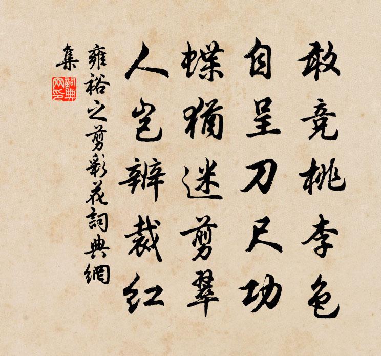 詩詞名句歷史字典書法欣賞書法字典國語詞典說文解字康熙字典古漢語字典標 題 作 者 詩 句 剪彩花作者:雍裕之 朝代:唐代剪彩花原文敢競桃李色,自呈刀尺功。蝶猶迷剪翠,人豈辨裁紅。詩詞問答問:剪彩花的作者是誰?答:雍裕之問:剪彩花寫於哪個朝代?答:唐代問:剪彩花是什麼體裁?答:五絕雍裕之剪彩花書法欣賞剪彩花書法作品注釋全唐詩:卷471-2詩詞推薦法雲寺陸游〔宋代〕不到法雲久,秋高初一來。廚供菰白美,池蘸水紅開。橋畔逢游衲,雲邊數過桅。同游恨歸早,珍重約尋梅。奉使契丹二十八首其二贈知雄州王崇拯二首蘇轍〔宋代〕城裡都無一寸閒,城頭野水四汗漫。與君但對湖光飲,久病偏須酒令寬。何氏溝塍布棋局,李君智略走珠盤。應存貞女引沈約〔南北朝〕貞女信無矯。傍鄰也見疑。輕生本非惜。賤軀良足悲。傳芳托嘉樹。弦歌寄好詞。栲栳山章潛〔宋代〕秀色團團如栲栳,孤高端可壓群山。藏雲蓄雨無蹤跡,怨鶴啼猿自往還。北窗喔詩因賦陸游〔宋代〕露下螢飛仲秋月,山圍水繞建安城。病多不辨酒中聖,身遠且令心太平。數卷蠹書行老矣,一盂蔬飯太憎生。白雲和虛齋勸農十詩鄭清之〔宋代〕暇日棋書六一翁,錦檣絲轡與春逢。年時豹尾車中望,山色有無知幾重。與成父別後有懷趙蕃〔宋代〕何物催衰白,頻年屢別離。弟兄俱老境,搖落況秋時。汝水應余憶,袁江獨爾思。不堪行似棘,更對雨如絲。送殷淑三首李白〔唐代〕海水不可解,連江夜為潮。俄然浦嶼闊,岸去酒船遙。惜別耐取醉,鳴榔且長謠。天明爾當去,應便有風飄。白鷺棲賢寺王士禎〔清代〕李渤讀書處,乃在棲賢谷。何年作招提,來尋愜幽獨。僧舍如蜂房,高下傅山麓。雲來漢陽峰,時就檐下宿。古寺紹興親享明堂二十六首佚名〔宋代〕噫神何親,惟德是輔。玉牲具陳,誠則來顧。我開明堂,遵國之故。尚蒙居歆,以篤宗祜。榴皮題壁葉三英〔宋代〕求仙那得仙來訪,多積陰功至有餘。欲悟東林沈東老,故留三十六玄書。普天樂·垂虹夜月徐再思〔元代〕玉華寒,冰壺凍。雲間玉兔,水面蒼龍。酒一樽,琴三弄。喚起凌波仙人夢,倚闌乾滿面天風。樓台遠近,乾坤表【仙呂】村里迓鼓 四季樂情佚名〔元代〕正值著麗人天氣,可正是賞花賞花的這時候。你看那花紅和這柳綠,繞著這舍南舍北、莊前莊後。則見那柳飛綿,溳川寺路張祜〔唐代〕日沉西澗陰,遠驅愁突兀。煙苔濕凝地,露竹光滴月。時見一僧來,腳邊雲勃勃。丹桂樓鑰〔宋代〕碧雲步障紫金蕤,風靜秋高千萬枝。嬌額塗黃元自好,是誰深傳密煙脂。賦花張籍〔唐代〕花,花。落早,開賒。對酒客,興詩家。能回遊騎,每駐行車。宛宛清風起,茸茸麗日斜。且願相留歡洽,惟愁虛同柯東海出湖陳宓〔宋代〕欲訪西湖久未晴,故應穿屐踏泥行。不因世事無時盡,那識波光有底清。翠竹碧蓮迷上下,雕欄畫閣壓崢嶸。扁舟客中於武陵〔唐代〕楚人歌竹枝,遊子淚沾衣。異國久為客,寒宵頻夢歸。一封書未返,千樹葉皆飛。南過洞庭水,更應訊息稀。拍欄趙汝鐩〔宋代〕偶把欄乾拍,沙鷗水上驚。晚紅殘照在,秋碧遠山橫。盡被浮名役,皆從妄念生。不如歸去好,杖屨老柴荊。山老吟孟郊〔唐代〕不行山下地,唯種山上田。腰斧斫旅松,手瓢汲家泉。詎知文字力,莫記日月遷。蟠木為我身,始得全天年。名句推薦儒者在本朝則美政,在下位則美俗。荀子《荀子·儒效》 壯別天涯未許愁,盡將離恨付東流李大釗《口占一絕(壯別天涯未許愁)》 寧為太平犬,莫作亂離人!馮夢龍《醒世恆言·卷三》 殘月臉邊明,別淚臨清曉牛希濟《生查子·春山煙欲收》 清談可以飽,夢想接無由。韓愈《洞庭湖阻風贈張十一署·時自陽山徙掾江陵》 槐葉初勻日氣涼,蔥蔥鼠耳翠成雙。范成大《夏日田園雜興》 不信妾斷腸,歸來看取明鏡前。李白《長相思·其二》 阿香秋夢起嬌啼,玉女傳幽素。吳文英《燭影搖紅·越上霖雨應禱》 浮生只合尊前老。雪滿長安道。舒亶《虞美人·寄公度》 紅粉佳人休使老,風流浪子莫教貧。佚名《增廣賢文·上集》