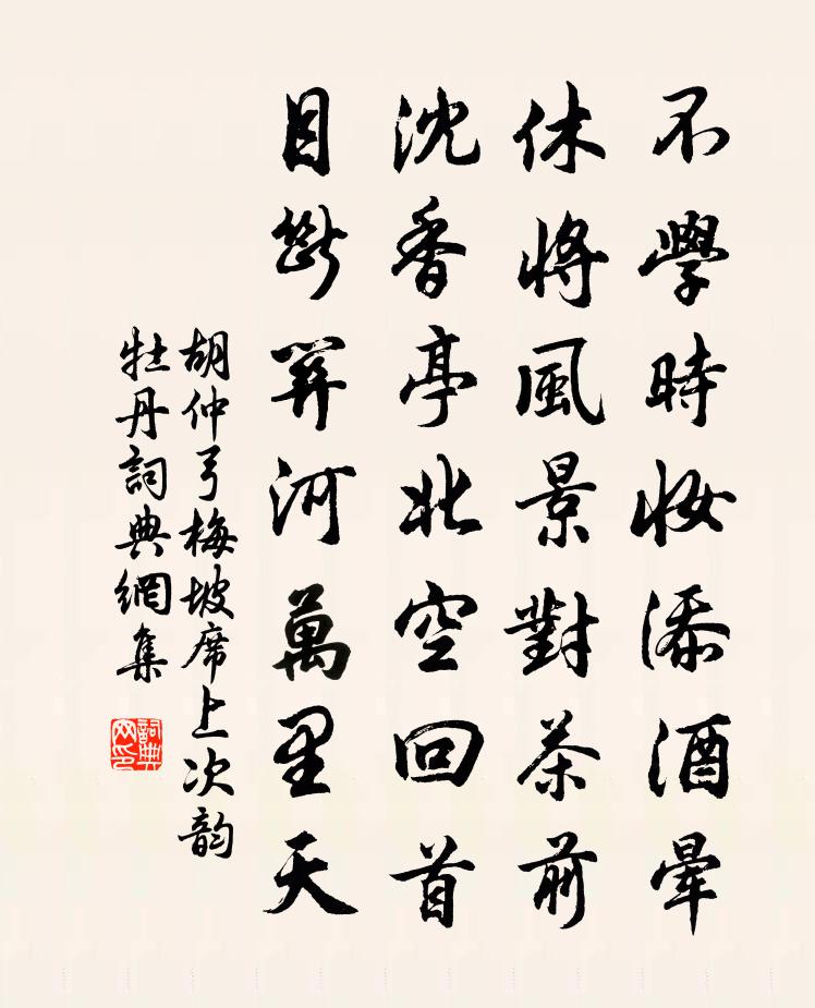 詩詞名句歷史字典書法欣賞書法字典國語詞典說文解字康熙字典古漢語字典標 題 作 者 詩 句 梅坡席上次韻牡丹作者:胡仲弓 朝代:宋代梅坡席上次韻牡丹原文不學時妝添酒暈,休將風景對茶前。沈香亭北空回首,目斷關河萬里天。詩詞問答問:梅坡席上次韻牡丹的作者是誰?答:胡仲弓問:梅坡席上次韻牡丹寫於哪個朝代?答:宋代胡仲弓梅坡席上次韻牡丹書法欣賞梅坡席上次韻牡丹書法作品詩詞推薦贈浙西顧推官徐鉉〔唐代〕盛府賓寮八十餘,閉門高臥興無如。梁王苑裡相逢早,潤浦城中得信疏。狼藉杯盤重會面,風流才調一如初。願君重湖夜月饒魯〔宋代〕昔聞放翁歌鏡湖,船毛有酒船頭書。又聞鑑湖賜賀老,剡川一曲春風好。番陽之東有重湖,風光與此真不殊。澄波游水西簡鄭明府李白〔唐代〕天宮水西寺,雲錦照東郭。清湍鳴回溪,綠水繞飛閣。涼風日瀟灑,幽客時憩泊。五月思貂裘,謂言秋霜落。石蘿立冬節齋宿竹宮悼姚高士程公許〔宋代〕竹宮冬孟嚴齋祀,深注爐香跋燭花。凋盡庭梧風摵,幽思也到羽人家。聽唱鷓鴣佚名〔唐代〕金谷歌傳第一流,鷓鴣清怨碧雲愁。夜來省得曾聞處,萬里月明湘水流。挽陳迪功彭龜年〔宋代〕一念超然與世違,新蔬翦雨自甘肥。只因墮雁能忘味,不使驚鷗尚見機。有子明經那不壽,如公積善未應非。從教柏鄉范成大〔宋代〕貫生名壓漢公卿,自古逢讎不反兵。仇虜滔天無敢動,柏鄉空溷迫人名。春懷周文璞〔宋代〕棠梨未落柳絲長,料望幽人作斷腸。已自不堪田父飲,更能重入少年場。山連莽莽荒陂白,門掩蕭蕭野日黃。想得宿連雲樓陳壺中〔宋代〕自愛山樓宿,微吟北興濃。憑闌最深處,見月在高峰。清唳來孤鶴,新涼生數松。葛壇名已遠,何處覓仙蹤。鷓鴣天(為妻壽)管鑒〔宋代〕前日新冬舉壽觴。今朝喜色又非常。一陽生後逢生日,日漸舒長壽更長。移晚宴,慶新堂。堂前高竹早梅芳。年年石季平題李南畫石之傍日疊石為山已是一重公鄭剛中〔宋代〕筆畫與石疊,二者均是假。惟彼此間山,如疊亦如畫。要當論夫空,萬物同一馬。隨緣判此公案時,不知筆作麽生句徐融〔宋代〕淮船分蟻點,江市聚蠅聲。和淮南王相公與賓僚同游瓜洲別業,題舊書齋許渾〔唐代〕碧油紅旆想青衿,積雪窗前盡日吟。巢鶴去時雲樹老,臥龍歸處石潭深。道傍苦李猶垂實,城外甘棠已布陰。賓御殘牡丹李建勛〔唐代〕腸斷題詩如執別,芳茵愁更繞闌鋪。風飄金蕊看全落,露滴檀英又暫蘇。失意婕妤妝漸薄,背身妃子病難扶。回看首尾吟邵雍〔宋代〕堯夫非是愛吟詩,詩是堯夫窮理時。語愛何嘗過父子,講和曾未若夫妻。恩多意思翻成恨,歡極情懷卻似悲。何事和何叔信別種蠟梅韻趙蕃〔宋代〕不識梅當牖,唯知竹映牆。脫成元似蠟,染就卻殊黃。自是風神秀,寧由肌骨香。木犀雖瑣碎,品色庶同方。壽漕使李劉〔宋代〕金床玉兔歲重逢,初度占星尚劍東。鐵馬未窮耕渭上,木牛且合漕關中。雲屯營壘樵蘇飽,雨足郊原菽粟豐。更與題曾真君煉丹井趙蕃〔宋代〕樟源嶺下煉丹井,建德道間仙女泉。埋沒只今誰汲引,信知名字托人賢。陪南省諸公宴殿中李監宅錢起〔唐代〕將門高勝霍,相子寵過韋。宦貴攀龍後,心傾待士時。壺觴開雅宴,鴛鷺眷相隨。舞退燕姬曲,歌征謝朓詩。晚鐘題晚照樓陳著〔宋代〕乳峰天下景,清景此尤多。檐影夕陽樹,簾香新水荷。虛通雲入室,平送鶴歸窠。高坐清涼境,人閒自沸鍋。名句推薦邯鄲驛里逢冬至,抱膝燈前影伴身。白居易《邯鄲冬至夜思家》 窮不失義,達不離道。孟子《孟子·盡心章句上·第九節》 君仁莫不仁,君義莫不義,君正莫不正。孟子《孟子·離婁章句上·第二十節》 無言獨上西樓,月如鉤。李煜《相見歡·無言獨上西樓》 墉集欺貓鼠,林藏逐雀鸇。徐威《中秋詠懷借杜子美秋日述懷一百韻和寄柳州假鳴桑先生》 良藥苦口利於病,忠言逆耳利於行。宋濂、王褘《元史·列傳·卷五十五》 一片閒愁,想丹青難貌柳永《尾犯·夜雨滴空階》 去年今日關山路,細雨梅花正斷魂。蘇軾《正月二十日往岐亭郡人潘古郭三人送余於女王城東禪莊院》 台高不盡看楓葉,院淨何須坐菊花。沈輅《九日登高台寺》 花滿河陽,為君羞褪晨妝茜。吳文英《燭影搖紅·賦德清縣圃古紅梅》