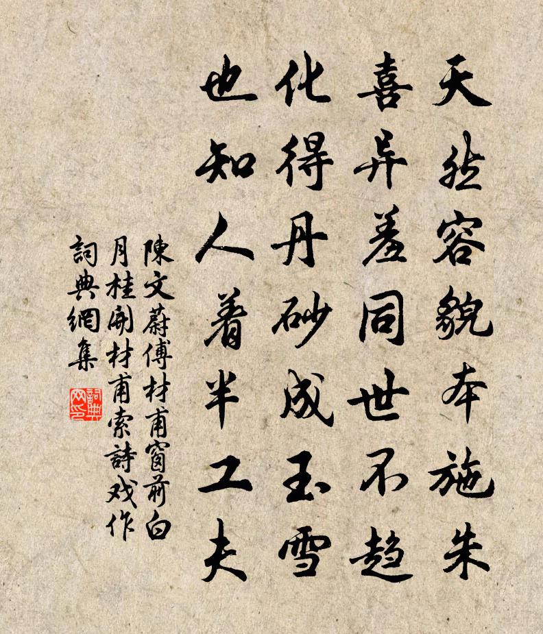 詩詞名句歷史字典書法欣賞書法字典國語詞典說文解字康熙字典古漢語字典標 題 作 者 詩 句 傅材甫窗前白月桂開材甫索詩戲作作者:陳文蔚 朝代:宋代原文天然容貌本施朱,喜異羞同世不趨。化得丹砂成玉雪,也知人著半工夫。詩詞問答問:《傅材甫窗前白月桂開材甫索詩戲作》的作者是誰?答:陳文蔚問:該詩寫於哪個朝代?答:宋代書法欣賞傅材甫窗前白月桂開材甫索詩戲作書法作品詩詞推薦摘椒頌釋淨全〔宋代〕含煙帶露已經秋,顆顆通紅氣味周。突出眼睛開口笑,這回不戀舊枝頭。次韻沖卿除日立春王安石〔宋代〕猶殘一日臘,並見兩年春。物以終為始,人從故得新。迎陽朝翦彩,守歲夜傾銀。恩賜隨嘉節,無功只自塵。魏漕彥成昔宰弋陽政績上聞召對改秩予適當詞胡寅〔宋代〕漢水縈川北且南,大堤花映府潭潭。若非刺史裨頹缺,鴨綠澆成幾醉酣。人送岩桂二首姜特立〔宋代〕七月濁暑氣氤氳,天香忽墮明月輪。一枝先入西風手,洗我三伏胸中塵。南歌子 原誤作南鄉子,茲據律改元好問〔金代〕人日過三日,元宵便五宵。共言今日好生朝。皓月光輝,香動玉梅梢。謝女工飛絮,周郎待小喬。年年燈下醉金蕉送周漢東入都並呈徐學士子方閻學士子靜盧學方回〔宋代〕同是黃山彩藥人,相逢十載客中身。贅疣天地吾無用,萍梗江湖子亦貧。曳組定趨定馬署,揚鞭初闖玉京塵。徐閻醉思仙(寓居妙湛悼亡作此)孫道絢〔宋代〕晚霞紅。看山迷暮靄,煙暗孤松。動翩翩風袂,輕若驚鴻。心似鑒,鬢如雲,弄清影,月明中。謾悲涼,歲冉冉,偈頌六十五首釋普濟〔宋代〕知之一字,眾禍之門。 * 放火,活捉生擒。不是今日樞要,亦非上古典刑。與賊過梯了也,攻牆割壁何人。倦尋芳(餞周糾定夫)吳文英〔宋代〕暮帆掛雨,冰岸飛梅,春思零亂。送客將歸,偏是故宮離苑。醉酒曾同涼月舞,尋芳還隔江塵面。去難留,悵芙蓉喜雨胡寅〔宋代〕聞說頻年旱,先懷並日憂。家書不易到,囷米諒難求。一雨連三夕,千倉裕九秋。若為知帝力,鼓腹聽蠻謳。山中早春司馬光〔宋代〕山木欣欣意,春光次第催。欹巾望歸雁,伏檻聽新雷。岩靜聞冰折,巢空喜燕來。澗花從寂寞,亦向草堂開。梧窗二首白玉蟾〔宋代〕世事如塵掃又生,梧窗終日坐冥冥。有時飲罷卻行樂,立看風吹閣上鈴。次韻木蘊之狀元義烏道中一首喻良能〔宋代〕奔走塵埃老未休,每思上下兩岩稠。關心簿領三書考,回首家山兩換秋。搘腹自憐鷦鼴小,江湖誰計雁鳧留。又遮水調歌頭 慶壽周權〔元代〕天上有仙客,家世說南州。精神炯炯秋水,胸次納青丘。帶取括蒼風月,來聽蓬萊環佩,笑閱幾春秋。袖有如椽筆沁園春 贈靜庵口訣李道純〔元代〕歷劫元神,旦初祖氣,太始元精。道三般至寶,同根並蒂,欲求端的,勿泥身形。息定神清,緣空氣固,清靜無為悲從弟仲德陶淵明〔魏晉〕銜哀過舊宅,悲淚應心零。借問為誰悲?懷人在九冥。禮服名群從,恩愛若同生。門前執手時,何意爾先傾!在數送張無夢歸天台山王欽若〔宋代〕天台瓊台標奇狀,赤城瀑布懸千丈。中有高人混姓名,不向迷途隨得喪。閒尋棋侶過清溪,靜撥雲根種紫芝。八卦十月三日泛舟湖中作陸游〔宋代〕桑落可釀酒,草枯可呼鷹;平生當此時,意氣十倍增。即今境界別,千錢買短篷,鏡湖三百里,往來寒日中。小甑寓言三首·其二李白〔唐代〕搖裔雙彩鳳,婉孌三青禽。往還瑤台里,鳴舞玉山岑。以歡秦娥意,復得王母心。區區精衛鳥,銜木空哀吟。賀張儀立弄璋度正〔宋代〕弄月吟風泮水湄,幾回占喜誤蛛絲。三鱣講罷爭傳易,一鯉祥開想學詩。天傅梅花凝蝶粉,春歸柳葉畫蛾眉。何時名句推薦玉帛朝回望帝鄉,烏孫歸去不稱王常建《塞下曲四首·其一》 虛負凌雲萬丈才,一生襟抱未曾開。崔珏《哭李商隱》 田夫荷鋤至,相見語依依。王維《渭川田家》 正是霜風飄斷處,寒鷗驚起一雙雙。陸龜蒙《冬柳》 把君詩卷燈前讀, 詩盡燈殘天未明。白居易《舟中讀元九詩》 煙霏雲斂;其容清明,天高日晶;歐陽修《秋聲賦》 誰料蘇卿老歸國,茂陵松柏雨蕭蕭。李商隱《茂陵》 欲買桂花同載酒,終不似,少年游。劉過《唐多令·蘆葉滿汀洲》 民之歸仁也,猶水之就下、獸之走壙也。孟子《孟子·離婁章句上·第九節》 疑人勿使,使人勿疑脫脫《金史·本紀·卷四》