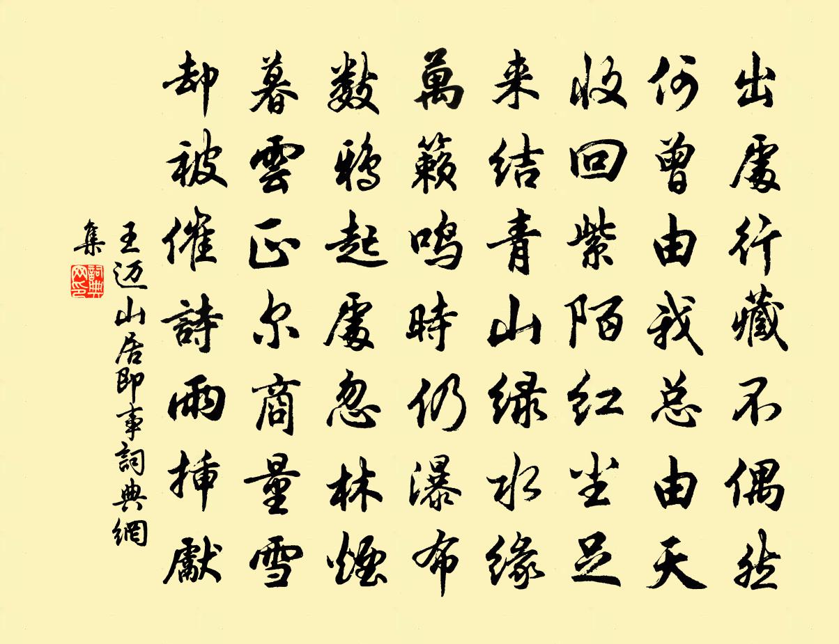 詩詞名句歷史字典書法欣賞書法字典國語詞典說文解字康熙字典古漢語字典標 題 作 者 詩 句 山居即事作者:王邁 朝代:宋代山居即事原文出處行藏不偶然,何曾由我總由天。收回紫陌紅塵足,來結青山綠水緣。萬籟鳴時仍瀑布,數鴉起處忽林煙。暮雲正爾商量雪,卻被催詩雨插先。詩詞問答問:山居即事的作者是誰?答:王邁問:山居即事寫於哪個朝代?答:宋代王邁山居即事書法欣賞山居即事書法作品詩詞推薦杏園即事王安石〔宋代〕蟠桃移種杏園初,紅抹燕脂嫩臉蘇。聞道飄零落人世,清香得似舊時無。監洞霄宮俞康直郎中所居四詠 退圃蘇軾〔宋代〕百丈休牽上瀨船,一鉤歸釣縮頭鯿。園中草木春無數,只有黃楊厄閏年。(俗說黃楊歲長一寸,遇閏退三寸。)留贈上官常用孔武仲〔宋代〕河梁欲上手重攜,冷語南湖百尺堤。看發了青雲開羽翼,莫羞黃綬走塵泥。文章炳蔚元摛鳳,鋩刃縱橫暫割雞毛。記夢回文二首(並敘)蘇軾〔宋代〕十二月二十五日,大雪始晴,夢人以雪水烹小團茶,使美人歌以飲。余夢中為作迴文詩,覺而記其一句雲亂點余花游茅山五首儲光羲〔唐代〕十年別鄉縣,西雲入皇州。此意在觀國,不言空遠遊。九衢平若水,利往無輕舟。北洛反初路,東江還故丘。春山市得笛竹簟因成詩黃庶〔宋代〕八尺枯涼簟一筒,小軒拂拭趣誰同。樽前聲負千杯月,窗下光贏一枕風。易向曲肱增舊意,詩因仰看有新功。蠹書賦山茶示陳慧甫三首張明中〔宋代〕檀心絳蕊壓牆低,南海山根巧自移。濃艷未應輸石醋,吹香底用倩風姨。水龍吟(初夏)曹勛〔宋代〕鑒天雲斂壺中,晝暖乍喜薰風永。輕紗漸試,香羅初褪,梅陰又□。廣殿窗虛,翠簾捲起,一番清影。正新篁綠嫩句曾幾〔宋代〕手自栽培千個竹,身常枕籍一床書。送別袁公四詩孫應時〔宋代〕南風一夜漲痕吹,江岫排空送袞衣。萬里直愁知己遠,百年長恨此公稀。眼看蜀柂沙邊起,心逐吳雲峽外飛。流水煮粥行尤侗〔清代〕去年散米數千人,今年煮粥才數百。去年領米有完衣,今年啜粥見皮骨。去年人壯今年老,去年人眾今年少。爺娘胡長彥母解氏輓詞周必大〔宋代〕蘐死蘭枯及老堂,翩翩丹旐逐風翔。冰間鱗躍悲餘閣,紙上鸞回閟古囊。年過九齡今代少,家留一桂異時芳。衰宗酬幽居閒上人喜及第後見贈陳羽〔唐代〕九霄心在勞相問,四十年間豈足驚。風動自然雲出岫,高僧不用笑浮生。鷓鴣天·有客慨然談功名因追念少年時事戲作辛棄疾〔宋代〕壯歲旌旗擁萬夫,錦襜突騎渡江初。燕兵夜娖銀胡觮,漢箭朝飛金僕姑。追往事,嘆今吾,春風不染白髭鬚。卻將江華送熊清父游廣州時予有衡陽之役樂雷發〔宋代〕邂逅陽華且酒壺,海鵬衡雁各征途。閒身俱被饑寒役,老境還堪離別無。鄉夢定應思款段,客吟何用說娵隅。曾從明發祈門悟法寺,溪行險絕六首楊萬里〔宋代〕一泒泉從千丈崖,轟霆跳雪瀉將來。無論驚殺行人著,兩岸諸峰震欲摧。滿庭芳袁去華〔宋代〕馬上催歸,枕邊喚起,謝他閒管閒愁。正難行處,雲木叫鉤輈。似笑天涯倦客,區區地、著甚來由。真憐我,提壺題化城寺應物〔唐代〕平高選處創蓮宮,一水縈流處處通。畫閣晝開遲日畔,禪房夜掩碧雲中。平川不見龍行雨,幽谷遙聞虎嘯風。偶與六月一日始熱二首趙蕃〔宋代〕落日看籬腳,晚風占樹頭。庭荒雖惹咫,步繞亦頻周。我老自投網,民愚還坐囚。相哀莫相釋,點點更悠悠。偈頌一百零九首釋可湘〔宋代〕翻達出頭來,賣弄醜舉止。雲門打不殺,德山呵不起。曉間園裡聽鶯啼,昔日毗嵐今宛爾。名句推薦衰柳寒蟬一片愁,誰肯教白衣送酒?盧摯《沉醉東風·重九》 怪人不知理,知理不怪人。佚名《增廣賢文·下集》 萬頃風濤不記蘇。雪晴江上麥千車。蘇軾《浣溪沙·萬頃風濤不記蘇》 蕭蕭落木不勝秋,莫回首、斜陽下。納蘭性德《一絡索·過盡遙山如畫》 江流天地外,山色有無中。王維《漢江臨泛 / 漢江臨眺》 玉手佳人,笑把琵琶理。顧德輝《蝶戀花·春江暖漲桃花水》 天涯地角有窮時,只有相思無盡處。晏殊《玉樓春·春恨》 畢竟西湖六月中,風光不與四時同。楊萬里《曉出淨慈寺送林子方》 牛困人飢日已高,市南門外泥中歇。白居易《賣炭翁》 所作福德不應貪著。鳩摩羅什譯《金剛經·不受不貪》