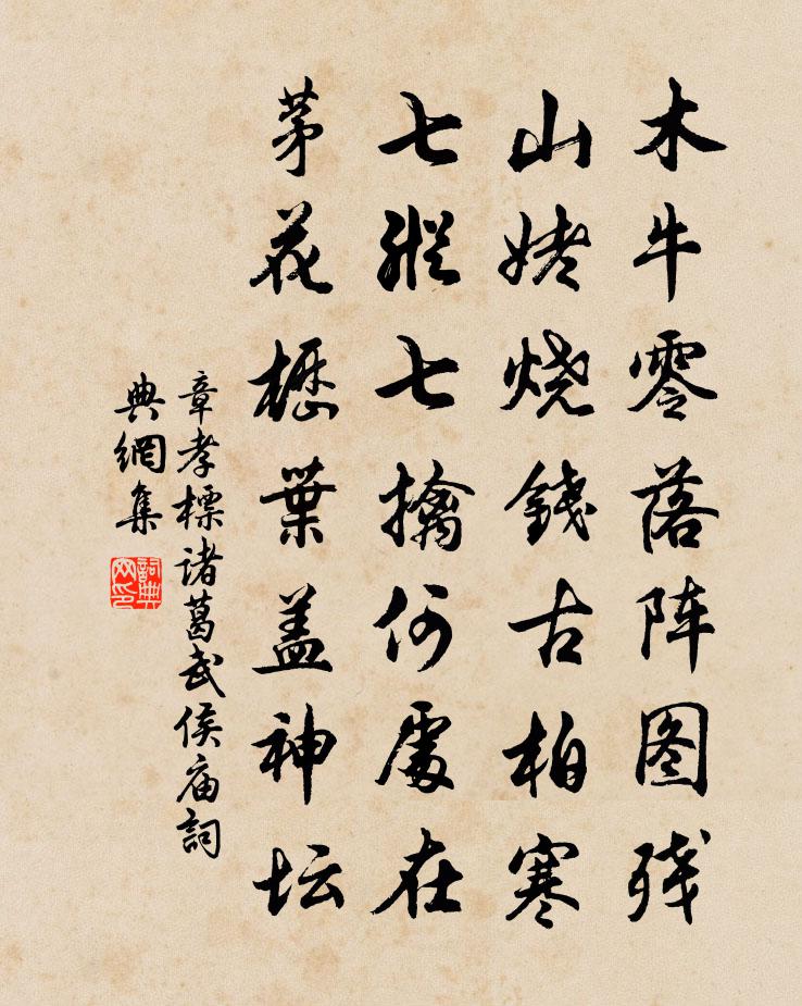 詩詞名句歷史字典書法欣賞書法字典國語詞典說文解字康熙字典古漢語字典標 題 作 者 詩 句 諸葛武侯廟作者:章孝標 朝代:唐代諸葛武侯廟原文木牛零落陣圖殘,山姥燒錢古柏寒。七縱七擒何處在,茅花櫪葉蓋神壇。詩詞問答問:諸葛武侯廟的作者是誰?答:章孝標問:諸葛武侯廟寫於哪個朝代?答:唐代問:諸葛武侯廟是什麼體裁?答:七絕章孝標諸葛武侯廟書法欣賞諸葛武侯廟書法作品注釋全唐詩:卷506-33詩詞推薦自在吟邵雍〔宋代〕心不過一寸,兩手何拘拘。身不過數尺,兩足何區區。何人不飲酒。何人不讀書。奈何天地間,自在獨堯夫。北山之英崔敦禮〔宋代〕強敵驕兮晉多壘,忽登山兮望廷尉。風霾兮殺氣昏,突槍櫑兮亂鉤陳。予君麾兮從君鉞,戰陵西兮捍溪柵。虹食壘野步陸游〔宋代〕水生已抹堤,草長復侵路。小蝶仍可憐,欲下卻飛去。賦得啼猿送客皎然〔唐代〕萬里巴江外,三聲月峽深。何年有此路,幾客共沾襟。斷壁分垂影,流泉入苦吟。淒涼離別後,聞此更傷心。送覺上人釋子淳〔宋代〕異類潛行未光前,昂藏頭角聳摩天。回途莫襯寒岸草,耕破威音那畔田。自湘中將入蜀留別諸友齊己〔唐代〕巾舄初隨入蜀船,風帆吼過洞庭煙。七千里路到何處,十二峰雲更那邊。巫女暮歸林淅瀝,巴猿吟斷月嬋娟。來年嶼贈白雲先生王迥孟浩然〔唐代〕悠悠清水江,水落沙嶼出。回潭石下深,綠筿岸傍密。鮫人潛不見,漁父歌自逸。憶與君別時,泛舟如昨日。夕陽次韻酬朱昌叔五首王安石〔宋代〕白下門東春水流,相看一噱散千憂。穿梅入柳曾莫逆,度墜緣岡初不謀。世事但如吹劍首,官身難即問刀頭。長臨邊秋薄暮(一作出塞)蘇頲〔唐代〕海外秋鷹擊,霜前旅雁歸。邊風思鞞鼓,落日慘旌麾。浦暗漁舟入,川長獵騎稀。客悲逢薄暮,況乃事戎機。和新鄉二十一兄華嚴水亭五首晃沖之〔宋代〕嗜酒不知淹歲月,好閒久欲棄簪纓。暫游蓮社同陶令,終向瓜田學邵平。菩薩蠻盧炳〔宋代〕石榴裙束纖腰裊。金蓮穩襯弓靴小。嬌呆□羞人。傘低遮半身。恩情如紙薄。方信當初錯。邂逅苦匆匆。還疑是夢讀詩楊萬里〔宋代〕船中活計只詩編,讀了唐詩讀半山。不是老夫朝不食,半山絕句當朝餐。贈出塞客薛能〔唐代〕出郊征騎逐飛埃,此別惟愁春未回。寒葉夕陽投宿意,蘆關門向遠河開。春懷葛天民〔宋代〕向晚一鳩鳴,道人春睡足。無處寫幽懷,巡桅數修竹。次韻張部門湖上二首項安世〔宋代〕詩興春來似水翻,更添孤艇入雲間。中心白閣蘇堤路,兩岸南屏西竺山。一日晴明輸子往,半年風雨被渠慳。欹眠觀瑞香杏花二首瑞香王洋〔宋代〕陌上春風已半酣,薰籠院靜怯輕寒。織成花錦傳香密,養就嬌羞對客人。山路不知清夢遠,宮衣猶惜舊花殘。若將雨宿方岳〔宋代〕雨宿疏篷不耐閒,苹花菰葉老江乾。鷺飛欲下忽驚起,秋水新添一寸寒。野園趙崇鉘〔宋代〕野園對客無杯勺,共坐茅檐理釣車。片月漸低風露冷,隔牆山鬼嘯梨花。寄劉凝遠巒四首趙蕃〔宋代〕少陵衣缽在涪翁,傳述東萊得正宗。聞道曾經親授記,不求印可誰更從。壽趙茂嘉郎中二首辛棄疾〔宋代〕玉色長身白首郎,當年麾節幾甘棠。力貧活物陰功大,未老垂車逸興長。久矣如今太公望,巋然真是魯靈光。朝廷名句推薦把酒看花想諸弟,杜陵寒食草青青。韋應物《寒食寄京師諸弟》 桃未芳菲杏未紅,沖寒先喜笑東風。曹雪芹《詠紅梅花得“紅”字》 不見去年人,淚濕春衫袖。歐陽修《生查子·元夕》 最是一年春好處,絕勝煙柳滿皇都。韓愈《早春呈水部張十八員外 / 初春小雨 / 早春》 重岩疊嶂,隱天蔽日。酈道元《三峽》 奉君金卮之美酒,玳瑁玉匣之雕琴。鮑照《擬行路難·其一》 鑒於水者見面之容,鑒於人者知吉與凶司馬遷《史記·七十列傳·范睢蔡澤列傳》 惜恐鏡中春。不如花草新。張先《菩薩蠻·憶郎還上層樓曲》 翠華想像空山里,玉殿虛無野寺中。杜甫《詠懷古蹟五首·其四》 鑒前世之興衰,考當今之得失司馬光《資治通鑑·後周紀五》