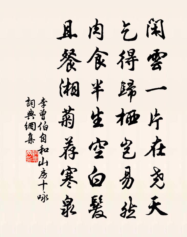 詩詞名句歷史字典書法欣賞書法字典國語詞典說文解字康熙字典古漢語字典標 題 作 者 詩 句 自和山房十詠作者:李曾伯 朝代:宋代自和山房十詠原文閒雲一片在堯天,乞得歸棲豈易然。肉食半生空白髮,且餐湘菊薦寒泉。詩詞問答問:自和山房十詠的作者是誰?答:李曾伯問:自和山房十詠寫於哪個朝代?答:宋代李曾伯自和山房十詠書法欣賞自和山房十詠書法作品詩詞推薦千秋歲(葉審言生日)周紫芝〔宋代〕當年文焰。蜀錦詞華爛。年正少,聲初遠。手攀天上桂,書奏蓬萊殿。人盡道,洛陽盛事今重見。千尺青蒼乾。直題畫馬圖李復〔宋代〕龍種天駒產渥窪,五雲毛色散成花。瑤池一去無訊息,只許丹青紙上夸。和彥沖同原仲過交溪橋頭李處權〔宋代〕不識交溪路,詩來錦繡重。閒雲時出岫,落日更明松。叔夜常為鍛,淵明亦近農。喜君機事息,魚鳥故相容。贈道士張易張鎡〔宋代〕道人生長清淮西,地荒戰血孤鬼啼。飽知濁世一朝菌,擺落羈馽全天倪。穿霞踏月半區宇,山水名勝隨攀躋。我來雜曲歌辭。長相思張繼〔唐代〕遼陽望河縣,白首無由見。海上珊瑚枝,年年寄春燕。新涼夜坐范成大〔宋代〕吏退焚香百慮空,靜聞蟲響度簾櫳。江頭一尺稻花雨,窗外三更蕉葉風。日日老添明鏡里,家家涼入短檠中。簡編四月初四日聞績溪凡十五都賊焚欲盡傍出焚歙方回〔宋代〕昔日初聞寇,諸人早出師。焚燒寧太廣,收勦已無遺。斧鉞何曾鈍,雷霆豈肯心。遷延非決策,那得更狐疑。花心動長筌子〔元代〕江路閒遊,見梅芳姿,水邊將發。蓓蕾半開,疏影斜橫,幽艷傲欺霜雪。清癯獨秀風台畔,笑百卉、凍凝摧折。散漁村落照趙蕃〔宋代〕落日千山赤,平林一帶青。翁方賣魚去,孤檝自橫汀。別墅芍藥盛開沈公辟有詩見嘲次韻代柬陳棣〔宋代〕翰林憶昔詠孤芳,自合移根向玉堂。貴客親陪天女手,侍臣應帶御爐香。花前未許退之醉,江上空嗟子美狂。一夜淵明故址童潮〔宋代〕先生已歸來,遺此折腰地。不見督郵人,祗聞解印事。徑花雖就荒,台月還留醉。賦罷清流詩,西疇春已至。薔薇花陸暢〔唐代〕錦窠花朵燈叢醉,翠葉眉稠裛露垂。莫引美人來架下,恐驚紅片落燕支。早起賈島〔唐代〕北客入西京,北雁再離北。秋寢獨前興,天梭星落織。耽玩余恬爽,顧盼輕痾力。旅途少顏盡,明鏡勸仙食。出門贈筆工楊日新方回〔宋代〕黃鐘九寸裁為律,六呂六律相配匹。嶰谷參差十二筒,猗管城子從此出。上古蒼頡初制字,後人蒙恬始造筆。吳雲龜堂雜興陸游〔宋代〕道妙從來亦麤聞,閉門方用十年勤。筆端小技深知悔,舊稿如山欲盡焚。旅中重陽有懷鄉國楊億〔宋代〕嘉節臨重九,羈游托異鄉。萸房誰系臂,菊蕊懶浮觴。野渡賓鴻急,村田晚稻黃。悲秋更懷土,祇恐鬢成霜。水精大珠曾極〔宋代〕冰玉摩尼如鵠卵,大千世界倒懸中。何人提向江頭照,照見神州一半空。酬王生鄭獬〔宋代〕兩日立我門,再拜求我詩。我詩非美粟,安得充君飢。十年誦周易,滿腹文王辭。文王不可見,使我空涕洟。閏月丙子判府相公被制命升使弼越六月癸卯公朱長文〔唐代〕宣制初聞下玉墀,又逢盛事協熊罷。青霄靈昂凝祥久,紫府蟠桃結實奇。養志增添龜鶴算,避權辭讓鳳凰池。從今寄袁州陳智周沈廷瑞〔唐代〕名山相別後,別後會難期。金鼎銷紅日,丹田老紫芝。訪君雖有路,懷我豈無詩。休羨繁華事,百年能幾時。名句推薦君子和而不同,小人同而不和。孔子弟子《論語·子路篇》 不負東籬約,攜尊過草堂。妙信《九日酬諸子》 學不精勤,不如不學 。令狐德棻《周書·列傳·卷二十五》 無數春筍滿林生,柴門密掩斷行人。杜甫《詠春筍》 水溢芙蓉沼,花飛桃李蹊。薛道衡《昔昔鹽》 白雲江上故鄉,月下風前吟處。子蘭《秋日思舊山》 古者聖人為猛禽狡獸暴人害民,於是教民以兵行。墨子《墨子·21章 節用(中)》 粉墮百花洲,香殘燕子樓。曹雪芹《唐多令·柳絮》 日落謝家池館,柳絲金縷斷。韋莊《歸國遙·春欲晚》 喜遇重陽,更佳釀今朝新熟。宋江《滿江紅·喜遇重陽》