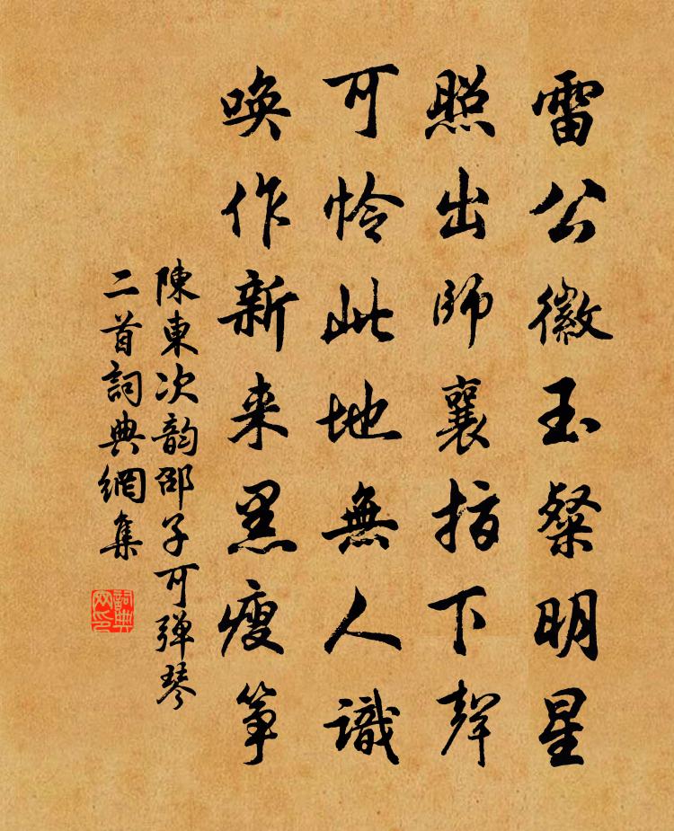 詩詞名句歷史字典書法欣賞書法字典國語詞典說文解字康熙字典古漢語字典標 題 作 者 詩 句 次韻邵子可彈琴二首作者:陳東 朝代:宋代次韻邵子可彈琴二首原文雷公徽玉粲明星,照出師襄指下聲。可憐此地無人識,喚作新來黑瘦箏。詩詞問答問:次韻邵子可彈琴二首的作者是誰?答:陳東問:次韻邵子可彈琴二首寫於哪個朝代?答:宋代陳東次韻邵子可彈琴二首書法欣賞次韻邵子可彈琴二首書法作品詩詞推薦司空侍郎故居王翰〔唐代〕西風策馬問王官,松徑縈紆上百盤。泉響夜潭穿石竇,峰高天柱矗雲端。一鳴共許才華舊,三詔方知節操寒。花落與楊秀才話別齊己〔唐代〕庾信哀何極,仲宣悲苦多。因思學文賦,不勝弄乾戈。自古有如此,於今終若何。到頭重策蹇,歸去舊煙蘿。太和道中雪作因與諸友下馬索酒快飲率爾成詩吳則禮〔宋代〕興來下馬索酒觴,雪打戰袍殊未央。有底須尋戴安道,端憐吳語賀知章。沁園春(丁酉春陪制垣齊安郡圃曲水之集)李曾伯〔宋代〕形勝風流,樂事良辰,一時四並。正榆更新火,觴浮曲水,那堪上巳,又是清明。赤壁功名,東坡文字,俯仰人間扇子詩李石〔宋代〕拈花示病元來怕,遇酒逃禪卻未真。三古絕編徒自聖,二王書法恐非臣。約遊春不去朱淑真〔宋代〕少年意思懶能酬,愛好心情一向休。若到舊家遊冶處,只應滿眼是春愁。宿山觀余靖〔宋代〕孤枕秋宵永,山寒夢不成。殘燈背窗影,急雨帶溪聲。未分山中老,空思日下名。區區如逆旅,此際若為情。步虛詞五首徐鉉〔唐代〕聖主過幽谷,虛皇在蕊宮。五千宗屋母。七字秘神童。世人玉壺遠,人間玉籥空。唯余養身法,修此與天通。紀事二十四首梁啓超〔清代〕一夫一妻世界會,我與瀏陽實創之。尊重公權割私愛,須將身作後人師。偶題姜特立〔宋代〕富貴來時人已老,光陰去後如何。有時無事閒思省,我獨人間人歲多。丁督護曲趙文〔宋代〕丁督護,為我行。去時馬上郎,今作野外殤。男兒肯斷頭,歸女肯斷腸。謝公輓詞三首歐陽修〔宋代〕前日賓齋宴,今晨奠柩觴。死生公自達,存沒世徒傷。舊國難歸葬,余紫不給◇。平生公輔志,所得在文章。步虛陸游〔宋代〕微風吹碧海,細細生龍鱗,半醉騎一鶴,去謁青華君。歸來天風急,吹我過緱山,鏘然喔詩聲,清曉落人間。人間相和歌辭。祠神歌。迎神王睿〔唐代〕蓪草頭花椰葉裙,蒲葵樹下舞蠻雲。引領望江遙滴酒,白蘋風起水生文。蜆子贊釋師範〔宋代〕出手露腳,撈蝦摝蜆。這窮鬼子,可貴可賤。紙錢堆裹謾藏身,莫言冷地無人見。胡少明兩書索二程先生畫像寄小詩二首陳長方〔宋代〕微言固已成糟粕,紙上形容轉更疏。要識平生真面目,百無所似若為書。山中方岳〔宋代〕只合空山著此身,野猿骨相鶴精神。何關親戚儻來物,自笑痴頑向上人。手可持杯寧是病,瓶猶儲粟未為貧。公卿漳河疑冢京鏜〔宋代〕疑冢多留七十餘,謀身自謂永無虞。不知三馬同槽夢,曾為兒童遠慮無。楊畋赴官并州梅堯臣〔宋代〕嘗聞地近胡,寒氣盛中都。車馬行臨塞,關山見落榆。吳鉤皆尚壯,章甫幾為儒。寄謝西曹掾,能吟秀句無。出金陵王安石〔宋代〕白石岡頭草木深,春風相與散衣襟。浮雲映郭留佳氣,飛鳥隨人作好音。名句推薦之子歸窮泉,重壤永幽隔。潘安《悼亡詩三首》 秋風萬里芙蓉國,暮雨千家薜荔村。譚用之《秋宿湘江遇雨》 朝來入庭樹,孤客最先聞。劉禹錫《秋風引》 一味學吃虧,是處事良方。王永彬《圍爐夜話·第五四則》 薄霧濃雲愁永晝,瑞腦銷金獸。李清照《醉花陰·薄霧濃雲愁永晝》 床前明月光,疑是地上霜。李白《靜夜思》 任翠幄張天,柔茵藉地,酒盡未能去。晁補之《摸魚兒·東皋寓居》 春未老,風細柳斜斜。蘇軾《望江南·超然台作》 空勞縴手,解佩贈情人。牛希濟《臨江仙·柳帶搖風漢水濱》 得賢者安存,失賢者危亡戴聖《大戴禮記·保傅第四十八》
