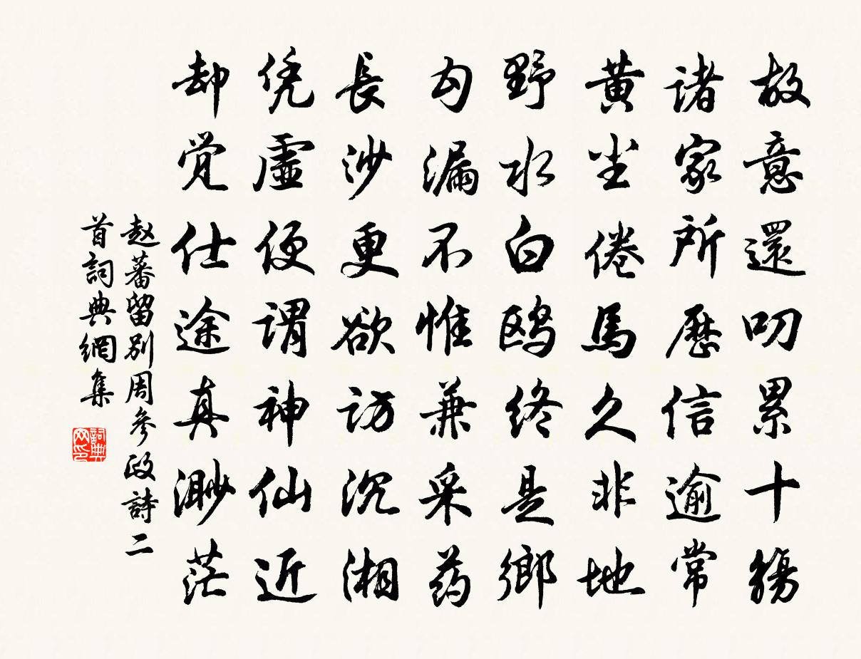 詩詞名句歷史字典書法欣賞書法字典國語詞典說文解字康熙字典古漢語字典標 題 作 者 詩 句 留別周參政詩二首作者:趙蕃 朝代:宋代留別周參政詩二首原文故意還叨累十觴,諸家所歷信逾常。黃塵倦馬久非地,野水白鷗終是鄉。勾漏不惟兼採藥,長沙更欲訪沉湘。憑虛便謂神仙近,卻覺仕途真渺茫。詩詞問答問:留別周參政詩二首的作者是誰?答:趙蕃問:留別周參政詩二首寫於哪個朝代?答:宋代趙蕃留別周參政詩二首書法欣賞留別周參政詩二首書法作品詩詞推薦呈陸嚴州二首趙蕃〔宋代〕去年犯雪到嚴州,呵筆題詩曳履投。所恨決然成間闊,故茲復爾小遲留。精金美玉自有價,伯樂王良無即休。珠玉海上秋懷吳融〔唐代〕辭無珪組隱無才,門向潮頭過處開。幾度黃昏逢罔象,有時紅旭見蓬萊。磧連荒戍頻頻火,天絕纖雲往往雷。昨夜子忱崇道吏部寄書問訊並寄藥物適當風雨夕長謝伋〔宋代〕數閒破屋壓崔嵬,經月何人共酒杯。入耳了無門外事,關心惟訪藥中材。一山秋色連雲暗,半夜風聲夾雨來。欲向春曉汪莘〔宋代〕曉來雨初晴,天宇淨如拭。隔籬見花柳,春氣亂五色。東君渾不管,但為閒者得。我方獵鵾鵬,溟南復溟北。城南寓居陳師道〔宋代〕遊子暮何歸,韋杜城南村。秋水深可測,挽衣踏行雲。道暗失歸處,棲鳥故不喧。牛羊閉籬落,稚子猶在門。訪隱者不遇高駢〔唐代〕落花流水認天台,半醉閒吟獨自來。惆悵仙翁何處去,滿庭紅杏碧桃開。再和前韻本欲創亭以獲時而止胡寅〔宋代〕不因修築廢農時,欲以仁心翊化基。野草從來豐可藉,量陂元自渺無湄。登臨有愜三檛鼓,衰病多慚一斗卮。獨喜昌州陳伯強〔宋代〕昌國古要區,人物屹相望。功名刻高崖,粟帛賜滿箱。太平山讀書奉寄城間諸友翁卷〔宋代〕寥寥鐘磬音,永日在空林。多見僧家事,深便靜者心。虛亭雲片泊,側徑石根侵。此去城間遠,君應懶出尋。怡怡亭王景華〔宋代〕怡怡亭畔路,兄到弟隨肩。花徑同調瑟,蘭窗共擘箋。看山攜老杖,分果憶兒筵。底事常相忍,張家未是賢。同年春燕孟郊〔唐代〕少年三十士,嘉會良在茲。高歌搖春風,醉舞摧花枝。意盪晼晚景,喜凝芳菲時。馬跡攢騕褭,樂聲韻參差。視聽風水洞范仲淹〔宋代〕神仙一去幾千年,自遣秦人不得還。春盡桃花無處覓,空餘流水到人間。下牢溪歐陽修〔宋代〕隔谷聞溪聲,尋溪度橫嶺。清流涵白石,靜見千峰影。岩花無時歇,翠栢郁何整。安能戀潺湲,俯仰弄雲景。相和歌辭怨詩二首·其二崔國輔〔唐代〕樓前桃李疏,池上芙蓉落。織錦猶未成,蟲聲入羅幕。大行皇帝輓詞五首許月卿〔宋代〕創始昌陵漢,中興高廟堯。登遐皆十月,揚烈擅三朝。再造煌煌業,參侔浩浩霄。中興兼創始,二帝侑逍遙。懷古四首為知己魏倅元長賦兼呈王永叔宗承載劉過〔宋代〕高高黃金台,燕趙爭趨風。後來得荊卿,恩禮盡鞠躬。丈夫易感激,況在窮厄中。縞衣登素車,函谷照已空。呂政六代祖師贊釋文禮〔宋代〕內外中間,覓罪不得。瞌睡醒來,眼睛突出。一從歸去皖公山,直至如今沒蹤跡。答宣城張主簿遺鴉山茶次其韻梅堯臣〔宋代〕昔觀唐人詩,茶詠鴉山嘉。鴉銜茶子生,遂同山名鴉。重以初槍旗,采之穿煙霞。江南雖盛產,處處無此茶。纖嫩次蔡介卿雪中風寄蔡戡〔宋代〕等閒栽遍小園花,剩擬春來賞物華。不覺瓊英先滿樹,更看縞帶暗隨車。光搖玉鏡冰初泮,凍屈金鉤草未芽。料得宿天童釋紹嵩〔宋代〕太白山頭月欲氏,鵲棲不穩繞枝飛。坐來客子渾忘倦,卻聽松聲聯翠微。名句推薦谷鳥吟晴日,江猿嘯晚風。李白《江夏別宋之悌》 勝地不常,盛筵難再;蘭亭已矣,梓澤丘墟。王勃《滕王閣序》 衰蘭送客鹹陽道,天若有情天亦老。李賀《金銅仙人辭漢歌》 借問此何時?春風語流鶯。李白《春日醉起言志》 傷心闊別三千里,屈指思量四五年。韓偓《寒食日重遊李氏園亭有懷》 柴門寂寂黍飯馨,山家煙火春雨晴。貫休《春晚書山家屋壁二首》 十輪霜影轉庭梧,此夕羈人獨向隅。晏殊《中秋月》 故鄉籬下菊,今日幾花開。江總《於長安歸還揚州九月九日行薇山亭賦韻 / 長安九日詩》 一念開明,反身而誠王陽明《傳習錄·卷中·答陸原靜書》 歌舞尊前,繁華鏡里,暗換青青發。薩都剌《念奴嬌·登石頭城次東坡韻》