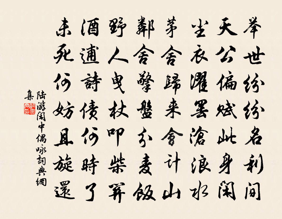 詩詞名句歷史字典書法欣賞書法字典國語詞典說文解字康熙字典古漢語字典標 題 作 者 詩 句 閒中偶詠作者:陸游 朝代:宋代閒中偶詠原文舉世紛紛名利間,天公偏賦此身閒。塵衣濯罷滄浪水,茅舍歸來會計山。鄰舍擎盤分麥飯,野人曳杖叩柴關。酒逋詩債何時了,未死何妨且旋還。詩詞問答問:閒中偶詠的作者是誰?答:陸游問:閒中偶詠寫於哪個朝代?答:宋代問:陸游的名句有哪些?答:陸游名句大全陸游閒中偶詠書法欣賞閒中偶詠書法作品詩詞推薦胡長文給事輓詩蔡戡〔宋代〕中庸天下有胡公,儒者端宜給事中。 * 高文推大手,回天讜論罄孤忠。晨班玉筍人何在,夜賜金蓮事已空。惆悵洞霄宮釋文珦〔宋代〕山勢逶迤九鎖分,洞天終自異人群。君王在昔曾游幸,故老猶今述見聞。瀑濺鶴衣明似雪,氣蒸龍穴暗成雲。夢回次韻李參政見謝游龍鶴山詩二首魏了翁〔宋代〕北山嘗乞草堂靈,娓娓高談析理精。潑眼溪光無間斷,入懷月色太鮮明。寒毛絡石清可數,暝靄蒸山濃欲傾。相對題崇聖寺(寺,故行宮也)許渾〔唐代〕西林本行殿,池榭日坡阤。雨過水初漲,雲開山漸多。曉街垂御柳,秋院閉宮莎。借問龍歸處,鼎湖空碧波。郁山主贊釋智遇〔宋代〕日暖跨驢出,溪橋款步行。因思遭攧處,寸草不曾生。逢故人杜牧〔唐代〕年年不相見,相見卻成悲。教我淚如霰,嗟君發似絲。正傷攜手處,況值落花時。莫惜今宵醉,人間忽忽期。春山行貫休〔唐代〕重疊太古色,濛濛花雨時。好峰行恐盡,流水語相隨。黑壤生紅黍,黃猿領白兒。因思石橋月,曾與故人期。新秦郡松樹歌王維〔唐代〕青青山上松。數里不見今更逢。不見君。心相憶。此心向君君應識。為君顏色高且閒。亭亭迥出浮雲間。寄商州馮十八仲鹹同年王禹偁〔宋代〕遷客秋來捧詔還,故人多怪鬢毛斑。重為東掖垣中士,猶夢西暉亭下山。靜算宦途皆是命,老思身計不如閒。何時送程尊師之晉陵羅隱〔唐代〕棟間雲出認行軒,郊外陰陰夏木繁。高道乍為張翰侶,使君兼是世龍孫。溪含句曲清連底,酒貰餘杭淥滿樽。莫見寄邢逸人鄭常〔唐代〕羨君無外事,日與世情違。地僻人難到,溪深鳥自飛。儒衣荷葉老,野飯藥苗肥。疇昔江湖意,而今憶共歸。靈溪觀劉昭禹〔唐代〕鰲海西邊地,宵吟景象寬。雲開孤月上,瀑噴一山寒。人異發常綠,草靈秋不乾。無由此棲息,魂夢在長安。山中月夜寄朱張二舍人武元衡〔唐代〕午夜更漏里,九重霄漢間。月華雲闕迥,秋色鳳池閒。御錦通清禁,天書出暗關。嵇康不求達,終歲在空山。和孫舍人重過陝下二首魏野〔宋代〕二陝重過一紀強, * 已變椹袍光。數宵黃合延三字,幾處青樓認五郎。顧我豈能夸舌在,逢君寧復嘆唇亡。大龍大茅嶺東新居憶亡子從真顧況〔唐代〕谷鳥猶呼兒,山人夕沾襟。懷哉隔生死,悵矣徒登臨。東門憂不入,西河遇亦深。古來失中道,偶向經中尋。大象次韻斌老冬至書懷示子舟篇末見及之作因以贈黃庭堅〔宋代〕二宗性清真,俱抱歲寒節。常思風雲會,為國奮忠烈。道方滄波穨,位有豺虎竊。夫婦相魚肉,關中一丈雪。北風潤州書事張耒〔宋代〕野蔓封城堞,疏鬆隔麗譙。樓臨寒洶湧,門揖翠迢嶢。客思閒易感,歸心去莫招。何時送客處,看我理歸橈。頌古十七首釋道行〔宋代〕因我得禮你,崑崙臥潭底。雖然浪拍天,身上無滴水。頌古十九首釋慧暉〔宋代〕那吒太子本來身,卓卓無依不受塵。雲散水流天地靜,籬間 * 正爭春。三月盡日李昌符〔唐代〕江頭從此管弦稀,散盡遊人獨未歸。落日已將春色去,殘花應逐夜風飛。名句推薦占得杏梁安穩處,體輕唯有主人憐,堪羨好因緣。牛嶠《憶江南·銜泥燕》 白鳥朱荷引畫橈,垂楊影里見紅橋,欲尋往事已魂消。王士禎《浣溪沙·紅橋》 雨下飛花花上淚,吹不去,兩難禁陳子龍《唐多令·寒食》 男兒少為客,不辨是他鄉。李流芳《黃河夜泊》 漠漠帆來重,冥冥鳥去遲。韋應物《賦得暮雨送李胄 / 賦得暮雨送李曹》 未知鹿死誰手房玄齡《晉書·載記·第五章》 佇倚危樓風細細。望極春愁,黯黯生天際。柳永《蝶戀花·佇倚危樓風細細》 凡與敵戰,若敵人初來,陣勢未定,行陣未整,先以兵急擊之,則勝。佚名《百戰奇略·第四卷·先戰》 漢帝重阿嬌,貯之黃金屋。李白《妾薄命》 一騎紅塵妃子笑,無人知是荔枝來。杜牧《過華清宮絕句三首》