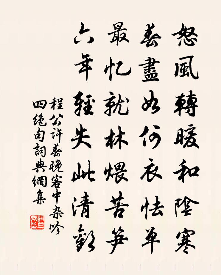 詩詞名句歷史字典書法欣賞書法字典國語詞典說文解字康熙字典古漢語字典標 題 作 者 詩 句 春晚客中雜吟四絕句作者:程公許 朝代:宋代春晚客中雜吟四絕句原文怒風轉暖和陰寒,春盡如何衣怯單。最憶就林煨苦筍,六年輕失此清歡。詩詞問答問:春晚客中雜吟四絕句的作者是誰?答:程公許問:春晚客中雜吟四絕句寫於哪個朝代?答:宋代程公許春晚客中雜吟四絕句書法欣賞春晚客中雜吟四絕句書法作品詩詞推薦宜祿昭仁寺後軒文同〔宋代〕危欄憑絕壑,欲奈此時何。但有夕陽處,就中秋色多。與誰同徒倚,空自發吟喔。便覺成羈旅,歸心逐雁過。四聖觀御園海棠花潘璵〔宋代〕燕子來時春政好,御園剩拆海棠花。如今翠輦游觀少,一片東風屬道家。博平鄭太守自廬山千里相尋入江夏北市門見訪…立馬贈別李白〔唐代〕大梁貴公子,氣蓋蒼梧雲。若無三千客,誰道信陵君。救趙復存魏,英威天下聞。邯鄲能屈節,訪博從毛薛。夷門詠智門寺前古樹趙蕃〔宋代〕愛此山中木,真能閱盛衰。近從吾祖日,遠至乃孫時。往往多摧折,堂堂獨保持。何殊孔明柏,但乏少陵詩。詠史下周處陳普〔宋代〕白額長蛇已就戡,不知賈郭更難堪。東吳陸喜鄉先罪,五等還應有第三。贈岩電隱士葉適〔宋代〕近時術人多莽蕩,要把虛史隨妄想。神王雖去形不拘,尺真須防尋有枉。從來鐘鼎無山林,老去豈復少年心。若言句陳松龍〔宋代〕梨花春二月,杜宇夜三更。十八日潮陳師道〔宋代〕眼看白浪覆青山,誰信黃昏去復還。縱使百年終有盡,何須豪橫詫吳蠻。句晁說之〔宋代〕荊州持大橘,亦名作黃柑。清明雨寒八首楊萬里〔宋代〕今年寒食與清明,各自陰晴作麽生。細雨千絲不成點,如何也解滴檐聲。永遇樂(秋夜有感)李綱〔宋代〕秋色方濃,好天涼夜,風雨初霽。缺月如鉤,微雲半掩,的燦星河碎。爽來軒戶,涼生枕簟,夜永悄然無寐。起徘句陳與行〔宋代〕霜間開紫蒂,露下發金英。次韻吳心機楊簡〔宋代〕洪範論時常,心官職雨暘。分龍何效竭,負扆久憂傷。禾槁幾於白,苗蘇尚可蒼。焦勞殊未已,詔旨欲盈箱。奉和御製秋懷詩二首徐沖淵〔宋代〕天末虹蜺晚未收,龍池新雨漲清流。鷗緣適意頻依渚,魚不貪香懶上鉤。剩喜三邊無警報,況當萬寶得成秋。嘯歌同趙景文到梅山弟家陳著〔宋代〕腳力猶支一里閒,得閒便不記艱難。可人本色山林屋,避世珍羞芋栗盤。來往任教詩眼熱,笑談能化老身寒。感懷挽朱師禹母二首黃公度〔宋代〕孝養空懷橘,嚴規想斷機。影留生日面,棺掩嫁時衣。萱室言猶在,蘭陔事已非。九原行楚挽,桃李慘春暉。溪邊回望東園桃李楊萬里〔宋代〕看花不合在花間,外面看來錦一般。每一團花三丈許,紅花團繞白花團。題涼峰黃公度〔宋代〕倚杖清秋遠,彈琴白晝長。笙簫離館廢,雲木晚風涼。往事空流水,巋心滿夕陽。相逢惜分手,珍重故人觴。感懷題從舅宅李昌符〔唐代〕郗家庭樹下,幾度 * 。今日花還發,當時事不同。流言應未息,直道竟難通。徒遣相思者,悲歌向暮空。感興五首次韻和李希孝四晁補之〔宋代〕不肯埽一室,顧欲天下清。少日又不羈,頗復鄉黨輕。長年始羞悔,耳目尚聰明。何須更市藥,小女故知名。名句推薦懷家寒食夜,中酒落花天。趙長卿《臨江仙·暮春》 家國興亡自有時,吳人何苦怨西施。羅隱《西施》 江上陰雲鎖夢魂,江邊深夜舞劉琨。譚用之《秋宿湘江遇雨》 明朝掛帆席,楓葉落紛紛。李白《夜泊牛渚懷古》 訪戴歸來,尋梅懶去,獨釣無聊。薛昂夫《蟾宮曲·雪》 近鄉情更怯,不敢問來人。宋之問《渡漢江》 夫淺知之所爭者,末矣。列子及其弟子《列子·說符》 蓄恩不倦,以一取萬。黃石公《三略·上略》 處世不退一步處,如飛蛾投燭、羝羊觸藩,如何安樂?洪應明《菜根譚·概論》 遠雁下平沙,嘹亮遺淒唳。劉道著《湘江秋曉》