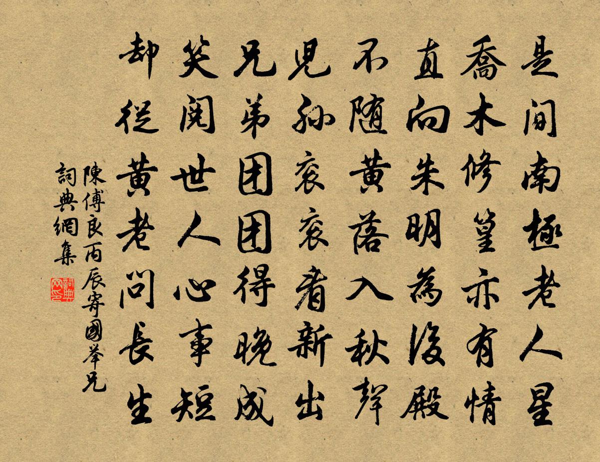 詩詞名句歷史字典書法欣賞書法字典國語詞典說文解字康熙字典古漢語字典標 題 作 者 詩 句 丙辰寄國舉兄作者:陳傅良 朝代:宋代丙辰寄國舉兄原文是間南極老人星,喬木修篁亦有情。直向朱明為後殿,不隨黃落入秋聲。兒孫袞袞看新出,兄弟團團得晚成。笑閱世人心事短,卻從黃老問長生。詩詞問答問:丙辰寄國舉兄的作者是誰?答:陳傅良問:丙辰寄國舉兄寫於哪個朝代?答:宋代陳傅良丙辰寄國舉兄書法欣賞丙辰寄國舉兄書法作品詩詞推薦方務德侍郎輓詞二首韓元吉〔宋代〕上聖詢黃髮,清時慨莫留。居中二千古,典外十三州。禁闥多閎議,籌幃裕遠猷。交新半天下,注海淚空流。留題景升北窗晁說之〔宋代〕南樓吹笛何人怨,北窗垂楊永日閒。何用綠楊高百尺,詩情筆趣總相關。資道俾予賦試劍山詩馬上承命作晁說之〔宋代〕青山群若好,此山何清特。如見孫登輩,高聳不可及。山神亦喜我,輕風鳴馬勒。馬上欲高喔,才窘開口澀。城墉謹和老人官山看高子厚修墓洪咨夔〔宋代〕秋風問訊老芙蕖,靖節前行後阿舒。緩策穩過金絡馬,小烹佳勝蔗漿廚。何榮何辱人千古,誰是誰非冢一區。遇著昭陽曲劉長卿〔唐代〕昨夜承恩宿未央,羅衣猶帶御衣香。芙蓉帳小雲屏暗,楊柳風多水殿涼。荊□范侍郎輓詞三首項安世〔宋代〕功畏人知不遣聞,雙雙榮國孝曾孫。果州汲綆無遺力,荊府調胹有德言。此日美人俱厭代,何時病士得開門。西風無悶丁注〔宋代〕風急還收,雲凍又開,海闊無人翦水。算六出工夫,怎教容易。剛被郢歌楚舞。鎮獨向,尊前夸輕細。想謝庭詩詠讀賢愚錄梅堯臣〔宋代〕為妹不傍貴,為婦不慢貧。為母不縱情,三德今播人。胡翁與著錄,蘇倩為書珉。比諸孟氏賢,義已同擇鄰。南歌子佚名〔宋代〕月下秦準海,花前晏小山。二仙仙去幾時還。留得月魂花魄、在人間。河漢流旌節,天風裊佩環。滿空香霧濕雲鬟長亭送別王實甫〔元代〕(夫人、長老上雲)今日送張生赴京,十里長亭,安排下筵席;我和長老先行,不見張生、小姐來到。(旦、末 江陵丁謂〔宋代〕渚宮形勝地,從古冠荊湖。依劉開幕府,吊屈俯滄浪。七月四夜十過差涼閒坐和徐子融晦日所寄四絕陳文蔚〔宋代〕每向清宵自省愆,滔滔無奈世皆然。盈虧訊息因而悟,萬事支頤一聽天。臨江仙趙長卿〔宋代〕元約三年。文卿不忍舍主,厥母不容與議,堅索之去。今失於一農夫,常常寄聲,或片紙數字問訊。仙源有感,遂春曉陸游〔宋代〕強尋殘夢苦難成,推枕搘藤繞舍行。新漲生波漁艇活,晨曦送暖客衣輕。煙迷芳草蒼茫色,鵲占高枝嚄唶聲。老病依韻和梅聖俞從登東樓三首王珪〔唐代〕雲日暉暉下碧山,誰從滄海宴初還。香車轤轆紅塵里,紫闕岧嶢瑞氣間。午夜笙歌移法曲,滿城桃李門朱顏。金吾花時留郡歸已初夏事六首黎廷瑞〔宋代〕從來麋鹿合山林,無奈迂疏習已深。食用且空猶種秫,典書未贖更修琴。少豪論事唯捫舌,晚靜觀空頗得心。莫笑寄瀘南子止兄晁公溯〔宋代〕杖鉞知何處,看雲望欲迷。真同阮南北,各寄蜀東西。峽險水增急,樓高山為低。春來日行樂,桃李想成蹊。宿池州齊山寺,即杜牧之九日登高處楊萬里〔宋代〕我來秋浦政逢秋,夢裡曾來似舊遊。風月不供詩酒債,江山長管古今愁。謫仙狂飲顛吟寺,小杜倡情冶思樓。問著林同年被檄來體訪民租寓僧舍有詩因次韻洪咨夔〔宋代〕河水清兮有縣特,東方作矣未解襦。寄聲卿自用卿法,我獨舉酒留詩臞。庚戍正月三,約同舍游西湖十首楊萬里〔宋代〕春光欲動意猶遲,未許遊人浪見伊。只有梅花藏不得,隔籬穿竹出橫枝。名句推薦小桃枝下試羅裳,蝶粉斗遺香。陳子龍《訴衷情·春遊》 十月江南天氣好,可憐冬景似春華。白居易《早冬》 枕前何事最傷情?梧桐葉上,點點露珠零。尹鶚《臨江仙·深秋寒夜銀河靜》 不及夜台塵土隔,冷清清、一片埋愁地納蘭性德《金縷曲·亡婦忌日有感》 對秋深,離恨苦,數夜滿庭風雨。孫光憲《更漏子·對秋深》 五原春色舊來遲,二月垂楊未掛絲。張敬忠《邊詞》 殘柳宮前空露葉,夕陽川上浩煙波。劉滄《經煬帝行宮》 鈍學累功,不妨精熟顏之推《顏氏家訓·文章篇》 又是過重陽,台榭登臨處,茱萸香墜。李煜《謝新恩·冉冉秋光留不住》 閒立春塘煙淡淡,靜眠寒葦雨颼颼。鄭谷《鷺鷥》
