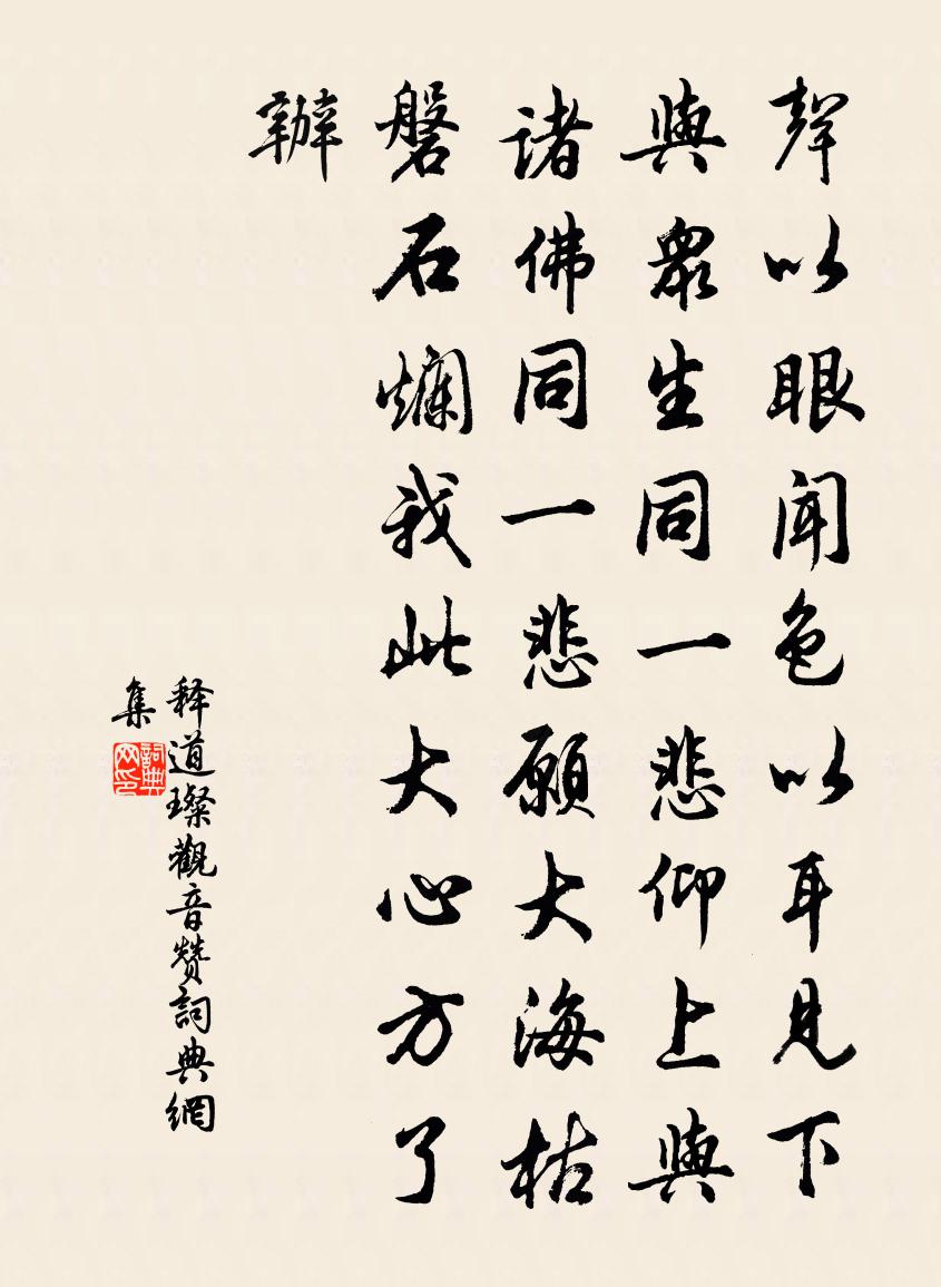 詩詞名句歷史字典書法欣賞書法字典國語詞典說文解字康熙字典古漢語字典標 題 作 者 詩 句 觀音贊作者:釋道璨 朝代:宋代觀音贊原文聲以眼聞,色以耳見。下與眾生同一悲仰,上與諸佛同一悲願。大海枯,磐石爛,我此大心方了辦。詩詞問答問:觀音贊的作者是誰?答:釋道璨問:觀音贊寫於哪個朝代?答:宋代釋道璨觀音贊書法欣賞觀音贊書法作品詩詞推薦金丹詩四十八首張繼先〔宋代〕塵寰道友萬千人,幾個虛名幾個真。不悟汞鉛為至寶,卻將爐灶學燒銀。內中採藥方端的,外里求丹謾苦辛。何況水調歌頭(和趙用錫)陳亮〔宋代〕事業隨人品,今古幾麾旌。向來謀國,萬事盡出汝書生。安識鯤鵬變化,九萬里風在下,如許上南溟。斥鷃旁邊笑挽趙知宗三首劉宰〔宋代〕孝廟垂衣日,宗工補袞時。治推三輔最,名熟九重知。紫禁塗非遠,琳宮志自頤。眼看庭下玉,持橐侍丹墀。送柴中行出守章貢危稹〔宋代〕力為君王乞得州,補天示了石學心。人才自係國輕重,吾道亦關公去留。殿角才辭槐影日,船頭便轉荻花秋。競夸琴中宮調辭晁補之〔宋代〕神仙神仙何處,青山里,白雲際,不似人間世。源上正碧桃春,清溪乍逢人。住無因,憶紅塵,出洞花紛紛。挽曾東軒二首王夢應〔宋代〕壯圖罹短世,野趣滿餘年。往事堪垂史,孤蹤每畏天。廣文俄病酒,摩詰厭聞弦。遙想南州士,生芻重泫然。八絕詩垂藤蓋王禹偁〔宋代〕古藤何樛蟠,低蔭庶子泉。童童若青蓋,掛在絕壁前。月穿波影碎,露滴岸聲圓。曉籠使君醉,夜覆溪僧禪。昔之滿江紅·建康史帥致道席上賦辛棄疾〔宋代〕鵬翼垂空,笑人世,蒼然無物。又還向、九重深處,玉階山立。袖裡珍奇光五色,他年要補天西北。且歸來,談笑西江月 讀通鑑唐太宗掊魏徵碑,有感而作胡祗遹〔元代〕晚食甘於粱肉,徐行穩似軒車。直須朝暮苦馳驅。指望凌煙高處。前日豐碑旌表,今朝貶*妻孥。喜為正直怒奸諛同象之方叔過淨因璉上人韓維〔宋代〕二十年來野逸身,懶能奔走傍埃塵。偶逢閭里閒遊伴,同過叢林燕坐人。世事糾紛寧有盡,勞生蕭散不妨頻。晴陽減字木蘭花·鶯初解語蘇軾〔宋代〕鶯初解語。最是一年春好處。微雨如酥。草色遙看近卻無。休辭醉倒。花不看開人易老。莫待春回。顛倒紅英間綠滿江紅(壽湯侍郎)劉克莊〔宋代〕曉色朦朧,佳色在、黃堂深處。記當日、霓旌飛下,鸞翔鳳翥。蘭省舊遊隆注簡,竹符新剖寬憂顧。有江南、千里秦中吟十首。不致仕(一作合致仕)白居易〔唐代〕七十而致仕,禮法有明文。何乃貪榮者,斯言如不聞?可憐 * 十,齒墜雙眸昏。朝露貪名利,夕陽憂子孫。掛冠伊犁將軍奏土爾扈特汗渥巴錫率全部歸順詩事乾隆〔清代〕土爾扈特部,昔汗阿玉奇,今來渥巴錫,明背俄羅斯。向化非招致,頒恩應博施,舍楞逃復返,彼亦合無辭。衛拉登襄陽城杜審言〔唐代〕旅客三秋至,層城四望開。楚山橫地出,漢水接天回。冠蓋非新里,章華即舊台。習池風景異,歸路滿塵埃。鶯鳴十章寄戚伯瑞彭龜年〔宋代〕日升於東,月生於西。惟神之馳,曾莫知所之。送傅守歸劉宰〔宋代〕世念分五兵,當使道戰勝。昔別稽山險,風采臞而整。重逢驚少莊,神光爍衰病。一氣中夜存,還丹強葛令。鎖宿省中,心氣大作,通昔不寐。得兩絕句楊萬里〔宋代〕酒病春愁恰並來,更沖花信宿鸞台。睡鄉堠子無三里,玉涌聲聲只喚回。夜和陳道士韻仇遠〔宋代〕聞道孤根暖已回,扶筇攜酒出山來。數花羞澀西坡上,也當春風一度開。送千二十侄五首李呂〔宋代〕卻喜君知取友端,詩情遊戲志睎顏。更煩為說開三逕,安得斯人數往還。名句推薦鬧花深處層樓,畫簾半卷東風軟。陳亮《水龍吟·春恨》 騎牛遠遠過前村,短笛橫吹隔隴聞。黃庭堅《牧童詩》 天與水違行,訟;君子以作事謀始。佚名《易傳·象傳上·訟》 妾身獨自眠,月圓人未圓。王元鼎《憑欄人·閨怨》 好面譽人者,亦好背而毀之。莊子《莊子·雜篇·盜跖》 江心雲帶蒲帆重,樓上風吹粉淚香。嚴仁《鷓鴣天·惜別》 門有車馬客,駕言發故鄉。陸機《門有車馬客行》 桑之未落,其葉沃若。佚名《氓》 明日巴陵道,秋山又幾重。李益《喜見外弟又言別》 王者以民為天,而民以食為天。班固《漢書·傳·酈陸朱劉叔孫傳》