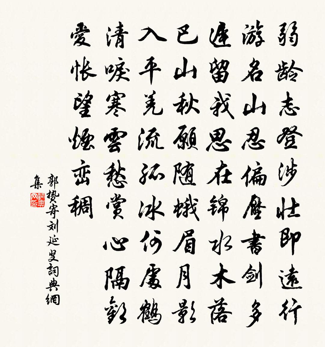 詩詞名句歷史字典書法欣賞書法字典國語詞典說文解字康熙字典古漢語字典標 題 作 者 詩 句 寄劉延叟作者:郭贄 朝代:宋代寄劉延叟原文弱齡志登涉,壯即遠行游。名山忍偏壓,書劍多遲留。我思在錦水,木落巴山秋。願隨蛾眉月,影入平羌流。孤冰何處鶴,清唳寒雲愁。賞心隔歡愛,悵望煙巒稠。詩詞問答問:寄劉延叟的作者是誰?答:郭贄問:寄劉延叟寫於哪個朝代?答:宋代郭贄寄劉延叟書法欣賞寄劉延叟書法作品詩詞推薦燕居常建〔唐代〕青苔常滿路,流水復入林。遠與市朝隔,日聞雞犬深。寥寥丘中想,渺渺湖上心。嘯傲轉無欲,不知成陸沈。次韻斯遠二十六日三絕趙蕃〔宋代〕傭販人人有闔廬,借居如我絕無娛。書無厚祿庸何嘆,賴爾詩能數起予。雜詩錢選〔宋代〕地僻秋深戎馬閒,一尊隨處且開顏。誰思銅雀埋黃土,但憶金人出漢關。六合茫茫天共遠,五湖杳杳雁飛還。中年失題項安世〔宋代〕夢回似覺前身誤,蛻罷便尋芳草吟。吟到夕陽人不恨,滿懷風露本無心。題唐興寺湘江亭張栻〔宋代〕寺廢蒼崖聳,江回遠岸明。風霜摧翰墨,歲月老絲緡。兀坐知茶味,閒行忘去程。長喔伊水句,回首右為情。寓興鮑溶〔唐代〕念來若望神,追往如話夢。夢神不無跡,誰使煩心用。魯聖虛泣麟,楚狂浪歌鳳。那言阮家子,更作窮途慟。和陶詠荊軻蘇軾〔宋代〕秦如馬後牛,呂氏非復嬴。天欲厚其毒,假手李客卿。功成志自滿,積惡如陵京。滅身會有時,徐觀可安行。沙丘送何端卿帥瀘黃彥平〔宋代〕何侯石友平生事,傅粉風流詎可同。誰使擁旄三峽外,不留持橐五雲中。啼猿此去欺殘月,回雁因來吒便風。亦念清明日東歸舟次滯雨宋庠〔宋代〕月弦離畢破芳辰,舟子招招數問津。壓岸晚陰雲著野,蘸渠春色柳隨人。煙疇雊雉逢誰嘆,風磧驚鷗莫我親。賜告好事近魏夫人〔宋代〕雨後曉寒輕,花外早鶯啼歇。愁聽隔溪殘漏,正一聲淒咽。不堪西望去程賒,離腸萬回結。不似海棠陰下,按涼州晚渡陸龜蒙〔唐代〕半波風雨半波晴,漁曲飄秋野調清。各樣蓮船逗村去,笠檐蓑袂有殘聲。秋意黃庚〔宋代〕梧葉翻風敲老樹,蛩聲帶月泣寒莎。只消些少閒風月,便覺客窗秋意多。茅亭陸游〔宋代〕終日坐茅亭,蕭然倚素屏。兒圓點茶夢,客授養魚經。馬以鳴當斥,龜緣久不靈。詩成作吳詠,及此醉初醒。遠齋和示疏字韻四詩復用韻並呈子肅趙蕃〔宋代〕春風吹雨密還疏,門掩荒山數畝居。換米但須居士屩,入都寧倚子公書。安貧自足容高枕,處事時應念覆車。所恨水調歌頭葛勝仲〔宋代〕下瀨驚船駛,揮麈恐尊空。誰吹尺八寥亮,嚼徵更含宮。坐愛金波瀲灩,影落蒲萄漲綠,夜漏盡移銅。回棹攜紅袖重戲贈白居易〔唐代〕集賢池館從他盛,履道林亭勿自輕。往往歸來嫌窄小,年年為主莫無情。滿庭芳趙令畤〔宋代〕玉枕生涼,金缸傳曉,敗葉飛破清秋。雨餘翻浪,渺渺阻行舟。暫系汀洲側畔,風夜起、荻葉添愁。銀屏遠,龍香寄筠州張錄事翁卷〔宋代〕每到友朋相會地,未嘗一日不思君。小詩曾托鄉僧寄,善政因逢故客聞。山上仙蹤丹鼎在,郭邊溪色市橋分。公餘齋中詠懷羊士諤〔唐代〕無心唯有白雲知,閒臥高齋夢蝶時。不覺東風過寒食,雨來萱草出巴籬。送路守郭印〔宋代〕道衰世彌隘,俗薄人易驕。一為居所移,盛氣乾雲霄。官曹出已下,俯視如僬僥。崇卑兩懸絕,相望天壤遼。猗歟名句推薦有眼不識泰山。施耐庵《水滸傳·第二回》 南山截竹為觱篥,此樂本自龜茲出李頎《聽安萬善吹觱篥歌》 躬自厚而薄責於人,則遠怨矣。孔子弟子《論語·衛靈公篇》 門外無人問落花,綠陰冉冉遍天涯。曹豳《春暮·門外無人問落花》 賢達哀樂,不在窮通禍福之間。脫脫《遼史·列傳·卷三十四》 蒼旻霽涼雨,石路無飛塵。岑參《暮秋山行》 朽木不可雕也,糞土之牆不可圬也!佚名《宰予晝寢》 藥醫不死病,佛度有緣人。馮夢龍《醒世恆言·卷十》 見說五湖供飲馬,滄浪何處著漁舟?陳子龍《秋日雜感(十首選一)》 不怕慢,只怕站。佚名《增廣賢文·下集》