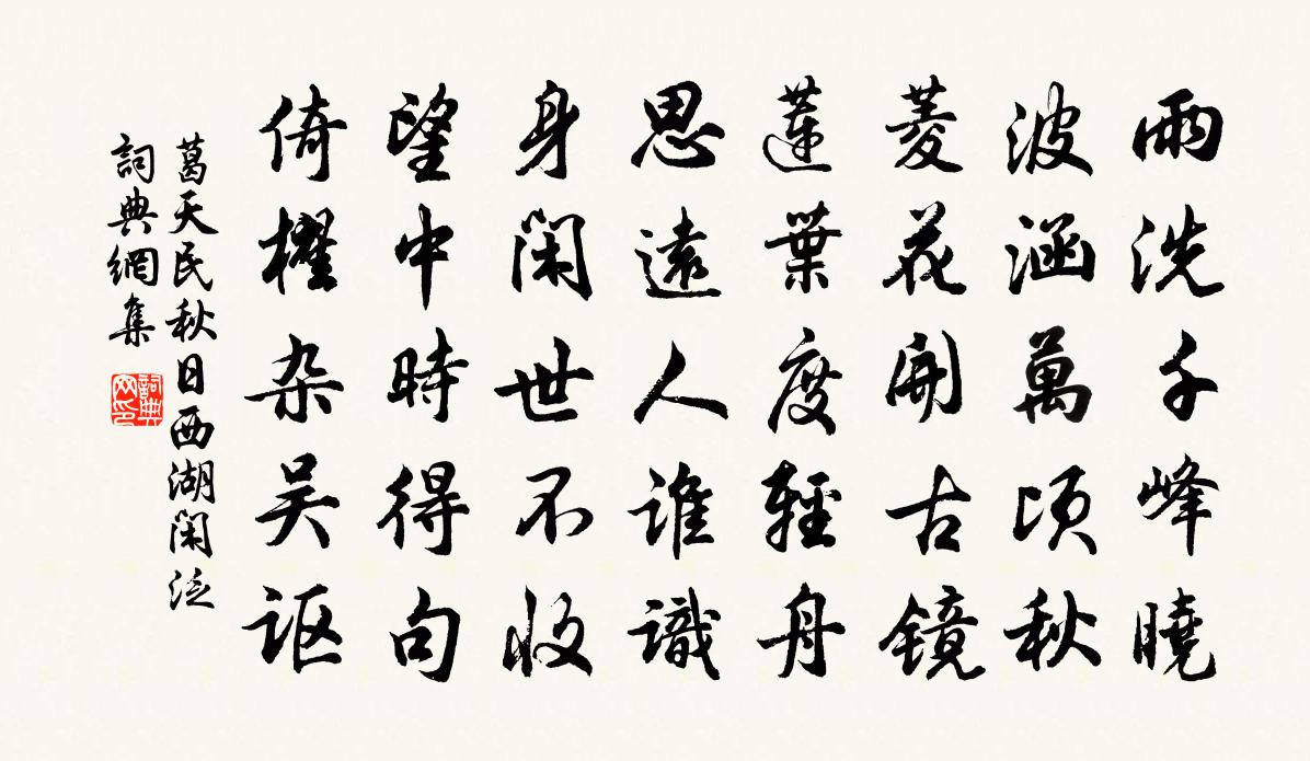 詩詞名句歷史字典書法欣賞書法字典國語詞典說文解字康熙字典古漢語字典標 題 作 者 詩 句 秋日西湖閒泛作者:葛天民 朝代:宋代秋日西湖閒泛原文雨洗千峰曉,波涵萬頃秋。菱花開古鏡,蓮葉度輕舟。思遠人誰識,身閒世不收。望中時得句,倚櫂雜吳謳。詩詞問答問:秋日西湖閒泛的作者是誰?答:葛天民問:秋日西湖閒泛寫於哪個朝代?答:宋代葛天民秋日西湖閒泛書法欣賞秋日西湖閒泛書法作品詩詞推薦感秋詠意白居易〔唐代〕炎涼遷次速如飛,又脫生衣著熟衣。繞壁暗蛩無限思,戀巢寒燕未能歸。須知流輩年年失,莫嘆衰容日日非。舊語再游南華有祖師衣缽曾豐〔宋代〕達磨將身帶履歸,殷勤分付缽和衣。更和衣缽將歸去,免與中原講是非。初暑陸游〔宋代〕槐陰清潤麥風涼,一枕閒眠晝漏長。山鵲喜晴當戶語,海桐帶露入簾香。酒緣久病常辭酌,茶為前銜偶得嘗。雲北答赴補同人劉克莊〔宋代〕莫厭春泥沒膝深,公卿皆拔自詞林。鵠袍肯在諸生列,蟲篆原非壯士心。山下久無吾屐齒,葦間忽聽子挐音。年來宿舒湖希上人房齊己〔唐代〕入寺先來此,經窗半在湖。秋風新菡萏,暮雨老菰蒲。任聽浮生速,能消默坐無。語來燈焰短,嘒唳發高梧。陳總領輓詩三首魏了翁〔宋代〕聞詔彈冠日,頹然禿鬢翁。當肩百鈞重,卷袂兩拳空。既上供軍最,方修給饟功。大鈞那可問,曾不愁留公。為王監簿先生求近詩楊萬里〔宋代〕林下詩中第一仙,西風吹到日輪邊。杜陵野客還驚市,國子先生小著鞭。拈出老謀開宇宙,本來清尚只雲泉。新篇浣溪沙晏幾道〔宋代〕唱得紅梅字字香,柳枝桃葉盡深藏。遏雲聲里送雕觴。才聽便拚衣袖濕,欲歌先倚黛眉長。曲終敲損燕釵梁。偈頌九十三首釋梵琮〔宋代〕除夜無可分歲,爐中燒些木榾。臭煙沖著鼻孔,面熱忽然噴嚏。殘年鈍悶,到此消除。新歲佛法,從此吉利。風雨歸舟圖家鉉翁〔宋代〕掛帆涉滄波,瞬息三萬里。蓬萊有會期,莫為風雨止。訴衷情佚名〔宋代〕黃昏新月一鉤纖。摸魚兒劉辰翁〔宋代〕想幼安、遼東歸後,自羞年少龍首。長安市上壚邊臥,枉卻快行家走。空兩袖。染醉墨淋漓,把似天香透。功名邂張公子行(一作古意)常建〔唐代〕日出乘釣舟,裊裊持釣竿。涉淇傍荷花,驄馬閒金鞍。俠客白雲中,腰間懸轆轤。出門事嫖姚,為君西擊胡。胡兵枯木竹石圖唐寅〔明代〕翠竹並奇石,蒼松留 * 。明窗坐相對,試問興如何。王祥徐鈞〔宋代〕臥冰得鯉供親養,至孝誠能上格天。每信天人常吻合,應知容谷響聲傳。己酉夏偶興汪莘〔宋代〕兩鏡手提如合璧,兩光相攝萬重光。重重樓閣重重戶,有個瞳人裹面藏。追和秦隱君辭薦之韻,上陳侯乞歸鳳山詹琲〔唐代〕誰言悅口是甘肥,獨酌鵝兒啖翠微。蠅利薄於青紙扇,羊裘暖甚紫羅衣。心隨倦鳥甘棲宿,目送征鴻遠奮飛。擊壤次韻子瞻系御史獄賦獄中榆槐竹柏竹蘇轍〔宋代〕故園今何有,猶有百竿竹。春雷起新萌,不放牛羊觸。雖無牛欄擁,不見紅塵辱。清風時一過,交戛響鳴玉。淵明再用前韻寄莘老蘇軾〔宋代〕君不見夷甫開三窟,不如長康號痴絕。痴人自得終天年,智士死智罪莫雪。困窮誰要卿料理,舉頭看山笏拄頰。野考試畢登銓樓梅堯臣〔宋代〕春雲濃淡日微光,雙闕重門聳建章。不上樓來知幾日,滿城無算柳梢黃。名句推薦晻靄寒氛萬里凝,闌乾陰崖千丈冰。岑參《天山雪歌送蕭治歸京》 語之所貴者意也,意有所隨。意之所隨者,不可言傳也。莊子《莊子·外篇·天道》 黃昏鼓角似邊州,三十年前上此樓。李益《上汝州郡樓》 慎在於畏小;智在於治大尉繚《尉繚子·十二陵》 吳興才人怨春風,桃花滿陌千里紅。李賀《送沈亞之歌·並序》 千載休談南渡錯,當時自怕中原復。文徵明《滿江紅·拂拭殘碑》 蓬頭稚子學垂綸,側坐莓苔草映身。胡令能《小兒垂釣》 良藥苦口利於病,忠言逆耳利於行。宋濂、王褘《元史·列傳·卷五十五》 曾逐東風拂舞筵,樂遊春苑斷腸天。李商隱《柳》 雁聲不到東籬畔,滿城但、風雨淒涼吳文英《惜黃花慢·菊》
