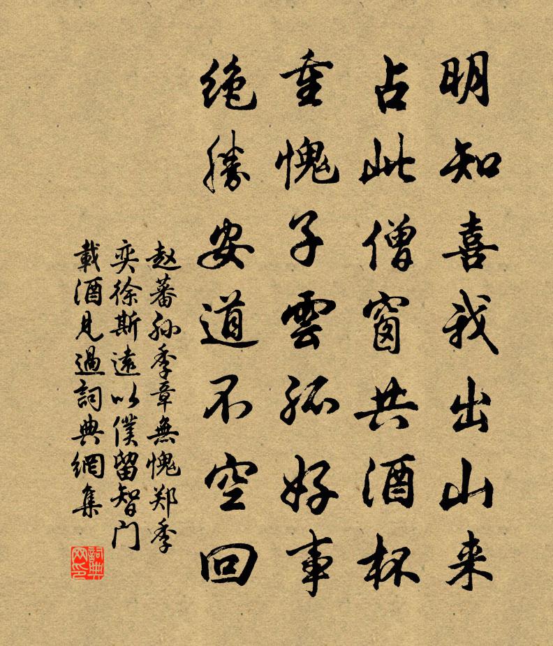 詩詞名句歷史字典書法欣賞書法字典國語詞典說文解字康熙字典古漢語字典標 題 作 者 詩 句 孫季章無愧鄭季奕徐斯遠以仆留智門載酒見過作者:趙蕃 朝代:宋代原文明知喜我出山來,占此僧窗共酒杯。重愧子云孤好事,絕勝安道不空回。詩詞問答問:《孫季章無愧鄭季奕徐斯遠以仆留智門載酒見過》的作者是誰?答:趙蕃問:該詩寫於哪個朝代?答:宋代書法欣賞孫季章無愧鄭季奕徐斯遠以仆留智門載酒見過書法作品詩文賞析【原題】:孫季章無愧鄭季奕徐斯遠以仆留智門載酒見過坐中雪作三詩詩詞推薦過臨平二首方回〔宋代〕行在名存一夢惺,西湖路近六長亭。陳橋驛與臨平鎮,興廢何人了汗青。示本上座釋心月〔宋代〕勿游魚魯刁刀市,莫逐千乾十卜人。他日有緣重會面,金毛獅子要嚬呻。贈逸民詩 七蕭衍〔南北朝〕念我棲遲。安步任心。夏興石泉。春遊香林。歡踰絲竹。樂過瑟琴。無疑無難。誰訶誰禁。百非不起。萬累俱沉。贈萬年胡主簿釋懷古〔宋代〕廉可繼懸魚,官清術有餘。民田侵廢苑,公署似間居。草長通囹圄,花飛落簿書。見君松操直,經考只如初。墅居文同〔宋代〕不復入城市,亂山圍一村。雲霞供幾席,水石佐琴樽。病久筋力緩,眠多頭日昏。無人來谷口,苔蘚上松門。江夏道中值雪王炎〔宋代〕嘆息謀身拙,棲遲簿領間。朔風吹密霰,瘦馬踏窮山。遊宦亦何好,浮生元自閒。去年溪上雪,高臥掩柴關。酬姚補闕南仲雲溪館中戲題隨書見寄清江〔唐代〕寺溪臨使府,風景借仁祠。補袞周官貴,能名漢主慈。臥雲知獨處,望月憶同時。忽枉緘中贈,瓊瑤滿手持。偈釋鼎需〔宋代〕頂門豎亞摩醯眼,肘後斜懸奪命符。瞎卻眼,卸卻符,趙州東壁掛葫蘆。憶越州王隨〔宋代〕賀監賜湖名價高,雲山吟賞抽江毫。澄波杳渺醉欲去,煙光水月留歸舠。京北原作賈島〔唐代〕登原見城闕,策蹇思炎天。日午路中客,槐花風處蟬。遠山秦木上,清渭漢陵前。何事居人世,皆從名利牽。武陵春(藤州江月樓)向滈〔宋代〕長記酒醒人散後,風月滿江樓。樓外煙波萬頃秋。高檻冷颼颼。想見雲鬟香霧濕,斜墜玉搔頭。兩處相思一樣愁。句黃康民〔宋代〕三山寶剎棲禪地,萬戶青簾賣酒家。又賦文天祥〔宋代〕驟雨知何處,一溪秋水生。苦吟肩鶴瘦,多病耳蟬鳴。隱几惟便睡,挑包正倦行。山深明月夜,乞我半窗清。寄韋珩柳宗元〔唐代〕初拜柳州出東郊,道旁相送皆賢豪。回眸炫晃別群玉,獨赴異域穿蓬蒿。炎煙六月咽口鼻,胸鳴肩舉不可逃。桂州舟中李流謙〔宋代〕帆風不飽櫓聲遲,正是波平月上時。今夜不知何處泊,買魚枯酒犒舟師。金剛隨機無盡頌如法受持分第十三釋印肅〔宋代〕善現重伸請,妙悟心清醒。實扣此經名,豈欲談虛境。送撫州錢郎中曾鞏〔宋代〕名郎元是足風流,得郡東南地更優。翠幕管弦三市晚,畫堂煙雨五峰秋。黃柑巧綴星垂檻,香稻勻翻雪滿甌。應與江村散步曹彥約〔宋代〕已落無邊木,猶誅不盡茅。沙逃迎遠景,風力鬧寒稍。牧處高低路,漁時遠近郊。竹籬茅舍外,門閉可推敲。題木蘭堂楊備〔宋代〕木蘭枝密樹仍高,堂下花光照節旄。列鼎重茵歌舞地,金章同色使君袍。西山蘭若試茶歌劉禹錫〔唐代〕山僧後檐茶數叢,春來映竹抽新茸。宛然為客振衣起,自傍芳叢摘鷹觜。斯須炒成滿室香,便酌砌下金沙水。驟雨名句推薦風含翠篠娟娟淨,雨裛紅蕖冉冉香。杜甫《狂夫》 碧水驚秋,黃雲凝暮,敗葉零亂空階。秦觀《滿庭芳·碧水驚秋》 一上高城萬里愁,蒹葭楊柳似汀洲。許渾《鹹陽城東樓 / 鹹陽城西樓晚眺 / 西門》 上醫醫國,其次疾人左丘明《國語·晉語·醫和視平公疾》 聞道故林相識多,罷官昨日今如何李頎《送陳章甫》 佳人獨立相思苦。薄袖欺寒脩竹暮。劉鎮《玉樓春·東山探梅》 漸老多憂百事忙,天寒日短更心傷。李覯《秋晚悲懷》 春色惱人眠不得,月移花影上欄乾。王安石《春夜》 欲把相思說似誰,淺情人不知。晏幾道《長相思·長相思》 不在其位,不謀其政。孔子弟子《論語·泰伯篇》