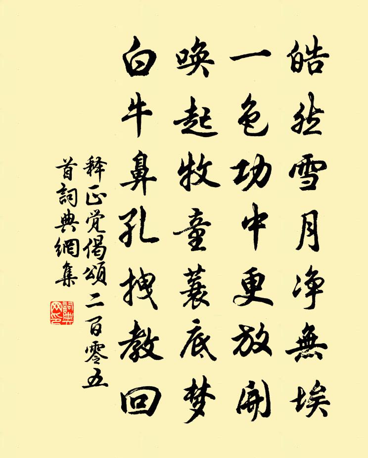 詩詞名句歷史字典書法欣賞書法字典國語詞典說文解字康熙字典古漢語字典標 題 作 者 詩 句 偈頌二百零五首作者:釋正覺 朝代:宋代偈頌二百零五首原文皓然雪月淨無埃,一色功中更放開。喚起牧童蓑底夢,白牛鼻孔拽教回。詩詞問答問:偈頌二百零五首的作者是誰?答:釋正覺問:偈頌二百零五首寫於哪個朝代?答:宋代釋正覺偈頌二百零五首書法欣賞偈頌二百零五首書法作品詩詞推薦春雪陳洪〔宋代〕光映妝樓月,花隨歌扇風。欲妒梅將柳,故落早春中。嘲賈似道汪宗臣〔宋代〕賈秋壑,魏公爵,台州鬼,揚州鶴。氣盈色驕逞才略,欺天罔人無愧怍。帷幄不能籌,金湯弗能作。費盡世間鐵,六州佚名〔宋代〕九龍輿。記春暮、幸蓬壺。瓊囿敞,繡仗趨。年華與逝水俱。瑤京遠,信息斷無。寶津池面落花鋪。愁晚容車來禁送同里昂上人釋行海〔宋代〕秋風何事趣歸期,人物淒涼渡欲垂。學道須從年少日,苦心直到歲寒時。近來鄉國無訊息,老去情懷怕別離。愧我答樂天見憶劉禹錫〔唐代〕與老無期約,到來如等閒。偏傷朋友盡,移興子孫間。筆底心無毒,杯前膽不豩。唯餘憶君夢,飛過武牢關。寫情二首張耒〔宋代〕人閒漏永報春暉,日過檐牙夢未回。隔夜雨飄梅蕊盡,入簾風卷柳花來。臘日宣詔幸上苑武則天〔唐代〕明朝游上苑,火急報春知。花須連夜發,莫待曉風吹。奉和虢州劉給事使君三堂新題二十一詠荷池韓愈〔唐代〕風雨秋池上,高荷蓋水繁。未諳鳴摵摵,那似卷翻翻。梅花引余觀復〔宋代〕耨銀雲,鋤璧月,栽得寒花寄愁絕。陽和一點來天要,春滿江南誰漏泄。珊瑚作樹玉為膚,沉水薰香檀吐屑。野橋白鶴姚勉〔宋代〕白鶴有奇質,從古巢神仙。飢餐必瑤草,渴飲惟瓊泉。朝飛閬苑霞,莫宿炎洲煙。一從落塵埃,六翮翦不全。身居述己嘆於濆〔唐代〕不長不成人,及長老逼身。履善本求樂,及善尤苦辛。如何幽并兒,一箭取功勳。以勸分出伏龍因謁武侯廟李曾伯〔宋代〕廬存龍去跡成非,草木空山聖得知。成敗論人陳壽史,功名余恨少陵詩。初心何只三分漢,偉略徒夸十倍丕。半夜應百里李天益來求作奉川十詠似之石夫人陳著〔宋代〕千尺嶙峋直立形,流傳神應挾風霆。石身本聚山川氣,便是人心聚處靈。贈劉子卿時劉將赴官鎮江並以道別三首趙蕃〔宋代〕江驛頻臨我,林園屢過公。只言成遂別,何意復來同。有用期思勉,無詩枉坐窮。舊聞京口酒,準擬醉孤蓬。和梲弟矮松寺留題蘇頌〔宋代〕曲乾隱騰蛇,樛枝展翠華。何年喬嶽種,移植法王家。得地煙雲潤,盤根歲月賒。縱橫齊殿角,偃蹇拂檐牙。數粒李子永惠道中詩卷韓元吉〔宋代〕踏雪沖寒遍幾州,豈妨乘興作清游。風橫白鷺歌瓊樹,月滿青山問釣舟。夢繞征途渾歷歷,老諳世事總悠悠。塵埃送朱相士朱文昭族孫雲得劉碧雲相法葉適〔宋代〕南盪書林長砌蘿,碧雲鞋底曬庭莎。從今湖海須行遍,眼法雖親要看多。題寒光雪嶂圖陳造〔宋代〕噎寒流覆絕壁,君才得想像間。輸我一庵漁浦,雪中真看江山。減字木蘭花蘇軾〔宋代〕憑誰妙筆。橫掃素縑三百尺。天下應無。此是錢塘湖上圖。一般奇絕。雲淡天高秋夜月。費盡丹青。只這些兒畫不思故人蘇泂〔宋代〕故人不可見,書札報平安。 * 誰能折,青山獨自看。雨生南浦足,秋入五湖寬。歲晚無多事,相看把釣竿。名句推薦荷風送香氣,竹露滴清響。孟浩然《夏日南亭懷辛大》 繞池閒步看魚游,正值兒童弄釣舟。白居易《觀游魚》 夜雪初霽,薺麥彌望。姜夔《揚州慢·淮左名都》 以小人尚民而威,以非所取於民而巧,是傷國之大災也。荀子《荀子·王霸》 心似已灰之木,身如不系之舟。蘇軾《自題金山畫像》 霜風漸欲作重陽,熠熠溪邊野菊香。蘇軾《捕蝗至浮雲嶺山行疲苶有懷子由弟二首·其二》 理郁者苦貧,辭溺者傷亂劉勰《文心雕龍·神思》 得言不可以不察。數傳而白為黑,黑為白。呂不韋《呂氏春秋·論·慎行論》 林下春晴風漸和,高崖殘雪已無多。王守仁《春晴》 紙上得來終覺淺,絕知此事要躬行。陸游《冬夜讀書示子聿》