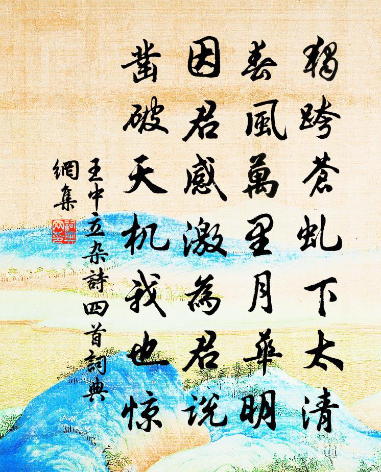 詩詞名句歷史字典書法欣賞書法字典國語詞典說文解字康熙字典古漢語字典標 題 作 者 詩 句 雜詩四首作者:王中立 朝代:宋代雜詩四首原文獨跨蒼虬下太清,春風萬里月華明。因君感激為君說,鑿破天機我也驚。詩詞問答問:雜詩四首的作者是誰?答:王中立問:雜詩四首寫於哪個朝代?答:宋代王中立雜詩四首書法欣賞雜詩四首書法作品詩詞推薦驀山溪(次韻知點)廖剛〔宋代〕論長校短,總是非閒譽。光景百年中,似難留、長江東去。隨緣遊戲,觸□寄高情,西樓月,北窗風,鸖鵒尊前舞思歸舊隱周敦頤〔宋代〕靜思歸舊隱,日出半山晴。醉榻雲籠潤,吟窗瀑瀉清。閒方為達士,忙只是勞生。朝市誰頭白,車輸未曉鳴。上許州呂相公嗣崧許康詩二首嗣崧詩宋祁〔宋代〕帝告於公,紹胥爾宇。憲是文武,如申如甫,為周之輔。誕錫爾祉,惟申甫是似。乘車錯衡,淑施英英,式遄其榮贊徑山音首座釋鹹傑〔宋代〕氣宇雲閒,身心木槁。頂門正眼,紅日杲杲。早投長蘆劃草之機,晚分雙徑人天之座。名山屢招而不赴,一庵超然送育維那釋行機〔宋代〕克賓一字入公門,有理難伸笑 * 。隱靜不行興化令,他年誰道棒頭親。已亥雜詩 44龔自珍〔清代〕毫霜擲罷倚天寒,任作淋漓淡墨看。何敢自矜醫國手,藥方只販古時丹。二郎神湯恢〔宋代〕瑣窗睡起,閒佇立、海棠花影。記翠楫銀塘,紅牙金縷,杯泛梨花冷。燕子銜來相思字,道玉瘦、不禁春病。應蝶臘月二日攜家城東觀梅夜歸張栻〔宋代〕晴日東山飽看花,歸來野路已昏鴉。坡頭認得疎籬處,檐卜林中李老家。沅陵見招賞海棠病不能往輒爾言謝三首趙蕃〔宋代〕四海知名蜀海棠,是邦元與蜀同方。少陵當日猶無語,而我何人敢漫狂。春日二首呈黃子邁大卿戴復古〔宋代〕野人何得以詩鳴,落魄騎驢走帝京。白髮半頭驚歲月,虛名一日動公卿。頗思湖上春風約,不柰樓頭夜雨聲。柳外謁金門(題建昌城樓)劉塤〔宋代〕雲薄薄。人靜黃梅院落。細數花期並柳約。新愁沾一握。夢醒從前多錯。寄恨畫檐靈鵲。明月欲西天寂寞。魂銷連贈王生姚勉〔宋代〕三年刻楮多苦心,不龜手方只百金。近來自笑巧成拙,捨去二藝趨雞林。文章小巧蟲雕刻,大巧天機五雲色。單傳次韻答少章陳師道〔宋代〕秦郎淮海士,才大難為弟。蔚然霜雪後,不受江漢洗。春畦不滿眼,采掇到芹薺。多病促餘年,秋光欲辭抵。儒林夏日西湖閒居十首汪莘〔宋代〕一曲波光徹太虛,四垂碧漢罩湖魚。遊人眼被荷花礙,不覺琉璃泡裹居。後江行十絕岳珂〔宋代〕叫著漁郎急掉頭,一聲別浦聽蓮謳。山遙水遠應同趣,我亦青簾問酒樓。耕圖二十一首簸揚樓璹〔宋代〕臨風細揚簸,糠粃零風前。傾瀉雨聲碎,把翫玉粒圓。短裙箕帚婦,收拾亦已專。豈圖較斗升,未敢忘凶年。武林春日二絕蘇籀〔宋代〕何人亹亹共揮麈,有物娟娟散百花。不向箇中吟蓓蕾,久晴風日漲塵沙。答裴評事澄荻花間送梁肅拾遺皎然〔唐代〕波上荻花非雪花,風吹撩亂滿袈裟。如今歲晏無芳草,獨對離樽作物華。新豐道中林景熙〔宋代〕長飈卷炎埃,澄空出秋素。迢迢鐵瓮城,回首隔蒼霧。酒帘颺荒市,笳鼓發深戍。倚逢問舟人,雲是新豐路。籬路癸未御前帖子三首曹勛〔宋代〕聖君英略凜橫秋,十萬偏師奉睿謀。一日已聞三奏捷,版圖行見復神州。名句推薦殘酒憶荊高,燕趙悲歌事未消。陳維崧《南鄉子·邢州道上作》 風雨滿城,何幸兩重陽之近;文天祥《回董提舉中秋請宴啟》 逃生不避路,到處便為家。施耐庵《水滸傳·第三回》 高處鶯啼低蝶舞。何況日長,燕子能言語。劉鉉《蝶戀花·送春》 離心何以贈,自有玉壺冰。駱賓王《送別》 聚斂者,召寇、肥敵、亡國、危身之道也荀子《荀子·王制》 若順吾皇意,即無臣子心。棲蟾《送遷客》 道由白雲盡,春與青溪長。劉昚虛《闕題》 只恐夜深花睡去,故燒高燭照紅妝。蘇軾《海棠》 外亂而內整,示飢而實飽,內精而外鈍。姜子牙《六韜·文韜·兵道》