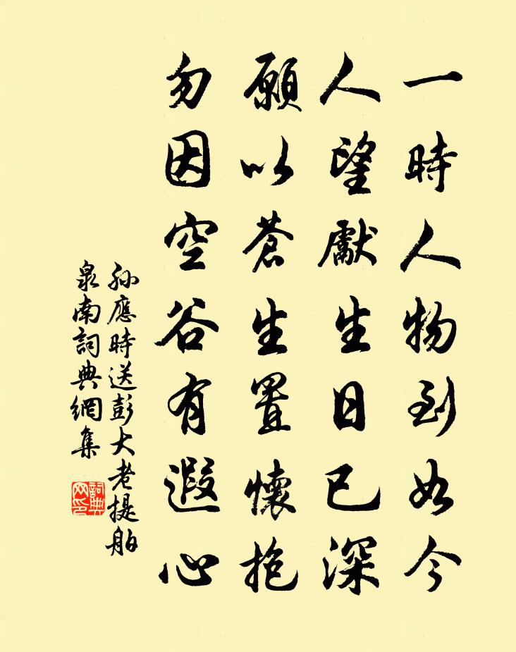 詩詞名句歷史字典書法欣賞書法字典國語詞典說文解字康熙字典古漢語字典標 題 作 者 詩 句 送彭大老提舶泉南作者:孫應時 朝代:宋代送彭大老提舶泉南原文一時人物到如今,人望先生日已深。願以蒼生置懷抱,勿因空谷有遐心。詩詞問答問:送彭大老提舶泉南的作者是誰?答:孫應時問:送彭大老提舶泉南寫於哪個朝代?答:宋代孫應時送彭大老提舶泉南書法欣賞送彭大老提舶泉南書法作品詩詞推薦瑞鷓鴣鄧肅〔宋代〕北書一紙慘天容。花柳春風不敢穠。未學宣尼歌鳳德,姑從阮籍哭途窮。此身已落千山外,舊事回思一夢中。何日和楊鐵庵送子監鎮之任韻五首姚勉〔宋代〕君家遺子籝,只在一卷書。四世續科第,積善慶有餘。乃翁一片心,秋月行太虛。宜哉有是子,大似回不愚。春草二首楊萬里〔宋代〕年年春色屬垂楊,金捻千絲翠萬行。今歲草芽先得計,攙它濃翠奪它黃。放翁自贊陸游〔宋代〕遺物以貴吾身,棄智以全吾真。劍外江南,飄然幅巾。野鶴駕九天之風,澗松傲萬木之春。或以為跌宕湖海之士,頌古五首釋妙倫〔宋代〕草舍柴門僻更幽,何期過客也經由。蒿湯備禮不知愧,猶對傍人賣口頭。己亥十月送成父弟絜兩戶幼累歸玉山五首趙蕃〔宋代〕誤身何必嘆儒冠,粗糲須甘苜蓿盤。瓜地可耕歸獨負,未應真坐縛微官。吊岳文二公二首何夢桂〔宋代〕擬吊英雄酒一觴,二公什膽一冰霜。金人未殄將軍死,宋事無成國土亡。湖上黃埃寒柏慘,沙場青血夜燐光。生芻錢塘府亭羅隱〔唐代〕新恩別啟館娃宮,還拜吳王向此中。九牧土田周制在,兩藩茅社漢儀同。春生舊苑芳洲雨,香入高台小徑風。更有余得石山二座西南道李監場索之附海船歸三山曾豐〔宋代〕長料負山人不多,眼中今失兩嵯峨。非渠偶有夸娥力,如我太行王屋何。題賈儼不忘室葉適〔宋代〕賈子好脩士,躬耕鹿岩阿。茂木俯青泉,幽處堪逶迤。有室淨棐幾,圖史參前羅。獨能取我語,標榜相巍峨。我語古風其十九李白〔唐代〕西嶽蓮花山。 迢迢見明星。素手把芙蓉。虛步躡太清。霓裳曳廣帶。飄拂升天行。邀我登雲台。高揖衛叔卿。恍次韻和復古春日五絕句司馬光〔宋代〕雪霜衰鬢拔還生,桃李新園長未成。五十尚能勝六十,今年又減去年情。遺直堂曾幾〔宋代〕老柏蜀人愛,甘棠召南思。領客清樾下,作詩詠歌之。句諶祜〔宋代〕舊者今不見,今者舊不知。萬古明月在,千山黃雲飛。昭君冢蔣吉〔唐代〕曾為漢帝眼中人,今作狂胡陌上塵。身死不知多少載,冢花猶帶洛陽春。八月二十九日宿懷趙嘏〔唐代〕秋天睛日菊還香,獨坐書齋思已長。無奈風光易流轉,強須傾酒一杯觴。新雪八韻(一作閒居新雪)薛能〔唐代〕大雪滿初晨,開門萬象新。龍鍾雞未起,蕭索我何貧。耀若花前境,清如物外身。細飛斑戶牖,乾灑亂松筠。正色新除廣東常平之節感恩書懷楊萬里〔宋代〕巳愧雙旌古晉陵,更堪一節古羊城。偶逢舊治年頻熟,忽署新銜手尚生。山與君恩誰是重?身如秋葉不勝輕。向來感皇恩王庭珪〔宋代〕羸馬怯征鞍,駸駸欲驟。昨夜文星動南斗。廣寒宮近,欲上煙霄攜手。素娥不奈冷,淒涼久。知是謫仙,肝腸錦繡端午三首趙蕃〔宋代〕忠言不用竟沉死,留得文章星斗羅。何意更觴昌歜酒,為君擊節一長歌。名句推薦誠者,天之道也;思誠者,人之道也。孟子《孟子·離婁章句上·第十二節》 無半點閒愁去處,問三生醉夢何如。喬吉《折桂令·七夕贈歌者》 巧笑倩兮,美目盼兮。佚名《碩人》 漁舟逐水愛山春,兩岸桃花夾古津。王維《桃源行》 人情似紙張張薄,世事如棋局局新。佚名《增廣賢文·上集》 君者,舟也;庶人者,水也。水則載舟,水則覆舟。荀子《荀子·哀公》 事雖小,勿擅為。苟擅為,子道虧。李毓秀《弟子規·入則孝》 溪深古雪在,石斷寒泉流。李白《尋高鳳石門山中元丹丘》 松樹千年終是朽,槿花一日自為榮。白居易《放言五首·其五》 不信比來長下淚,開箱驗取石榴裙。武則天《如意娘》