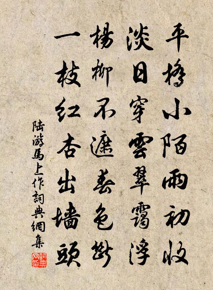 詩詞名句歷史字典書法欣賞書法字典國語詞典說文解字康熙字典古漢語字典標 題 作 者 詩 句 馬上作作者:陸游 朝代:宋代馬上作原文平橋小陌雨初收,淡日穿雲翠靄浮。楊柳不遮春色斷,一枝紅杏出牆頭。詩詞問答問:馬上作的作者是誰?答:陸游問:馬上作寫於哪個朝代?答:宋代問:陸游的名句有哪些?答:陸游名句大全陸游馬上作書法欣賞馬上作書法作品詩詞推薦酹江月/念奴嬌周紫芝〔宋代〕冰輪飛上,正金波翻動,玉壺新綠。風帽還猗清露滴,凜凜微生寒粟。白玉樓高,水精簾卷,十里堆瓊屋。千山人上崔十五老丈劉商〔唐代〕天漢乘槎可問津,寂寥深景到無因。看花獨往尋詩客,不為經時謁丈人。痴頑不識字歌許歌節來詩有此句因以名篇林光朝〔宋代〕平生讀書,如風過耳。歲月共流轉,如磨復如蟻。一如人嚼蠟,而不見其味。又如弄孤杵,連夜不成米。又如過羊涌月僧樓趙希桐〔宋代〕百尺闌乾右櫟林,亂山如浪翠痕深。冰輪飛上光猶濕,照破西來一片心。有感葛立方〔宋代〕但知鬼目為芝草,誰信羚羊破佛牙。娘子阿姨何處辨,時人識賣假金家。送范至能帥桂林李洪〔宋代〕口伐奇謀讋可汗,歸來猶著侍臣冠。燧林草色供詩思,鳳沼春波灩筆端。誰謂玉堂真學士,暫臨桂管小長安。元戎登屋後城袁說友〔宋代〕笑傲愁如失,登臨酒半醒。故將雙眼碧,割斷半山青。土沃差宜竹,城高未著亭。可人東郭外,綃翠舞娉婷。和子進千春院觀桃花二首范祖禹〔宋代〕西度天津水見沙,輕風飛蓋綠楊斜。相逢喜到千春寺,最後方開第一花。富媼英華當閒出,東君照育想非賒。神仙送元伯西歸黃庶〔宋代〕飲者為量無大小,要於醉焉而已矣。乃知一飲一石徒,醉鄉欲到無幾爾。我幸俸薄飲不多,酩酊造次有餘味。有時秋夕詩鮑照〔南北朝〕慮涕擁心用。夜默發思機。幽閨溢涼吹。閒庭滿清暉。紫蘭花已歇。青梧葉方稀。江上淒海戾。漢曲驚朔霏。發斑曉發黃池過寧國吳龍翰〔宋代〕簇簇人煙兩岸分,暫時掛搭此行程。一筇風月無拘束,又復挑詩到宛城。十八夜宿秀城外趙蕃〔宋代〕月子彎彎四面歌,扁舟今夜泊嘉禾。頗欲歌呼起相和,一聲軋軋又前波。句李畋〔宋代〕紅沽村落酒,肥鱠海鄉魚。挽包顒叟陳傅良〔宋代〕翁子看時輩,平生不妄賢。獨於公有誄,誰恐世無傳。他日須深刻,吾詩可附聯。草黃松柏禿,名與石巋然。李司直會客吳運乾有詩次韻戴復古〔宋代〕使君高會集群仙,也使狂夫坐細氈。白璧一雙酬議論,青春十載棹觥船。客愁遇酒退三舍,梅信與春開一先。已辦偈頌十九首釋紹曇〔宋代〕大地蹭翻無寸土,昆蟲介甲絕行蹤。護生禁足元勛在,圓覺伽藍一掃空。夏夜陸游〔宋代〕山崦風生鵩嘯悲,柴門月上樹陰移。熏衣汗雨初乾後,把卷蚊雷不動時。孤悶難禁終歲病,浮生易滿百年期。釣竿芭蕉仕女圖唐寅〔明代〕佳人春睡倚含章,一瓣梅花點額黃。起對鏡自添百媚,至今都學壽陽妝。趙庸齋為程生作梅窗二字因為之賦胡仲弓〔宋代〕作賦何如宋廣平,吟詩誰是老逋清。庸翁不喜詩兼賦,寫與閒人作美名。食淡戴表元〔宋代〕世亂謀生拙,村深食淡能。沙蔬羹白煮,山稻飯紅蒸。暑豉方傳友,寒糟共學僧。庖廚尚如此,未嘆室生冰。名句推薦步轉迴廊,半落梅花婉娩香。蘇軾《減字木蘭花·春月》 晚來天欲雪,能飲一杯無?白居易《問劉十九》 昔嘆當年無李牧,今知江左有夷吾陳亮《送文子轉漕江東二首》 日暖桑麻光似潑,風來蒿艾氣如薰。蘇軾《浣溪沙·軟草平莎過雨新》 力拔山兮氣蓋世。時不利兮騅不逝。項羽《垓下歌》 仙人琪樹白無色,王母桃花小不香。白居易《牡丹芳》 井灶有遺處,桑竹殘朽株。陶淵明《歸園田居·其四》 古人忠孝,不離心頭,今人忠孝,不離口頭,此是何等志量。王永彬《圍爐夜話·第二三則》 為有雲屏無限嬌,鳳城寒盡怕春宵。李商隱《為有》 半夜銜枚,滿城深雪,忽已亡懸瓠。李綱《念奴嬌·憲宗平淮西》