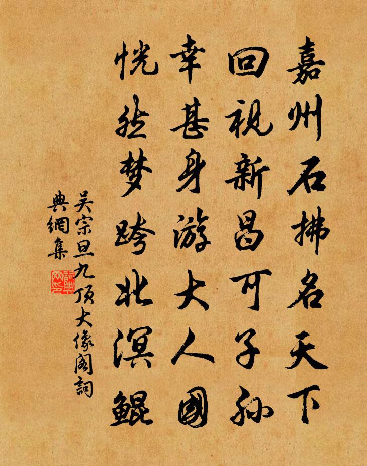 詩詞名句歷史字典書法欣賞書法字典國語詞典說文解字康熙字典古漢語字典標 題 作 者 詩 句 九頂大像閣作者:吳宗旦 朝代:宋代九頂大像閣原文嘉州石拂名天下,回視新昌可子孫。幸甚身游大人國,恍然夢跨北溟鯤。詩詞問答問:九頂大像閣的作者是誰?答:吳宗旦問:九頂大像閣寫於哪個朝代?答:宋代吳宗旦九頂大像閣書法欣賞九頂大像閣書法作品詩詞推薦水宿項安世〔宋代〕水納乾坤淨,窗通左右涼。船門如引索,直面看波光。理學衛宗武〔宋代〕寥寥二千載,道統幾欲墜。濂洛既關中,浚源接洙泗。乾淳諸大儒,流派何以異。無極而及極,性命發其秘。先天西溪見牡丹范仲淹〔宋代〕陽和不擇地,海角亦逢春。憶得上林色,相看如故人。黃梅五首陳師道〔宋代〕黃里含真意,春容帶薄寒。欲知誰稱面,遍插一枝看。賀雨李處權〔宋代〕太歲治水十二龍,春夏用事秋罔功。半年不雨人作惡,禾苗枯槁井泉涸。使君勤政首勤農,憂國如家願年豐。齋居故林偶作貫休〔唐代〕朗吟無一事,孤坐瀔江濆。媚世非吾道,良圖有白雲。蠹魚開卷落,啄木隔花聞。唯寄壺中客,金丹許共分。旋師喜捷李隆基〔唐代〕邊服胡塵起,長安漢將飛。龍蛇開陣法,貔虎振軍威。詐虜腦塗地,征夫血染衣。今朝書奏入,明日凱歌歸。久雨五首劉克莊〔宋代〕噫聲初發竅,巨浸條漫空。我欲鐫箕畢,為天節雨風。逍遙詠宋太宗〔宋代〕剛氣縱橫合,無人到所思。浮生看即易,至理杳難知。返覆因興念,恆持入遠期。孤雲霄漢外,花見晚霜悲。偈五首釋彌光〔宋代〕一九與二九,相逢不出手。凍得鴟吻頭,面南看北斗。諸禪人,曉不曉,地爐火冷莫嫌寒,更有樵夫赤腳走。廣修院陳岩〔宋代〕別去招提恰十霜,幾番夢到五峰堂。有懷此地同僧夏,對佛閒燒結願香。水調歌頭(丁亥重陽登益昌二郎廟樓)李曾伯〔宋代〕老子世北客,家本住吳頭。登臨聊復爾耳,佳節懶為酬。剛被西風斷送,又為黃花牽帥,草創作斯游。目力眇無際贈人二首(一作贈工部郎中)王建〔唐代〕金爐煙里要班頭,欲得歸山可自由。每度報朝愁入閣,在先教示小千牛。多在蓬萊少在家,越緋衫上有紅霞。朝回十絕句寄趙帥陳造〔宋代〕醉中記得新翻譜,土苴梁州笑石州。火急歸來傳好事,為渠一洗世間愁。矮齋雜詠二十首宿溪上華岳〔宋代〕夢回斜月掛林端,酒力初消怯夜寒。何處客舟猶未泊,一聲柔櫓過前灘。跋漁村晚景瀟湘夜雨圖方翥〔宋代〕雲昏雨暗黃蘆渚,沙磧風高人斷渡。一葉扁舟忽下來,落日還收釣筒去。收盡沙頭白鳥飛,蒹葭暮雪滿蓑衣。千門九月二十日微雪懷子由弟二首蘇軾〔宋代〕岐陽九月天微雪,已作蕭條歲暮心。短日送寒砧杵急,冷官無事屋廬深。愁腸別後能消酒,白髮秋來已上簪。近買沁園春(代人上吳履齋集賢壽)張榘〔宋代〕綠野歸來,筇杖角巾,豈不快哉。有清泉白石,東西岩岫,翠陰紅影,高下樓台。況是蕤賓,槐庭暑薄,照眼葵榴丙戌五日京師作二首王安石〔宋代〕浮雲離披久不合,太陽獨行乾萬物。誰令昨夜雨霶沱,北風蕭蕭寒到骨。同曾景建金陵登覽戴復古〔宋代〕興廢從誰問,雲煙過眼空。吁嗟六朝事,想像半山翁。百景饒君詠,三杯許我同。登臨無限意,多在夕陽中。名句推薦砌下落梅如雪亂,拂了一身還滿。李煜《清平樂·別來春半》 水來土掩,兵到將迎。施耐庵《水滸傳·第二十回》 聽元宵,往歲喧譁,歌也千家,舞也千家。王磐《古蟾宮·元宵》 慟哭六軍俱縞素,衝冠一怒為紅顏。吳偉業《圓圓曲》 落月滿屋樑,猶疑照顏色。杜甫《夢李白二首·其一》 疲馬山中愁日晚,孤舟江上畏春寒。張謂《杜侍御送貢物戲贈》 半夜呼兒趁曉耕,羸牛無力漸艱行。顏仁郁《農家》 花明月暗籠輕霧,今宵好向郎邊去。李煜《菩薩蠻·花明月暗籠輕霧》 晚年唯好靜,萬事不關心。王維《酬張少府》 物莫非指,而指非指。公孫龍《公孫龍子·指物論》
