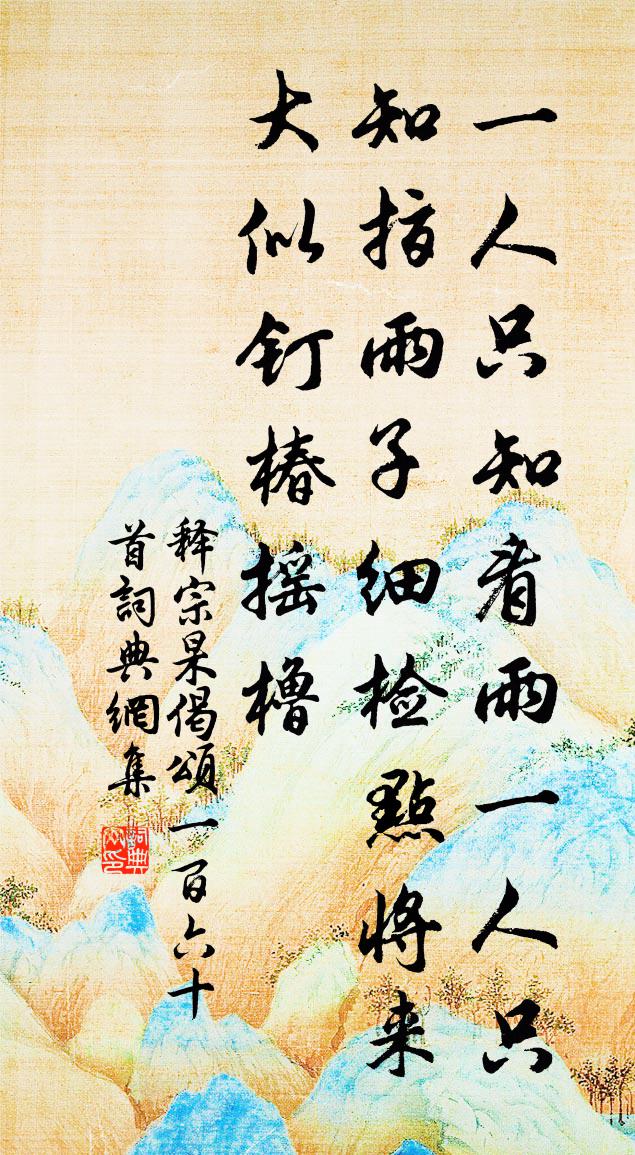 詩詞名句歷史字典書法欣賞書法字典國語詞典說文解字康熙字典古漢語字典標 題 作 者 詩 句 偈頌一百六十首作者:釋宗杲 朝代:宋代偈頌一百六十首原文一人只知看雨,一人只知指雨。子細檢點將來,大似釘椿搖櫓。詩詞問答問:偈頌一百六十首的作者是誰?答:釋宗杲問:偈頌一百六十首寫於哪個朝代?答:宋代釋宗杲偈頌一百六十首書法欣賞偈頌一百六十首書法作品詩詞推薦菩薩蠻(照溪)侯置〔宋代〕江梅占盡江頭雪。忍寒玉骨夸清絕。不似杜秋娘。婆娑秋水傍。波光涵晚日。照影從教密。隱隱認遙黃。隔溪十里溪亭夜集走筆胡仲弓〔宋代〕倚柱看潮生,漁歌靜中發。吟罷寂無聲,江風對山月。蘭陵王施岳〔宋代〕柳花白。飛入青煙巷陌。憑高處,愁鎖斷橋,十里東風正無力。西湖路咫尺。猶阻仙源信息。傷心事,還似去年,琴枕釋師範〔宋代〕巧出焦桐樣,淳含太古音。多因和夢聽,只作夜蟲吟。題賈島墓安錡〔唐代〕倚恃才難繼,昂藏貌不恭。騎驢沖大尹,奪卷忤宣宗。馳譽超先輩,居官下我儂。司倉舊曹署,一見一心忡。和秋房題半湖樓二首朱繼芳〔宋代〕天目飛來第幾峰,峰前著屋貯虛空。濕雲低亞鉤欄角,缺月斜窺戶牖中。一水東西添柳岸,兩山南北欠樵風。住家朧月梅堯臣〔宋代〕夜晴初見月,雲薄未分明。高樹尚無影,遠鴻時有聲。下階嫌履濕,閉戶認苔生。寂寂牆陰暝,更長已漸傾。惠文伯居士請贊釋崇岳〔宋代〕行腳不到廬山,住院只在江浙。偏要冷笑諸方,忘卻自家百拙。討便宜,破邪說。一錐一劄,不妨凜冽。贈洞霄道士戴復古〔宋代〕高枕清流臥白雲,靈龜骨相鶴精神。凡為九煉山中客,定是群仙數內人。馴虎岩前攀逸翠,□蚊亭下濯征塵。練師挽吏部石似之虞儔〔宋代〕憂國囊封豈是疎,有才無命信何如。風回冊府三山遠,星殞郎牆一位虛。賈誼自傷終太傅,薛收若在必中書。哀哉次韻楊廷秀郎中游西湖十絕喻良能〔宋代〕湖堤樓閣劇蜂房,樓上爭看湖上航。萬柄芙蓉清冉冉,臨風新折麝臍香。柳梢青張孝祥〔宋代〕草底蛩吟。煙橫水際,月澹松陰。荷動香濃,竹深涼早,銷盡煩襟。發稀渾不勝簪。更客里、吳霜暗侵。富貴功名題耆英圖趙文〔宋代〕耆英會上十三人,當時世道如初春。洛陽牡丹非昔比,妖怪百出年年新。我見此圖淚如雨,諸老翩然過何許。何時淳熙三年發皇后冊寶十三首佚名〔宋代〕窈窕沾淑女,行六服兮。陟降多德,從群目兮。內治允德,陰教肅兮。宜君宜王,綏有福兮。曉晴肩輿至湖上陸游〔宋代〕多稼如雲獲並空,牛闌樵擔畫圖中。梧桐已逐晨霜盡,烏臼猶爭夕照紅。脫網噞喁奔遠浦,避鷹撲握保深叢。旗亭擬九頌峨峰書院程公許〔宋代〕修眉兮連娟,曼翠靄兮麻源。君門獰兮九虎,蹇予留兮三年。三峨之山兮遠萬里,見似人兮胡不喜。半輪秋兮促公贈李祐道人(一作贈道士)貫休〔唐代〕闒茸復埃塵,難親復易親。皆疑有仙術,問著卻愁人。只是耽浮蟻,曾雲見泣麟。相逢先合手,渾似有前因。客有傳黃戎州三絕句者因次韻晁說之〔宋代〕驢技已過目,戎衣方駭心。文章端自誤,痛悔空在今。小園桃熟張埴〔宋代〕老子廬東信手栽,今經亂後帝累累。天風暗拽雲裳裉,曉日濃潮酒臉回。向上可憐無佞處,從旁只恐有偷來。清晨次韻梅山弟靜中大觀陳著〔宋代〕默默融融內自觀,紛紛藉藉外何關。託言鵬化未為大,相與鳶飛方是閒。萬古乾坤全易上,四時風月小詩閒。天寒名句推薦古之史也辯道,今之史也耀文。王通《中說·卷三·事君篇》 救人須救急,施人須當厄。馮夢龍《醒世恆言·卷十》 人有悲歡離合,月有陰晴圓缺,此事古難全。蘇軾《水調歌頭·丙辰中秋》 獨立雕欄,誰憐枉度華年。王沂孫《高陽台·殘萼梅酸》 兩行疏柳,一絲殘照,萬點鴉棲。劉基《眼兒媚·秋思》 絕代有佳人,幽居在空谷。杜甫《佳人》 碧野朱橋當日事,人不見,水空流。秦觀《江城子·西城楊柳弄春柔》 千里澄江似練,翠峰如簇。王安石《桂枝香·登臨送目》 蜃散雲收破樓閣,虹殘水照斷橋粱。白居易《江樓晚眺景物鮮奇吟玩成篇寄水部張員外》 相顧無相識,長歌懷採薇。王績《野望》