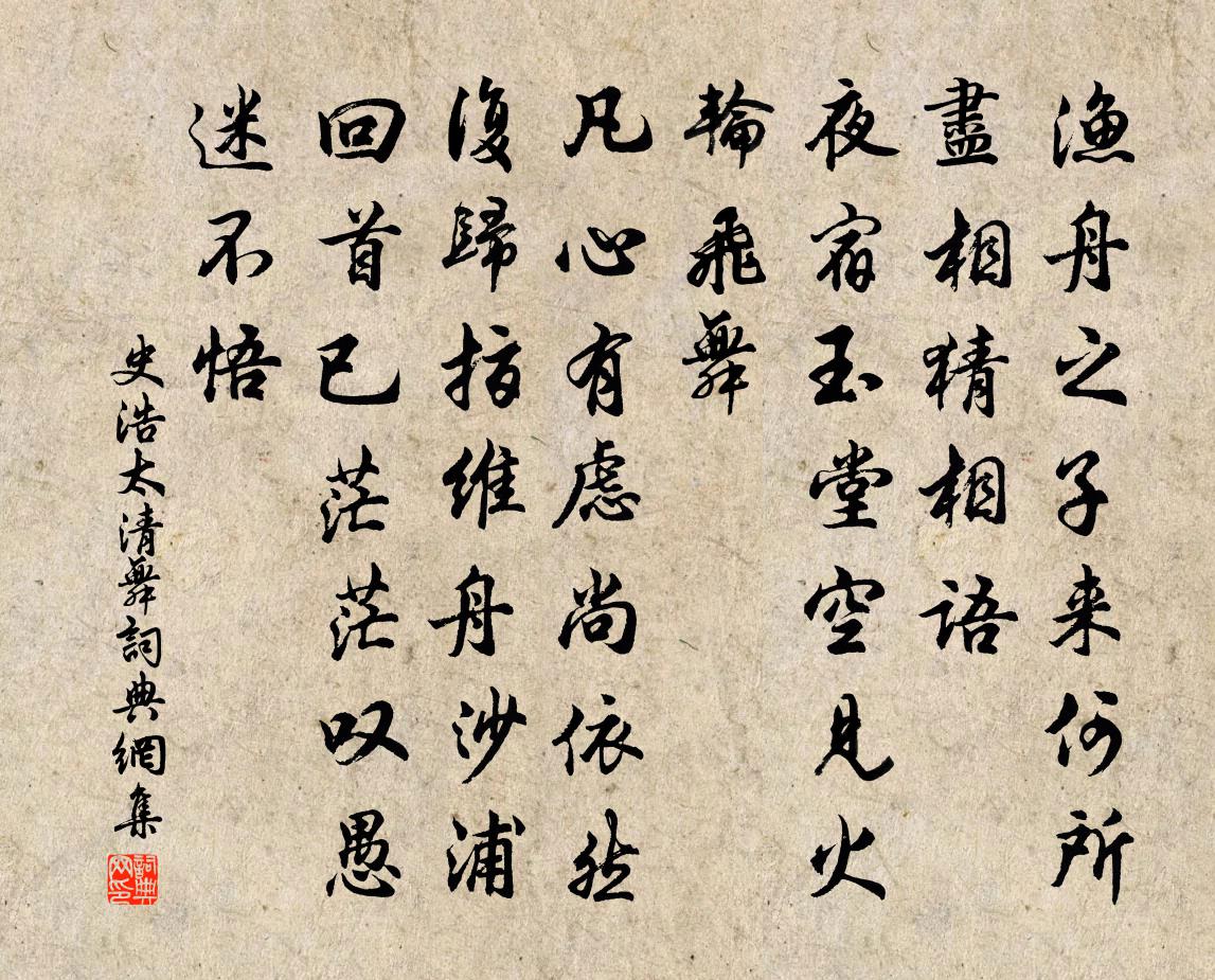 詩詞名句歷史字典書法欣賞書法字典國語詞典說文解字康熙字典古漢語字典標 題 作 者 詩 句 太清舞作者:史浩 朝代:宋代太清舞原文漁舟之子來何所。盡相猜相語。夜宿玉堂空,見火輪飛舞。凡心有慮尚依然,復歸指、維舟沙浦。回首已茫茫,嘆愚迷不悟。詩詞問答問:太清舞的作者是誰?答:史浩問:太清舞寫於哪個朝代?答:宋代問:太清舞是什麼體裁?答:詞史浩太清舞書法欣賞太清舞書法作品詩詞推薦哭鄆州孔給事祖無擇〔宋代〕聖孫家世嗣衣纓,夫子當朝有令名。許國志堅存亮直,致君心切贊隆平。明庭抗疏忠言在,列郡班條惠化行。不享頌古一百二十一首釋宗杲〔宋代〕一氣轉一大藏教,頓漸偏圓權與實。無邊妙義炳然彰,元來一字也不識。寄題張令陽翟希隱堂梅堯臣〔宋代〕每讀陶潛詩,令人忘世慮。潛本太尉孫,心遠跡亦去。不希五斗粟,自種五株樹。曠然箕山情,復起濠上趣。今時雙石(並引)蘇軾〔宋代〕至揚州,獲二石,其一綠色,岡巒迤邐,有穴達於背;其一玉白可鑑。漬以盆水,置几案間。忽憶在潁州日,夢人雁盪大龍湫釋文珦〔宋代〕此水昔年人不見,梵僧來說始知名。飛揚半雜煙嵐氣,斷續全同風雨聲。四壁倚空疑鬼鑿,一峰當面自天成。雖然新安采樵行沈作喆〔宋代〕種粟花上山椒,花種禾水沒花腰。田家花作苦不如樵,炊桂之地甚不遙。一艘千束莫復朝,順風順水不動橈。歸來雨後訪田家劉應時〔宋代〕一雨及時晴又佳,江村農父話喧譁。旋炊麥飯非常飽,笑指苗田不用車。有眼何曾識朝市,逢人只喜話桑麻。此間次韻竹石亭陳著〔宋代〕卷收湖海入高懷,勘破人閒蛇影杯。老骨耐看寒後柏,古心相沃渴中梅。何妨風日同清美,不怕山雲礙往來。多少早春雪中作吳體寄襲美陸龜蒙〔唐代〕迎春避臘不肯下,欺花凍草還飄然。光填馬窟蓋塞外,勢壓鶴巢偏殿巔。山爐癭節萬狀火,墨突乾衰孤穗煙。君披出山相贊釋普濟〔宋代〕龍章鳳質出王宮,肘露衣穿下雪峰。智原必空諸有界,不知諸有幾時空。環錦亭趙汝談〔宋代〕與子鄉鄰信有年,故王遺事至今傳。爽鳩邑改風煙在,散騎園分水竹偏。高架插書供夜讀,滿堂成彩敵春妍。相如贈賣松者白居易〔唐代〕一束蒼蒼色,知從澗底來。斫掘經幾日,枝葉滿塵埃。不買非他意,城中無地栽。伏虎林應制蕭觀音〔遼代〕威風萬里壓南邦,東去能翻鴨綠江。靈怪大千俱破膽,那教猛虎不投降。留別複本修古二上人劉滄〔唐代〕二遠相知是昔年,此身長寄禮香菸。綠蕪風晚水邊寺,清磬月高林下禪。台殿虛窗山翠入,梧桐疏葉露光懸。西峰宴廣西豐憲樂語口號李曾伯〔宋代〕帝遣星軺入桂州,雨余涼嫩一天秋。繡衣翠節皇華遠,碧玉青羅喜氣浮。猶昔孺文同此酒,喜今師德在吾舟。相期古斷腸曲三十首周端臣〔宋代〕錦屏殘睡思忡忡,心緒無聊酒易中。柳院蘚廳慵不到,斑鳩啼暖落花風。惜雙雙令劉弇〔宋代〕風外橘花香暗度。飛絮綰、殘春歸去。醞造黃梅雨。冷煙曉占橫塘路。翠屏人在天低處。驚夢斷、行雲無據。此恨偶興四首韓元吉〔宋代〕愛水仙成百計栽,三年一笑漸能開。金銀豈是吾家物,借我虛名付酒台。青蓮池上客 繼重陽韻馬鈺〔元代〕馬風忽爾風風遇。自然得、昭然著。協氣橫橫和氣煦。汞鉛交結,虎龍蟠住。玉馬駙。相曳雲霞步。根源寂寂靈源永遇樂葛長庚〔宋代〕懶散酒家風,清酒虛活計,酒與君說破。淡酒三杯,濃酒一碗,靜處乾坤大。倚藤臨水,步屧登山,白日只隨緣過名句推薦漸近燕山。回首鄉關歸路難。蔣氏女《減字木蘭花·題雄州驛》 莫道君行早,更有早行人。佚名《增廣賢文·上集》 勸我早還家,綠窗人似花。韋莊《菩薩蠻·紅樓別夜堪惆悵》 此際閒愁郎不共,月移窗罅春寒重。王士禎《蝶戀花·和漱玉詞》 雨下飛花花上淚,吹不去,兩難禁陳子龍《唐多令·寒食》 風吹古木晴天雨,月照平沙夏夜霜。白居易《江樓夕望招客》 慎終如始,則無敗事。老子《老子·德經·第六十四章》 客子過壕追野馬,將軍韜箭射天狼。李夢陽《秋望》 少小離家老大回,鄉音無改鬢毛衰。賀知章《回鄉偶書二首·其一》 三年羈旅客,今日又南冠。夏完淳《別雲間》