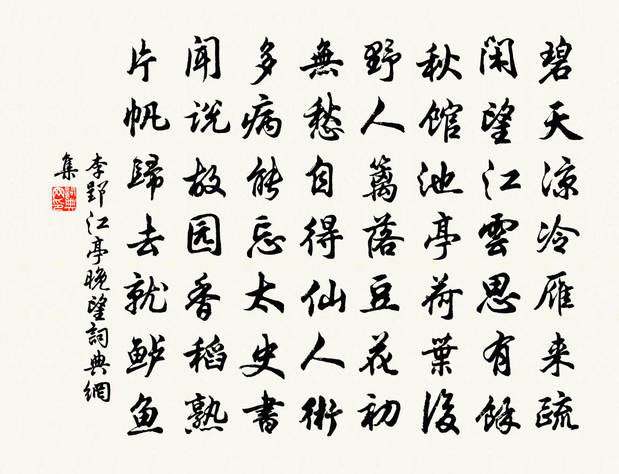 詩詞名句歷史字典書法欣賞書法字典國語詞典說文解字康熙字典古漢語字典標 題 作 者 詩 句 江亭晚望作者:李郢 朝代:唐代江亭晚望原文碧天涼冷雁來疏,閒望江雲思有餘。秋館池亭荷葉後,野人籬落豆花初。無愁自得仙人術,多病能忘太史書。聞說故園香稻熟,片帆歸去就鱸魚。詩詞問答問:江亭晚望的作者是誰?答:李郢問:江亭晚望寫於哪個朝代?答:唐代問:江亭晚望是什麼體裁?答:七律李郢江亭晚望書法欣賞江亭晚望書法作品注釋全唐詩:卷590-33詩詞推薦挽渡淹論敬贈魏大盧照鄰〔唐代〕津谷朝行遠,冰川夕望嘿。霞明探議浪,風捲去來雲。澄波泛月影,做浪聚沙丈。誰忍仙舟上,攜手獨思君。留別心老陳與義〔宋代〕老心霜下松,名與隆公齊。人物北斗南,佛事東院西。平生四海腳,不復煩金篦。卻從夢中別,未免意慘悽。它時春夜宿山家郭遠〔宋代〕嶂插清溪靜蓽門,數椽茅屋正黃昏。主人醉臥松間石,自繞梨花認月痕。行者求頌釋曇華〔宋代〕了身不若了心休,了得心時身不愁。若也身心俱了了,神仙何必更封侯。次韻魯山新居絕句陸游〔宋代〕短牆缺處插疏籬,巷劣容車堂對陂。天下有公殊可賀,坐中著我不妨奇。巫山曲孟郊〔唐代〕巴江上峽重複重,陽台碧峭十二峰。荊王獵時逢暮雨,夜臥高丘夢神女。輕紅流煙濕艷姿,行雲飛去明星稀。目極白翎鵲辭楊維楨〔元代〕白翎鵲,西極來。金為冠,玉為衣。百鳥見之不敢飛,雄狐猛虎愁神機。先帝親手鞲,重爾西方爾。海東之青汝何探春令趙長卿〔宋代〕而今風韻,舊時標緻,總皆奇絕。再相逢還是,春前臘後,粉面凝香雪。芳心自與群花別。盡孤高清潔。那情懷最長明燈羅隱〔唐代〕破暗長明世代深,煙和香氣兩沈沈。不知初點人何在,只見當年火至今。曉似紅蓮開沼面,夜如寒月鎮潭心。孤光次韻楊廷秀郎中游西湖十絕喻良能〔宋代〕袢暑渾如深甑炊,涼颸一餉最先知。憑誰為覓丹青手,畫我談詩剝芡時。金陵報恩大師西尚方丈二首王安石〔宋代〕蕭蕭出屋千竿玉,靄靄當窗一炷雲。心力長年人事外,種花移石尚殷勤。海城秋夕寄懷舍弟李中〔唐代〕鳥栖庭樹夜悠悠,枕上誰知淚暗流。千里夢魂迷舊業,一城砧杵搗殘秋。窗間寂寂燈猶在,簾外蕭蕭雨未休。早晚臨江仙(阿方初出)趙令畤〔宋代〕枝上粉香吹欲盡,依前庭院春風。更誰同繞摘芳叢。漏殘金獸冷,信斷錦屏空。看結燈花愁不睡,酒闌無夢相逢。和謝舍人洊震梅堯臣〔宋代〕盛夏萬物當長養,驕陽不雨誰為憂。天無纖雲野赬色,草木焦卷如經秋。南陽太守自引咎,不以天時為怨尤。齋精全州道間李曾伯〔宋代〕巷陌高題儀鳳,橋樑橫臥長虹。十里江山福地,滿城桃李春風。種穀吟邵雍〔宋代〕農家種穀時,種禾不種莠。奈何禾未榮,而見莠先茂。莠若不誅鋤,禾亦未成就。又況雨霈時,沾及恩一溜。梧桐樹牧常晁〔元代〕參玄人,聽付囑。百歲光陰如迅速。轉眼花開落。大事因緣如未熟。急須猛省開心目。莫被邪師惑。魯元翰中大輓詞二首蘇轍〔宋代〕遺直誦家聲,持心本至誠。何勞求皦察,所至自安平。氣象余前輩,才華屬後生。飛騰看諸子,相繼亦公卿。次韻子瞻太白山下早行題崇壽院蘇轍〔宋代〕山下晨光晚,林梢露滴升。峰頭斜見月,野市早明燈。樹暗猶藏鵲,堂開已饌僧。據鞍應夢我,聯騎昔嘗曾。貴和堂郭印〔宋代〕臨池高拓地,軒檻直前開。樹影簾中入,荷香坐上來。吏閒休案牘,客好共樽罍。再稔民和樂,嘉名亦稱哉。名句推薦嶺外音書斷,經冬復歷春。宋之問《渡漢江》 人生天地間,忽如遠行客。佚名《青青陵上柏》 城頭鐵鼓聲猶震,匣里金刀血未乾。王昌齡《出塞二首》 三春已暮花從風,空留可憐與誰同。蕭衍《東飛伯勞歌》 至今商女,時時猶唱,後庭遺曲。王安石《桂枝香·登臨送目》 天時、地利、人和,三者不得,雖勝有殃。孫臏《孫臏兵法·月戰》 世事短如春夢,人情薄似秋雲。朱敦儒《西江月·世事短如春夢》 若言琴上有琴聲,放在匣中何不鳴?蘇軾《琴詩》 舍近謀遠者,勞而無功范曄《後漢書·列傳·吳蓋陳臧列傳》 莫辭酒味薄,黍地無人耕。杜甫《羌村三首·其三》