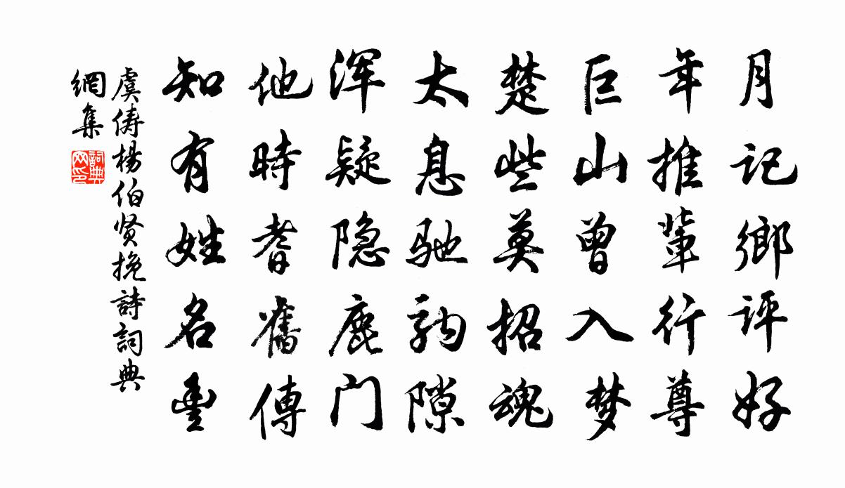詩詞名句歷史字典書法欣賞書法字典國語詞典說文解字康熙字典古漢語字典標 題 作 者 詩 句 楊伯賢輓詩作者:虞儔 朝代:宋代楊伯賢輓詩原文月記鄉評好,年推輩行尊。巨山曾入夢,楚些莫招魂。太息馳駒隙,渾疑隱鹿門。他時耆舊傳,知有姓名豐。詩詞問答問:楊伯賢輓詩的作者是誰?答:虞儔問:楊伯賢輓詩寫於哪個朝代?答:宋代虞儔楊伯賢輓詩書法欣賞楊伯賢輓詩書法作品詩詞推薦舟次磁湖以風浪留二日不得進子瞻以詩見寄作蘇轍〔宋代〕西歸猶未有苑裘,擬就南遷買一丘。舟楫自能通蜀道,林泉真欲老黃州。魚多釣戶應容貰,酒熟鄰翁便可留。從此次劉曉窗九日韻十首楊公遠〔宋代〕秋菊何嘗委片英,都緣氣韻稟清寧。欲將此意靈均道,只恐靈均喚不醒。送王尉李覯〔宋代〕義激中心不再思,宦途從此抱瑕疵。誰憐君子篤親意,況是明王孝治時。靖節田園應久發,尚平婚嫁豈宜遲。一官送棗陽軍使劉似之兼棗陽令姜特立〔宋代〕四方男子志,當在壯年時。民社非輕異,才猷且小施。附庸今列邑,大國古稱隨。莫謂朝廷遠,行看召驛馳。行次德清張鎡〔宋代〕浮圖立處覓天低,迎我船行十里時。不是前山明復暗,那知頭上白雲移。勸農同幕皆預即事四絕陳杰〔宋代〕妥帖輕輿我自便,更施小帳暖如氈。前山一陣東風雨,馬上諸郎陛楯然。秦題游洋張明府流香亭時以薦章數下涉秋月馬林光朝〔宋代〕封題青李數緋桃,處分園林意自豪。旋出篇章陪樂府,更憑花木續離騷。酴醿架下提春榼,檐卜林中滴夜槽。卻是和小飲宋祁〔宋代〕天帟暮雲消,飛觴夜正遙。洛吟聊擁鼻,陶舞惜回腰。露曉蟬嘶樹,河秋鵲映橋。客歡殊未幾,離恨又霞朝。此君軒蘇軾〔宋代〕雲幢煙節十洲人,犀甲檀槍百萬軍。翳薈叢生何足道,此君真是此君君。寄同年韋校書皮日休〔唐代〕二年疏放飽江潭,水物山容盡足耽。唯有故人憐未替,欲封乾鱠寄終南。水調歌頭 慶壽周權〔元代〕瀟灑晉文物,奇偉魯衣冠。暫賦淮南招隱,泉石寄清閒。才壓建安六七,胸吞雲夢 * ,餘子笑談間。未頡水蒼佩偈釋智遠〔宋代〕從來打鼓弄琵琶,須是相逢兩會家。佩玉鳴鸞歌舞罷,門前依舊夕陽斜。書事十絕曾惇〔宋代〕和戎詔下破群疑,無復旄頭彗紫微。屈已銷兵宜有報,先看長樂版輿歸。雜曲歌辭行路難五首僧貫休〔唐代〕不會當時作天地,剛有多般愚與智。到頭還用真宰心,何如上下皆清氣。大道冥冥不知處,那堪頓得羲和轡。義不清明黃庭堅〔宋代〕佳節清明桃李笑,野田荒壠只生愁。雷驚天地龍蛇螫,雨足郊原草木柔。人乞祭余驕妾婦,士甘焚死不公侯。賢愚蒙恩易鎮豫章丐假還鄉途中偶成十七首吳芾〔宋代〕茲嶺別二年,今朝又重過。過了環復來,袁哉蟻旋磨。菊鄭獬〔宋代〕菊花初抱葉,始見春光來。綠蓓今著花,又見秋風回。高天不容土,白日安可栽。一世如大瘧,寒暑還相催。使我古鑒范仲淹〔宋代〕磨此千年鑒,朱顏清可覽。君看日月光,無求照人膽。閏正月十三日夜雪仇遠〔宋代〕東風散雪亂如麻,擲瓦敲窗細撒沙。只恐市中薪米貴,不愁江上落梅花。偈頌二十首釋如珙〔宋代〕觸目儘是清淨地,清淨地上無佛住。趙州教人急走過,狸奴倒上菩提樹。名句推薦楚鄉飛鳥沒,獨與碧雲還。錢起《送夏侯審校書東歸》 渭北春天樹,江東日暮雲。杜甫《春日憶李白》 庭下如積水空明,水中藻、荇交橫,蓋竹柏影也。蘇軾《記承天寺夜遊 / 記承天夜遊》 紅燭背,繡簾垂,夢長君不知。溫庭筠《更漏子·柳絲長》 一年三百六十日,多是橫戈馬上行。戚繼光《馬上作》 半天涼月色,一笛酒人心。袁枚《夜過借園見主人坐月下吹笛》 此去經年,應是良辰好景虛設。柳永《雨霖鈴·寒蟬淒切》 治天下者當用天下之心為心,不得自專快意而已也。班固《漢書·傳·王貢兩龔鮑傳》 東君也不愛惜,雪壓霜欺。晁沖之《漢宮春·梅》 池塘過雨急鳴蛙。酒醒明月照窗紗。夏言《浣溪沙·庭院沉沉白日斜》
