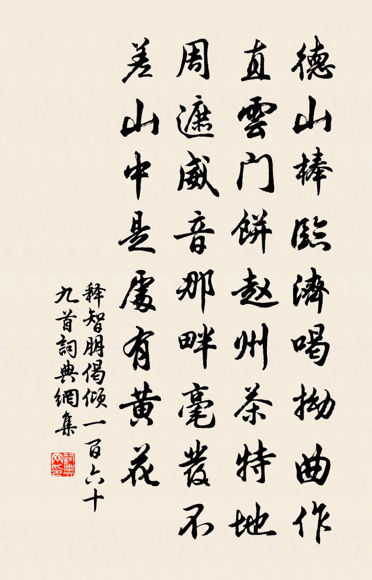 詩詞名句歷史字典書法欣賞書法字典國語詞典說文解字康熙字典古漢語字典標 題 作 者 詩 句 偈傾一百六十九首作者:釋智朋 朝代:宋代偈傾一百六十九首原文德山棒,臨濟喝,拗曲作直。雲門餅,趙州茶,特地周遮。威音那畔,毫髮不差,山中是處有黃花。詩詞問答問:偈傾一百六十九首的作者是誰?答:釋智朋問:偈傾一百六十九首寫於哪個朝代?答:宋代釋智朋偈傾一百六十九首書法欣賞偈傾一百六十九首書法作品詩詞推薦有感今昔二首范成大〔宋代〕飄風驟雨謾驚春,掃蕩何煩臂屈伸。天識不衷宜不恕,神歆非類即非仁。休讎地下枯魚骨,且斗尊前健犢身。靜看勸諭賑濟詩馮楫〔宋代〕我昔未第日,鄉間逢歲飢。兩率閭里人,相共行賑濟。饑民僅得食,免困餓而斃。及我登第後,被罪歸田裡。尋復晚宿小羅田四首楊萬里〔宋代〕蕭灑低低屋,虛明小小窗。客間那得許,窗外更寒江。答武昌吳廣文高似孫〔宋代〕平生不識武倡樓,官柳青青好在不。庾亮笛吹黃鵠月,簡棲碑駁碧苔秋。山橫赤壁含懷斷,水出瞿唐快意流。何處史主簿以授庵習稿見示敬題其後並寄張宗瑞樂雷發〔宋代〕吟了南樓到庫樓,塞雲邊月困雕鎪。只今南北無詩禁,曾有新編遏韃不。韶陽之遷道中呈汪時法呂祖儉〔宋代〕汪氏諸郎子獨賢,相從過嶺過韶川。九齡風味猶存否,莫向南華卻問禪。水龍吟 游三台許有壬〔元代〕半生人海風波,謗書盈篋從文致。歸來結構,且圖*伏,敢求華麗。朝暮娛人,水聲山色,柳陰花氣。笑彤闈紫闥自永和溪上泛舟至余不釋行海〔宋代〕來往篙師夜唱歌,動人離思惱人多。就船欲作東皈夢,無奈溪山月色何。清涼寺孔武仲〔宋代〕白寺荒灣略艤舟,攜筇來作上方游。何年巧匠開山骨,自古精兵聚石頭。故壘無人空向久,高堂問話凜生秋。雲庵大官樂 夏長筌子〔元代〕石榴色蘸香囊血。綠荷如蓋蓮開葉。避暑登樓心爽潔。霜紈揮落寥天戊申自貽邵雍〔宋代〕雖老仍思鼓缶歌,庶幾都未喪天和。明夷用晦止於是,無妄生災終柰何。似箭光陰頭上去,如麻人事眼前過。中間春日偶題武元衡〔唐代〕山川百戰古刀州,龍節來分聖主憂。靜守化條無一事,春風獨上望京樓。贈僧李洞〔唐代〕不羨王公與貴人,唯將雲鶴自相親。閒來石上觀流水,欲洗禪衣未有塵。春日陸游〔宋代〕遲日園林嘗煮酒,和風庭院新絲。已過燕子穿簾後,又見魚上市時。排悶與兒聯小句,破閒留客戰枯棋。殘年自覓送路都曹蘇軾〔宋代〕積雪困桃李,春心誰為容。淮光釀山色,先作歸意濃。我亦倦遊者,君恩系疏慵。欲留耿介士,伴我衰遲蹤。更課頌古一百二十一首釋宗杲〔宋代〕利刃有蜜不須舐,蟲毒之家水莫嘗。不舐不嘗俱不犯,端然衣錦自還鄉。神宗皇帝輓詞三首黃庭堅〔宋代〕文思昭日月,神武用雷霆。製作深垂統,憂勤減夢齡。孫謀開二聖,末命對三靈。今代誰班馬,能書汗簡青。早春劉威〔唐代〕曉來庭戶外,草樹似依依。一夜東風起,萬山春色歸。冰消泉派動,日暖露珠晞。已醞看花酒,嬌鶯莫預飛。送存書記梁棟〔宋代〕一聲兩聲松子落,一片兩片楓葉飛。夕陽在山新月上,道人相伴一僧歸。贈東隱小師林復祖陳著〔宋代〕萬木雕零獨有松,雪霜風裡幾春冬。須知受變方成物,直上雲霄舞翠龍。名句推薦精誠所加,金石為開。范曄《後漢書·列傳·光武十王列傳》 我心匪石,不可轉也。佚名《柏舟》 夫君子之行,靜以修身,儉以養德。諸葛亮《誡子書》 白鳥悠悠自去,汀洲外、無限蒹葭。王國維《滿庭芳·水抱孤城》 水繞陂田竹繞籬,榆錢落盡槿花稀。張舜民《村居·水繞陂田竹繞籬》 古之為政,愛人為大戴聖《禮記·哀公問》 荒村帶返照,落葉亂紛紛。劉長卿《碧澗別墅喜皇甫侍御相訪》 春欲盡,日遲遲,牡丹時歐陽炯《三字令·春欲盡》 三萬里河東入海,五千仞岳上摩天。陸游《秋夜將曉出籬門迎涼有感》 利之中取大,害之中取小。墨子《墨子·44章 大取》