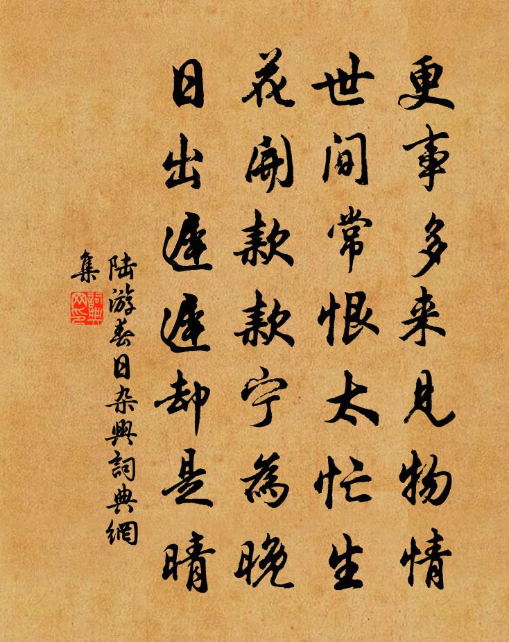 詩詞名句歷史字典書法欣賞書法字典國語詞典說文解字康熙字典古漢語字典標 題 作 者 詩 句 春日雜興作者:陸游 朝代:宋代春日雜興原文更事多來見物情,世間常恨太忙生。花開款款寧為晚,日出遲遲卻是晴。詩詞問答問:春日雜興的作者是誰?答:陸游問:春日雜興寫於哪個朝代?答:宋代問:陸游的名句有哪些?答:陸游名句大全陸遊春日雜興書法欣賞春日雜興書法作品詩詞推薦步蟾宮汪存〔宋代〕玉京此去春猶淺。正雪絮、馬頭零亂。姮娥剪就綠雲裳,待來步蟾宮與換。明年二月桃花岸。棹雙漿、浪平煙暖。答李武伯陳宓〔宋代〕李郎江西彥,傑出天與才。勉齋恨得晚,垂絕傾所懷。朅來復入閩,吾道嘆已乖。延平有書社,四儒孔門儕。地勢一片峰葉茵〔宋代〕十丈蒼圭似削齊,摩挲信是古來碑。不刊二范忠勞績,合寫諸賢唱詠詩。題魚尊師院賈島〔唐代〕老子堂前花萬樹,先生曾見幾回春。夜煎白石平明吃,不擬教人哭此身。與子由同游寒溪西山蘇軾〔宋代〕散人出入無町畦,朝游湖北暮淮西。高安酒官雖未上,兩腳垂欲穿塵泥。與君聚散若雲雨,共惜此日相提攜。千搖書懷絕句陸游〔宋代〕憶過棲賢見蜀僧,雲堂十月冷生冰。定回蔌蔌聞窗雪,一碗琉璃照佛燈。睡足軒二首秦觀〔宋代〕數椽空屋枕清流,一榻蕭然散百憂。終日掩關塵境謝,有時開卷古人游。鳴鳩去後滄浪晚,飛雨來初菡萏秋。此處雪後陳師道〔宋代〕送往開新雪又晴,故留臘白待春青。稍回杉色伸梅怨,並得朝看與夜聽。已覺庭泥生鳥跡,遽修田事帶朝星。暮年竹殷堯藩〔唐代〕窗戶盡蕭森,空階凝碧陰。不緣冰雪裡,為識歲寒心。【中呂】粉蝶兒_集曲名題秋王仲元〔元代〕集曲名題秋怨雙雁兒聲悲,景瀟瀟楚江秋意,勝陽關刮地風吹。滿庭芳,梧桐樹,全蕉葉墜。慶東原金菊香滴滴金經九華山費征君故居張喬〔唐代〕草堂蕪沒後,來往問樵翁。斷石荒林外,孤墳晚照中。數溪分大野,九子立寒空。煙壁曾行處, * 不通。漁家傲梵琦〔元代〕聽說娑婆無量苦。凶兵解散還屯聚。昨日為齊今日楚。更奴虜。乾坤畢竟歸神武。趙括才疏空自許。強秦用間欺其過曾相士所居因題趙蕃〔宋代〕見君每塵中,訪君每塵外。茅湯煮仙方,茗椀出新焙。溪亭不難作,軒樹茅為蓋。面識欲何如,臨流烏臼背。寄涇北都運待制施正臣宋祁〔宋代〕我作東南守,君為河朔行。旌旂向江步,笳鼓入邊聲。共結光華遇,難禁離索情。惟應指羊酪,未肯下蒪羹。避地傷春六絕句葛立方〔宋代〕石門連日動征鼙,花柳無情自繞溪。回首故園今好在,杜鵑花落子規啼。菩薩蠻羅志仁〔宋代〕曉鶯催起。問當年秀色,為誰料理。悵別後、屏掩吳山,便樓燕月寒,鬢蟬雲委。錦字無恁,付銀燭、盡燒千紙。頌古三十一首釋梵琮〔宋代〕一片油絲水面浮,隨波搖動逐波流。等閒拋在江湖裡,綰著金鱗未肯休。王常博寄示沌路七詩李肩吾用韻為予壽因次韻魏了翁〔宋代〕兄弟親知香異方,僕夫痡困馬玄黃。惟葉臭味李夫子,不為無人不肯芳。李文饒一首劉克莊〔宋代〕畫取維州如槁葉,策禽潞將似嬰兒。九原精爽人猶畏,想見中書秉筆時。贈苦行僧雍裕之〔唐代〕幽深紅葉寺,清淨白毫僧。古殿長鳴磬,低頭禮晝燈。名句推薦壯年何事憔悴,華發改朱顏。蘇舜欽《水調歌頭·滄浪亭》 日暮秋煙起,蕭蕭楓樹林。戴叔倫《過三閭廟》 候館梅殘,溪橋柳細。歐陽修《踏莎行·候館梅殘》 還與去年人,共藉西湖草。蘇軾《卜運算元·感舊》 蓬生麻中,不扶而直;白沙在涅,與之俱黑。荀子《荀子·勸學》 昨夜星辰昨夜風,畫樓西畔桂堂東。李商隱《無題·昨夜星辰昨夜風》 手紅冰碗藕,藕碗冰紅手。蘇軾《菩薩蠻·回文夏閨怨》 無半點閒愁去處,問三生醉夢何如。喬吉《折桂令·七夕贈歌者》 歲暮鋤犁傍空室,呼兒登山收橡實。張籍《野老歌 / 山農詞》 關城榆葉早疏黃,日暮雲沙古戰場。王昌齡《從軍行七首》
