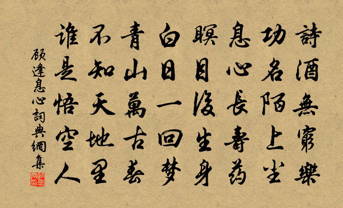詩詞名句歷史字典書法欣賞書法字典國語詞典說文解字康熙字典古漢語字典標 題 作 者 詩 句 息心作者:顧逢 朝代:宋代息心原文詩酒無窮樂,功名陌上塵。息心長壽藥,瞑目後生身。白日一回夢,青山萬古春。不知天地里,誰是悟空人。詩詞問答問:息心的作者是誰?答:顧逢問:息心寫於哪個朝代?答:宋代顧逢息心書法欣賞息心書法作品詩詞推薦天山雪歌送蕭治歸京岑參〔唐代〕天山雪雲常不開,千峰萬嶺雪崔嵬。北風夜卷赤亭口,一夜天山雪更厚。能兼漢月照銀山,復逐胡風過鐵關。交河富景園時周端臣〔宋代〕地比諸園小,池從前代開。猶餘喬木在,曾見上皇來。幽徑埋黃葉,空庭來綠苔。荒寒吟思怯,落日獨徘徊。滿庭芳僧兒〔宋代〕團菊苞金,叢蘭減翠,畫成秋暮風煙。使君歸去,千里倍潸然。兩度朱幡雁水,全勝得、陶侃當年。如何見,一時新春書懷孫應時〔宋代〕樂國急春早,寒窗獨夜分。舊期心不動,今恐老無聞。結習唯黃卷,凝愁奈折雲。梅梢香漸少,還起米爐薰。過中岩渡月出峨眉山程公許〔宋代〕返照中岩流,峨眉分外清。一彎新吐月,共我兩忘形。露下沙逾白,宵寒酒易醒。荻花風索索,擁被不堪聽。與蘇運使詡四首趙蕃〔宋代〕昔在元佑初,重選館閣才。時我高王父,實與數子偕。黃門任言事,薦口曾為開。有孫不能振,白髮自興哀。曉過南宮聞太常清樂陸贄〔唐代〕南宮聞古樂,拂曙聽初驚。煙靄遙迷處,絲桐暗辨名。節隨新律改,聲帶緒風輕。合雅將移俗,同和自感情。遠音又用韻李曾伯〔宋代〕雪凝霜降不肯春,花神豈類婦人仁。肯留年後供清思,分付東風與主人。溪行林景熙〔宋代〕風高余暑盡,獨策興悠然。野色延幽步,秋聲入暮年。日斜禽影亂,水薄樹根懸。回首故人遠,城笳吹夕煙。招義銘育王見佛照劉過〔宋代〕豪傑書生懶散仙,小庵藏跡得安間。禪曾勘破諸公去,詩在推敲一字間。夜雨滴殘梧葉老,夕陽行處水花慳。買舟禪人並化主寫真求贊釋正覺〔宋代〕漆黑眸子,梔黃麵皮。智靜霽月相照,身閒野雲不羈。該抹把手陳尊宿,細膩點頭王老師。針兮線兮明聯暗綴,音滿庭芳 詠俞紹庵九芝堂沈禧〔元代〕節義名門,簪纓華胄,聖朝旌表昭彰。聲譽籍甚,青史注遺芳。積善偏鍾餘慶,天地報、芝產中堂。人希見,九莖題田洗馬游岩桔槔陳子昂〔唐代〕望苑( 一作遠 )長為客。商山遂不歸。誰憐北陵井( 一作客 )。未息漢陰機。和陶詩六首和歸田園王阮〔宋代〕皇天亦愛我,生我匡廬山。勉承父母志,功史期少年。既無取日手,遠去窮虞淵。又無謀生才,廣有負郭田。富貴浪淘沙(生日)毛滂〔宋代〕深院繡簾垂。前日春歸。畫橋楊柳弄煙霏。池面東風先解凍,龜上漣漪。酒瀲玉東西。香暖狻猊。遠山郁秀入雙眉辛未中元記夢夢與一僧談世事良久問答中有凡五邁〔宋代〕一念稍分明,天壤異仙凡,諸相等歸妄,天真要無龐。凡特非我有,秋毫不可貪。只此為上乘,其諸總虛談。無字金沙贊釋智遇〔宋代〕琅琅流水聲,懷抱說情傾。不識春風面,雪消梅影清。是夕再題趙蕃〔宋代〕只道陰能蔽,那知吹忽開。蕭蕭故差勝,皎皎適何來。起看寧辭倦,放吟無自哀。雖然不可久,白 * 蒼苔。丁亥紀蜀百韻李曾伯〔宋代〕在負在娵觜,羲雙正東陸。羽書西邊來,胡騎報南牧。倉茫星火急,飄忽風雨速。憑陵我封疆,剽掠我孳留。一越次韻石林見貽絕句四首韓元吉〔宋代〕先生德業萬人雄,尋尺猶收爨下桐。乞與朱弦弄流水,坐聽岩壑起松風。名句推薦淒涼南浦,斷橋斜月。房舜卿《憶秦娥·與君別》 霜草蒼蒼蟲切切,村南村北行人絕。白居易《村夜》 煙霏霏。雪霏霏。雪向梅花枝上堆。吳淑姬《長相思令·煙霏霏》 鶯嘴啄花紅溜,燕尾點波綠皺。秦觀《如夢令·春景》 煙水初銷見萬家,東風吹柳萬條斜。竇鞏《襄陽寒食寄宇文籍》 布衣菜飯,可樂終身,不必作遠遊計也。沈復《浮生六記·閨房記樂》 留連戲蝶時時舞,自在嬌鶯恰恰啼。杜甫《江畔獨步尋花·其六》 仗酒祓清愁,花銷英氣姜夔《翠樓吟·淳熙丙午冬》 青蒲銜紫茸,長葉復從風。佚名《拔蒲二首》 蠟淚惱東風,舊壘眠新燕。納蘭性德《生查子·鞭影落春堤》