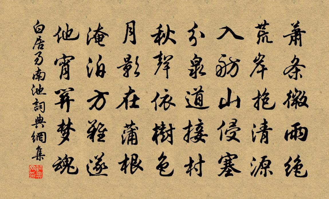詩詞名句歷史字典書法欣賞書法字典國語詞典說文解字康熙字典古漢語字典標 題 作 者 詩 句 南池作者:白居易 朝代:唐代南池原文蕭條微雨絕,荒岸抱清源。入舫山侵塞,分泉道接村。秋聲依樹色,月影在蒲根。淹泊方難遂,他宵關夢魂。詩詞問答問:南池的作者是誰?答:白居易問:南池寫於哪個朝代?答:唐代問:南池是什麼體裁?答:五律問:白居易的名句有哪些?答:白居易名句大全白居易南池書法欣賞南池書法作品注釋全唐詩:卷462-50詩詞推薦點絳唇元好問〔金代〕紅袖憑闌,畫圖曾見崔徽半。 * 誰伴。白地肝腸斷。未了塵緣,可道歡緣短。雲山亂。武陵溪岸。幾誤鶯聲喚。次韻游山寺汪炎昶〔宋代〕龕暈描輕蘚,檐陰寞翠藤。追涼有時客,避難盡無僧。法界魔為崇,宗風冷欲冰。不知緣底事,還復有傅燈。楊十七應之兄學士輓辭趙挺之〔宋代〕廓落襟懷德藝優,身名曾不問沈浮。當年冊府曾同命,早歲文場每並游。寂寂舊廬東觀曉,翩翩歸旐北邙秋。都城裁縫釋慧開〔宋代〕剪斷萬絲頭,工夫已成片。針劄不入處,為渠通一線。送劉前豀李新〔宋代〕耀靈浴虞淵,光屬朝夕池。氤氳滿寰宇,幽草無閒枝。岷山玉嶺花,寸根武陵西。寒搖塞北霜,疏影何葳蕤。春意鶯陸九淵〔宋代〕巧囀風台急管,清逾石澗回溪。好去枝枝驚夢,無人心到遼西。殘菊史鑄〔宋代〕節去蜂愁蝶不知,冷香消盡晚風吹。碎金狼藉不堪摘。空作主人惆悵詩。郎月行張漸〔唐代〕朗月照簾幌,清夜有餘姿。洞房怨孤枕,挾琴愛前墀。萱草已數葉,梨花復遍枝。去歲草始榮,與君新相知。今年【雙調】錢絲泫喬吉〔元代〕避豪傑,隱岩穴,煮茶香掃梅梢雪。中酒酣迷紙帳蝶,枕書睡足松窗月,一燈蝸舍。題東湖涵虛閣晏殊〔宋代〕水有支流樹有孫,重重門巷掛朱軒。三君雅望標人傑,千里澄波隔世喧。西對戶庭徐孺宅,北傳鍾梵給孤園。欲知紹興親享明堂二十六首佚名〔宋代〕皇皇后帝,周覽四方。眷我前烈,燕娭此堂。金支秀髮,黼帳高張。世歆明祀,日宋是常。夕次壽陽驛題吳郎中詩後韓愈〔唐代〕風光欲動別長安,春半城邊特地寒。不見園花兼巷柳,馬頭惟有月團團。效陳拾遺子昂司空圖〔唐代〕醜婦競簪花,花多映愈醜。鄰女恃其姿,掇之不盈手。量已苟自私,招損乃誰咎。寵祿既非安,於吾竟何有。偶成雜意四首衛博〔宋代〕朝草百幅箋,暮草千函書。貴人肯首耳,一言躡雲衢。但見人因子,不見子亦如。梁間嘯者誰,知是鬼揶揄。太湖楊備〔宋代〕魚舠載酒日相隨,一笛薦花深處吹。湖面風收雲影散,水天交照碧琉璃。詠燭二首李世民〔唐代〕焰聽風來動,花開不待春。鎮下千行淚,非是為思人。九龍蟠焰動,四照逐花生。即此流高殿,堪持待月明。大觀宗祀明堂五首佚名〔宋代〕筆祀明堂,告成大報。顒顒祗祗,率見昭考。涓選休辰,齊明朝夕。於惟皇王,孝思罔極。龍圖閣會宴應製楊億〔宋代〕冊府藏書在紫微,退朝稽古助論思。中天召宴衢樽滿,乙夜觀文列象垂。綵鳯翩翻巢綺閣,靈龜夭矯冠金碑。大風趙克勤曾橐卿景壽同登黃南恩南樓戴復古〔宋代〕欲從高處賞新秋,上盡層坡更上樓。天地無窮吾輩老,江山有恨古人休。寧隨狡兔營三窟,且跨飛鴻閱九州。憶著覺際融長老請贊釋師範〔宋代〕無個模樣,畫個模樣。既有模樣,是甚模樣。節節危梁十二層,垂垂白髮三千丈。名句推薦櫚庭多落葉,慨然知已秋。陶淵明《酬劉柴桑》 酌酒會臨泉水,抱琴好倚長松。王維《田園樂七首·其七》 還背垂虹秋去,四橋煙雨,一宵歌酒。吳文英《瑞龍吟·送梅津》 西山白雪三城戍,南浦清江萬里橋。杜甫《野望》 過眼年華,動人幽意,相逢幾番春換。王沂孫《法曲獻仙音·聚景亭梅次草窗韻》 馬驕泥軟錦連乾,香袖半籠鞭。薛昭蘊《喜遷鶯·清明節》 東園載酒西園醉,摘盡枇杷一樹金。戴復古《初夏遊張園》 烽火連三月,家書抵萬金。杜甫《春望》 青林翠竹,四時俱備。陶弘景《答謝中書書》 和戎詔下十五年,將軍不戰空臨邊。陸游《關山月》