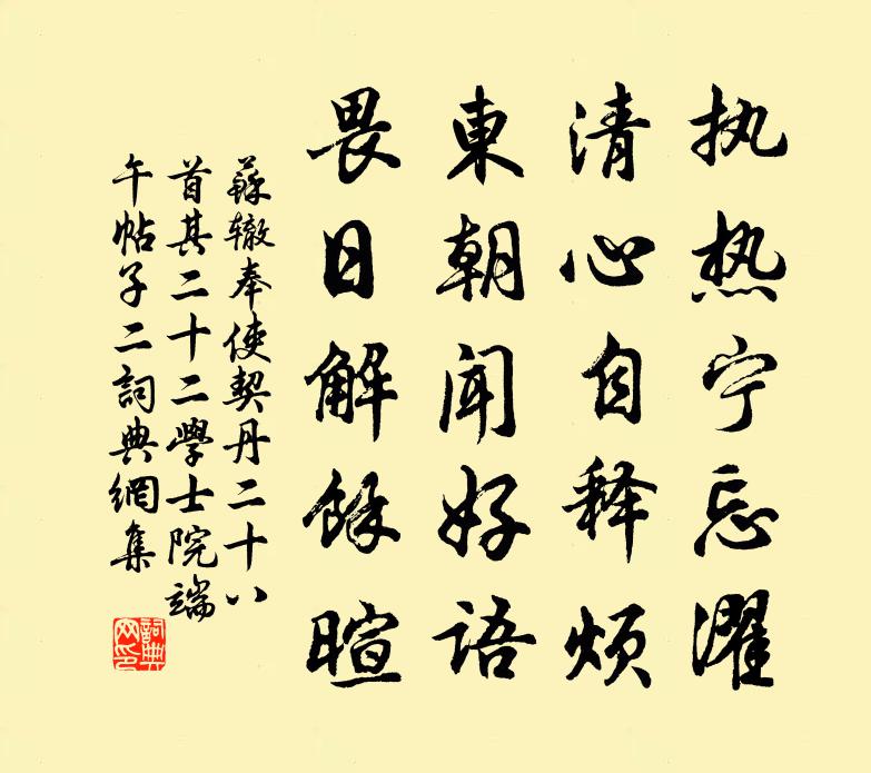 詩詞名句歷史字典書法欣賞書法字典國語詞典說文解字康熙字典古漢語字典標 題 作 者 詩 句 奉使契丹二十八首其二十二學士院端午帖子二作者:蘇轍 朝代:宋代原文執熱寧忘濯,清心自釋煩。東朝聞好語,畏日解余暄。詩詞問答問:《奉使契丹二十八首其二十二學士院端午帖子二》的作者是誰?答:蘇轍問:該詩寫於哪個朝代?答:宋代問:蘇轍的名句有哪些?答:蘇轍名句大全書法欣賞奉使契丹二十八首其二十二學士院端午帖子二書法作品詩文賞析【原題】:奉使契丹二十八首其二十二學士院端午帖子二十七首之二太皇太后閣六首之三詩詞推薦送僧之湖外貫休〔唐代〕去旨趣非常,春風爾莫狂。惟擎一鐵缽,舊亦講金剛。午飯孤煙里,宵禪大石旁。羨師終不及,湘浪淥茫茫。雜詩六首李若水〔宋代〕明月如幽人,邈有出世姿。吾欲從之游,開門曳藤枝。得酒袖自舉,賞此一段奇。人生要行樂,戚戚竟何為。君看離無錫夜入溪莊港口張鎡〔宋代〕出川猶自雨隨車,到得溪橋一點無。冷月半明雲未去,垂楊成行葉全枯。竹添東野方清蔭,人在南湖已白須。應是秦州雜詩二十首·其十九杜甫〔唐代〕鳳林戈未息,魚海路常難。候火雲烽峻,懸軍幕井幹。風連西極動,月過北庭寒。故老思飛將,何時議築壇。巴陵汪元量〔宋代〕重到巴陵秋正清,岳陽城下系孤舲。江湖萬里水雲闊,天地一涼河嘆明。月出洞庭魚婢舞,氣蒸雲夢雁奴腥。篙工白露前一日已如深秋有感陸游〔宋代〕匹馬曾防玉塞秋,豈知八十老漁舟。非無丈二殳堪請,只恐傍人笑白頭。郊進退律賦水鄉三實唐士恥〔宋代〕冰雪胸懷七澤姿,纖纖舞袖學雙飛。袢襟應念人間世,灌頂何如山上芝。荷葉巧偷鸚鵡背,蓴絲密綴燕雛衣。回塘方氏清芬閣刁約〔宋代〕自別高居二紀餘,今朝重到懶踟躕。山川勝景依然在,屈指交親一半無。奉和虢州劉給事使君三堂新題二十一詠荷池韓愈〔唐代〕風雨秋池上,高荷蓋水繁。未諳鳴摵摵,那似卷翻翻。滿江紅(登樓偶作)佚名〔宋代〕樓倚虛空,覺人世、不知何處。人縹緲、半檐星斗,一窗風露。潮退沙平鳧雁靜,夜深月黑魚龍怒。把清樽、獨自小醉吳可〔宋代〕小醉初醒過竹村,數家殘雪擁籬根。風前有恨梅千點,溪上無人月一痕。憶秦娥沈端節〔宋代〕憑闌獨。南山影蘸杯心綠。杯心綠。悠然忽見,臥披橫軸。西風暗度釵梁玉。手香記得人簪菊。人簪菊。無窮幽韻偈頌三十八首釋如淨〔宋代〕不曾生,不曾死,洞裡桃花紅照水。可憐開眼被渠瞞,人間天上風波起。送章君范之湖南幕洪咨夔〔宋代〕天闊孔鸞起,江晴荃若春。親榮知有子,主勝信宜賓。嶽麓盛古學,衡山多秀民。平生金玉質,更看濯磨新。次志宏韻督成壽置酒洪邁〔宋代〕歸耕食吾言,回首愧江水。方爭揚子度,誰置穆生醴。鄧侯傾蓋舊,小寢藝桃李。走書約啗我,涎迸齧脣齒。朝來舟過梅塢胡氏居愛其幽邃為賦一詩陸游〔宋代〕稽山翠入家家窗,此家清絕無與雙。丹葩綠樹錦繡谷,清波白石玻璃江。一堤茂草有眠犢,數掩短籬無吠尨。北軒客中呈幼度范成大〔宋代〕手板頭銜意已慵,墨池書枕興無窮。釀泥深巷五更雨,吹酒小樓三面風。草色有無春最好,客心去住水長東。今朝立春日陪魏丞相登三江亭范成大〔宋代〕佳節登臨始此回,聊從晻靄望蓬萊。水分江北渡頭去,風自海東潮外來。太白天寒猶帶雪,十洲池暖已浮醅。一尊再和雪韻鄭清之〔宋代〕司冬已窮造父力,寒機墮指曉猶織。長安貴人金屋嬌,琉璃屏下方偃息。穿窗入幕兒女笑,喚作楊花元不識。明珠秋風三首張耒〔宋代〕秋風蕭蕭洛川渡,水碧沙寒飛白鷺。波頭伐木欲成梁,落日樵蘇下山去。山頭九月雪一尺,山民燃薪當襦胯。石田名句推薦行有素履,事有成跡,一人之毀未必可信,積年之行不應頓虧。宋祁、歐陽修、范鎮、呂夏卿等《新唐書·列傳·卷二十二》 酒債尋常行處有,人生七十古來稀。杜甫《曲江二首》 隨風潛入夜,潤物細無聲。杜甫《春夜喜雨》 紫菊氣,飄庭戶,晚煙籠細雨。李煜《謝新恩·冉冉秋光留不住》 秋霜欲下手先知,燈底裁縫剪刀冷。白居易《空閨怨》 平皋行雁下,曲渚雙鳧出。崔元翰《奉和聖制重陽旦日百寮曲江宴示懷》 梅似雪,柳如絲。試聽別語慰相思。辛棄疾《鷓鴣天·送歐陽國瑞入吳中》 須愁春漏短,莫訴金杯滿。韋莊《菩薩蠻·勸君今夜須沈醉》 令公桃李滿天下,何用堂前更種花。白居易《奉和令公綠野堂種花》 夜來攜手夢同游,晨起盈巾淚莫收。白居易《夢微之》