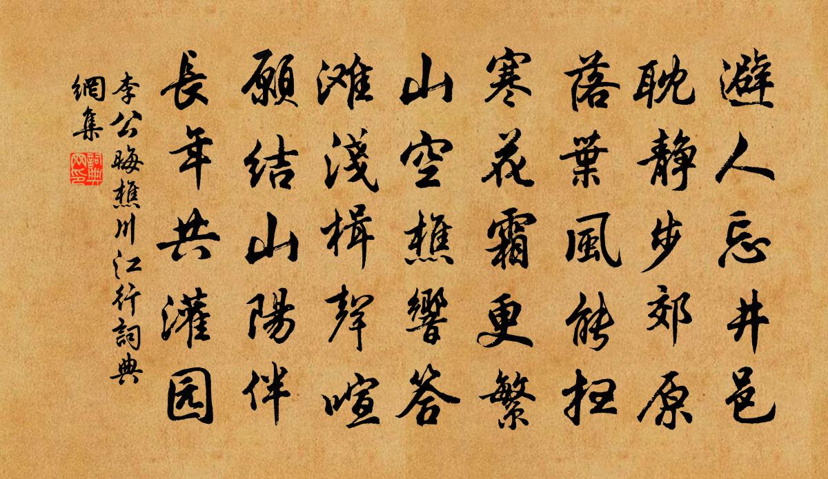 詩詞名句歷史字典書法欣賞書法字典國語詞典說文解字康熙字典古漢語字典標 題 作 者 詩 句 樵川江行作者:李公晦 朝代:宋代樵川江行原文避人忘井邑,耽靜步郊原。落葉風能掃,寒花霜更繁。山空樵響答,灘淺楫聲喧。願結山陽伴,長年共灌園。詩詞問答問:樵川江行的作者是誰?答:李公晦問:樵川江行寫於哪個朝代?答:宋代李公晦樵川江行書法欣賞樵川江行書法作品詩詞推薦題鹿苑寺壁間記魯簡肅公羅漢見夢事吳思齊〔宋代〕是法本平等,無怠亦無敬。如何證無生,卻來見參政。倒垂柳(重九)楊無咎〔宋代〕曉來煙露重,為重陽、增勝致。記一年好處,無似此天氣。東籬白衣至,南陌芳筵啟。風流曾未遠,登臨都在眼底題新鄉王釜廳壁岑參〔唐代〕憐君守一尉,家計復清貧。祿米嘗不足,俸錢供與人。城頭蘇門樹,陌上黎陽塵。不是舊相識,聲同心自親。落梅艾性夫〔宋代〕翠羽嘈嘈喚夢回,羅浮峰下小徘徊。霜風昨夜卷晴雪,山路今朝無碧苔。尚有瘦香供玉笛,不將余片點妝檯。少須謁詩僧慧益不遇李復〔宋代〕晝公昔在雲門寺,曾笑陳丘久不歸。草坐 * 今不見,獨來林下釣寒磯。游龍門分題十五首晚登菩提上方歐陽修〔宋代〕野色混晴嵐,蒼茫辨煙樹。行人下山道,猶向都門去。淥水詞許琮〔宋代〕綠草回波漾青草,鷓鴣聲緊連枝老。苔陰欲上簾影低,鳥語催人天未曉。曉起輕寒奈薄羅,風前縷帶不勝波。練裙習池詩李廌〔宋代〕陳跡相推今古同,池邊倚杖送歸鴻。童山尚接千岩秀,穉樹猶傳萬壑風。春意物情迷野興,水光天影共青空。雍門春貼子詞皇太后閣六首司馬光〔宋代〕玉漏聲殘金殿開,乘輿清蹕問安來。盡將草木欣欣意,同與新春人壽杯。喜敗篋中得舊詩姜特立〔宋代〕十首詩篇久棄遺,偶翻故篋有光輝。恰如建鼓求亡婦,一日門前忽自歸。頌古六首釋宗杲〔宋代〕俱胝一指頭,吃飯飽方休。腰纏十萬貫,騎鶴上揚州。三峽歌陸游〔宋代〕蠻江水碧瘴花紅,白舫黃旗無便風。涪萬四時常避水,棚居高出亂雲中。頌證道歌證道歌釋印肅〔宋代〕了即業障本來空,兔角拄丈擊狂風。龜毛索子穿雲鼻,理會乾坤空不空。潼關河亭薛逢〔唐代〕重岡如抱岳如蹲,屈曲秦川勢自尊。天地並功開帝宅,山河相湊束龍門。櫓聲嘔軋中流渡,柳色微茫遠岸村。滿眼和枯崖山行韻胡仲弓〔宋代〕名山僧占盡,甘作老慮能。虎豹何堪捋,虬龍尚可登。吟隨雙蠟屐,醉倚萬年藤。興盡未歸去,斜陽上塔層。驀山溪(三用韻)何夢桂〔宋代〕蓬蓬窣窣,睡夢驚回早。誰為散天花,遍人間,夜深分曉。虛空幻出,富貴照乾坤,瓊萬頃,玉千株,莫道壺天杳故蘄州玉刑部閣老輓歌五首楊億〔宋代〕近署罹官謗,清淮綰郡章。平生不佞佛,晚歲尚為郎。得疾因卑濕,為文足感傷。才蒙宣室召,奄忽歡雲亡。絕句張伯端〔宋代〕鑒形閉氣思神法,初出艱難後坦途。倏忽雖能游萬國,奈何棄舊卻移居。別陸務觀章甫〔宋代〕江南江北雖一水,欲濟無由若千里。那知奔走避邊塵,邂逅西津見君子。一飯山間同野僧,花前把酒看張燈。醉吟贈劉靜翁頌四首黃庭堅〔宋代〕念念皆空更莫疑,心王本自絕多知。艱勤長向途中覓,掉卻甜桃摘醋梨。名句推薦不及夜台塵土隔,冷清清、一片埋愁地納蘭性德《金縷曲·亡婦忌日有感》 暗昧處見光明世界,此心即白日青天。王永彬《圍爐夜話·第七八則》 更傾寒食淚,欲漲冶城潮。王安石《壬辰寒食》 人世幾回傷往事,山形依舊枕寒流。劉禹錫《西塞山懷古》 牧童歸去橫牛背,短笛無腔信口吹。雷震《村晚》 重陽過後,西風漸緊,庭樹葉紛紛。晏殊《少年游·重陽過後》 白雲映水搖空城,白露垂珠滴秋月。李白《金陵城西樓月下吟》 處事最當熟思緩處。熟思則得其情,緩處則得其當。陳繼儒《小窗幽記·集醒篇》 系我一生心,負你千行淚。柳永《憶帝京·薄衾小枕涼天氣》 接天蓮葉無窮碧,映日荷花別樣紅。楊萬里《曉出淨慈寺送林子方》