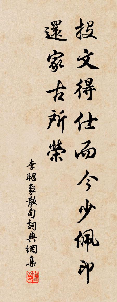 詩詞名句歷史字典書法欣賞書法字典國語詞典說文解字康熙字典古漢語字典標 題 作 者 詩 句 句作者:李昭象 朝代:唐代句原文投文得仕而今少,佩印還家古所榮。詩詞問答問:句的作者是誰?答:李昭象問:句寫於哪個朝代?答:唐代問:句是什麼體裁?答:句李昭象句書法欣賞句書法作品注釋全唐詩:卷689-30詩詞推薦題劉高士看雲圖楊萬里〔宋代〕偶為看雲且罷琴,萬山寒隔一溪深。誰言咽月餐雲客,中有憂時致主心。山居雜詩九十首曹勛〔宋代〕平生江海性,俗冗不到眼。偶然牽祿養,遂復事篇簡。所愧道益遠,所喜性羽懶。末路終此惠,尤得養樗散。嘲段成式(一作廣陽公宴)周繇〔唐代〕蹙鞠且徒為,寧如目送時。報仇慚選耎,存想恨逶遲。促坐疑辟咡,銜杯強朵頤。恣情窺窈窕,曾恃好風姿。色授祠南夕望杜甫〔唐代〕百丈牽江色,孤舟泛日斜。興來猶杖屨,目斷更雲沙。山鬼迷春竹,湘娥倚暮花。湖南清絕地,萬古一長嗟。用韻答厲輔卿二首洪咨夔〔宋代〕南北錦一住,東西岩屢登。報春梅有信,送酒鵲無憑。之子能相過,詩名不浪稱。漉冰烹小鳳,爽思為渠增。郡齋閒步張伯玉〔宋代〕花木方塘小,樓台宅院深。以何消俸祿,無事任山林。雨雪羈游路,風沙苦戰心。若論當此景,不啻萬黃金。白蘋洲送客顧況〔唐代〕莫信梅花發,由來謾報春。不才充野客,扶病送朝臣。闕下搖青珮,洲邊采白蘋。臨流不痛飲,鷗鳥也欺人。送信豐詹丞並寄贛陳丞二首趙蕃〔宋代〕君見陳夫子,懸知問我能。江鷗慣眠草,野雁怯逢矰。矯首困疾首,折肱懷曲肱。攜家能有弟,托死豈無朋。丁未昏釋行海〔宋代〕極目東南王氣浮,雨余春色滿皇州。看花一飲翻如醉,聽角無心亦自愁。吳越是非殘客夢,山川今古白人頭。殷勤筆丁謂〔宋代〕霜距金犀利,煙毫枳棘銛。綠沉裁鏤管,翠羽飾雕奩。幾格朱黃雜,台床竹素兼。古今資日用,錯綜盡洪纖。登敬亭山南望懷古贈竇主簿李白〔唐代〕敬亭一回首,目盡天南端。仙者五六人,常聞此游盤。溪流琴高水,石聳 * 壇。白龍降陵陽,黃鶴呼子安。羽化觀慶雲圖李程〔唐代〕五雲從表瑞,藻繪宛成圖。柯葉何時改,丹青此不渝。非煙色尚麗,似蓋狀應殊。渥彩看猶在,輕陰望已無。方將山中對紫薇花書感馬廷鸞〔宋代〕輕盈插向膽瓶中,看到山林禁御同。閣下天葩秋月黯,樓頭奎畫曉雲空。高攀玉樹扶斑白,靜掃蒼苔拾墮紅。三十過王舍人宅錢起〔唐代〕入門花柳暗,知是近臣居。大隱心何遠,高風物自疏。翛然靜者事,宛得上皇餘。雞犬偷仙藥,兒童授道書。清吟減字木蘭花佚名〔宋代〕向來梅發。雪袂仙裳回絳闕。今又梅開。已領熊罷好夢來。試將梅比。才著陽和爭結子。梅子生成。早晚須調鼎鼐謝李元德郎中餉家釀二首楊萬里〔宋代〕惠山山下玉泉香,釀作鵝兒一拂黃。吏部只知防姓畢,不知吏部有他楊。和寄敬甫葉兄趙希逢〔宋代〕讀史感忠義,掩卷暗奪魄。痛哭治安書,骨梗賢良策。表表漢唐間,相望繼履舄。古今立人朝,委質幾千百。誰能賦石昌言家五題其四懷素草書梅堯臣〔宋代〕往在河南佐王宰,王收書畫盈數車。我於是時多所閱,如今過目無遯差。石君屏上懷素筆,盤屈瘦梗相交加。蒼虬偈頌七十六首釋師觀〔宋代〕動弦別曲,葉落知秋。風生大野,水向東流。滿江紅 賀金子西生日十一月初十日 茲者陳櫟〔元代〕乾鵲鳴檐,殷勤振、玉人生旦。端巧遇、迎長添線,的堪稱讚。律轉一陽葭已動,復來七日梅初綻。符義經、□數名句推薦堂前撲棗任西鄰,無食無兒一婦人。杜甫《又呈吳郎》 聞風聲鶴唳,皆以為王師已至房玄齡《晉書·列傳·第四十九章》 不積小流,無以成江海。荀子《勸學》 舉大事,必慎其終始戴聖《禮記·文王世子》 向河梁、回頭萬里,故人長絕。辛棄疾《賀新郎·別茂嘉十二弟》 玉在櫝中求善價,釵於奩內待時飛。曹雪芹《紅樓夢·第一回》 小荷才露尖尖角,早有蜻蜓立上頭。楊萬里《小池》 何當擊凡鳥,毛血灑平蕪。杜甫《畫鷹》 天下皆知美之為美,斯惡已。皆知善之為善,斯不善已。老子《老子·道經·第二章》 一庭春色惱人來,滿地落花紅幾片。魏承班《玉樓春·寂寂畫堂樑上燕》
