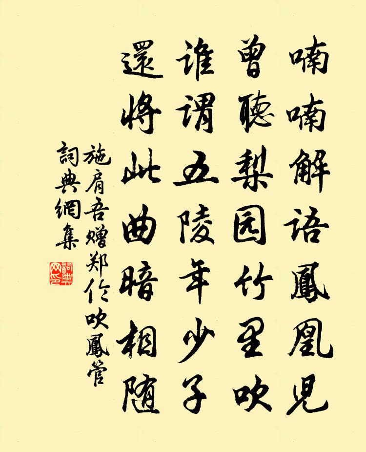 詩詞名句歷史字典書法欣賞書法字典國語詞典說文解字康熙字典古漢語字典標 題 作 者 詩 句 贈鄭倫吹鳳管作者:施肩吾 朝代:唐代贈鄭倫吹鳳管原文喃喃解語鳳凰兒,曾聽梨園竹里吹。誰謂五陵年少子,還將此曲暗相隨。詩詞問答問:贈鄭倫吹鳳管的作者是誰?答:施肩吾問:贈鄭倫吹鳳管寫於哪個朝代?答:唐代問:贈鄭倫吹鳳管是什麼體裁?答:七絕施肩吾贈鄭倫吹鳳管書法欣賞贈鄭倫吹鳳管書法作品注釋全唐詩:卷494-129詩詞推薦閒中戲書陸游〔宋代〕釣竿風月寄滄洲,醉發荻葉秋。仕進世誰知我嬾,功名命不與人謀。衰遲更覺歲時速,疏賤空先天下憂。病骨未銷次韻子瞻題郭熙平遠二絕蘇轍〔宋代〕斷雲斜日不勝秋,付與騷人滿目愁。父老如今亦才思,一蓑風雨釣槎頭。客舍寓懷錢〔唐代〕灑灑灘聲晚霽時,客亭風袖半披垂。野雲行止誰相待,明月襟懷只自知。無伴偶吟溪上路,有花偷笑臘前枝。牽情句宋祁〔宋代〕藥有不龜方,擊絮管無妨。好事近(送林主簿)趙彥端〔宋代〕君到共黃花,君去早梅將發。君不待梅歸去,問與誰同折。白頭潘令一年秋,有酒恨無客。莫忘道山堂上,話清音多景樓張蘊〔宋代〕假日此登臨,淒涼北望心。戍烽孤障杳,塔影一江深。黠虜投鞭想,將軍誓楫吟。所嗟人事異,天險古猶今。送裴闡(得歸字)皇甫冉〔唐代〕道向毗陵豈是歸,客中誰與換春衣。今夜孤舟行近遠,子荊零雨正霏霏。短歌行陸游〔宋代〕上樽不解散牢愁,靈藥安能扶死病?千鈞強弩無自射虛空,六出奇計終難逃定命。人生斯世無別巧,要在遇物心不前廡兩學錄罷職公堂求經明行修之士充員時蜀劉黻〔宋代〕汲古綆懼絕,植德根懼斸。繩樞守窮賤,旦旦天境續。防意如長城,視身等良玉。禰薦非吾榮,臧薦非吾榮,臧毀採蓮曲白居易〔唐代〕菱葉縈波荷颭風,荷花深處小舟通。逢郎欲語低頭笑,碧玉搔頭落水中。新秋雨過述懷宋孝宗〔宋代〕雨聲亂秋聲,驅暑逾南海。涼月倍清輝,細雲變文彩。長空肅無限,遠山青不改。沉吟感素商,淒清鳴萬籟。平生送謝景初遷憑宰餘姚范仲淹〔宋代〕世德踐甲科,青紫信可拾。故鄉特榮輝,高門復樹立。餘姚二山下,東南最名邑。煙水萬人家,熙熙自翔集。又得峽石西泉(一作寒泉)韓愈〔唐代〕居然鱗介不能容,石眼環環水一鍾。聞說旱時求得雨,只疑科斗是蛟龍。三登樂范成大〔宋代〕方帽沖寒,重檢校、舊時農圃。荒三徑、不知何許。但姑蘇台下,有蒼然平楚。人笑此翁,又來訪古。況五湖、元西太一見王荊公舊詩偶次其韻二首蘇軾〔宋代〕華清縹緲浮高棟,上有纈林藏石瓮。一杯此地初識君,千岩夜上同飛鞚。君時年少面如玉,一飲百觚嫌未痛。白鹿勉道林謙光鴻蘊二侄齊己〔唐代〕舊林諸侄在,還住本師房。共掃焚修地,同聞水石香。莫將閒世界,擬敵好時光。須看南山下,無名冢滿岡。次韻張台卿桃花詩毛滂〔宋代〕使君園中花,造物勤管領。佳人含朝酒,風軟吹莫省。正應武陵裔,或寫瑤池影。誰雲六果下,實抱千歲永。得地隔簾聽(林鐘商)柳永〔宋代〕咫尺鳳衾鴛帳,欲去無因到。蝦須窣地重門悄。認繡履頻移,洞房杳杳。強語笑。逞如簧、再三輕巧。梳妝早。琵謝秦校書與無可上人見訪姚合〔唐代〕道同無宿約,三伏自從容。窗豁山侵座,扇搖風下松。客吟多繞竹,僧飯只憑鍾。向晚分歸路,莓苔行跡重。洗缽羅漢贊釋了惠〔宋代〕水落方能石露,有心別無用處。若問佛法如何,日洗缽盂兩度。名句推薦使人有面前之譽,不若使人無背後之毀陳繼儒《小窗幽記·集醒篇》 富貴多憂,貧窮自在。佚名《增廣賢文·上集》 雲和積雪蒼山晚,煙伴殘陽綠樹昏。周朴《春日秦國懷古》 世間珍果更無加,玉雪肌膚罩絳紗。丘浚《詠荔枝》 人隨沙岸向江村,余亦乘舟歸鹿門。孟浩然《夜歸鹿門山歌 / 夜歸鹿門歌》 願學秋胡婦,貞心比古松。李白《湖邊採蓮婦》 兩水夾明鏡,雙橋落彩虹。李白《秋登宣城謝朓北樓》 精衛銜微木,將以填滄海。陶淵明《讀山海經·其十》 嬌艷輕盈香雪膩,細雨黃鶯雙起。張泌《滿宮花·花正芳》 靈山多秀色,空水共氤氳。張九齡《湖口望廬山瀑布泉 / 湖口望廬山瀑布水》