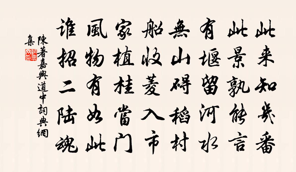 詩詞名句歷史字典書法欣賞書法字典國語詞典說文解字康熙字典古漢語字典標 題 作 者 詩 句 嘉興道中作者:陳著 朝代:宋代嘉興道中原文此來知幾番,此景孰能言。有堰留河水,無山礙稻村。船收菱入市,家植桂當門。風物有如此,誰招二陸魂。詩詞問答問:嘉興道中的作者是誰?答:陳著問:嘉興道中寫於哪個朝代?答:宋代陳著嘉興道中書法欣賞嘉興道中書法作品詩詞推薦玉樓春梅堯臣〔宋代〕天然不比花含粉。約月眉黃春色嫩。小橋低映欲迷人,閒倚東風無奈困。煙姿最與章台近。冉冉千絲誰結恨。狂鶯和周南吉二絕王炎〔宋代〕才諝諸公爭汲引,文高后學共儀刑。相逢未覺功名晚,鏡里依然兩鬢青。丙除夜泊舟東湖用白石歸苕溪韻書懷徐端〔宋代〕城郭人家餞歲寒,裁紅剪翠饌春盤。湖濱老圃無時態,繞屋畦蔬向曉看。送傅守歸劉宰〔宋代〕堂堂司馬公,獨樂五畝園。歲月坐成晚,花木亦已繁。世事尚可為,石交有遺言。歸來默無語,拊石弄潺湲。止齋即事二首陳傅良〔宋代〕教子時開卷,逢人強整襟。再貧看晚節,多病得初心。地僻茭蓮好,山低竹樹深。寄聲同燕社,明月以秋砧。虎丘新復古石井泉,太守沈虞卿舍人勸農過之范成大〔宋代〕傳聞公作新亭好,先報儂家拄杖知。便擬挈瓶來煮茗,繞闌乾角遍尋詩。秋興呈裴李二同年寇準〔宋代〕秋興逐涼吹,颯然驅煩襟。人悲故鄉遠,葉落空山深。楚俗傷去恨,秦城稀來音。何當返煙渭,自樂於園林。奉和九日幸臨渭亭登高應制得歡字宋之問〔唐代〕令節三秋晚,重陽九日歡。仙杯還泛菊,寶饌且調蘭。御氣雲霄近,乘高宇宙寬。今朝萬壽引,宜向曲中彈。題曾氏山園十一詠橘沜張栻〔宋代〕我家湘水濱,年年賦徠服。君家百畝田,晚歲千樹綠。聞子規李彌遜〔宋代〕客時春秋過半生,子規枝上最關情。南來故國一萬里,卻笑子規猶亂鳴。常牧溪猿圖釋智愚〔宋代〕霜墮群林空,一嘯千岩靜。耿耿殊有情,勞生髮深省。抱子攀危條,清興在高遠。一點鐘愛心,業風吹不斷。烏夜啼程垓〔宋代〕楊柳拖煙漠漠,梨花浸月溶溶。吹香院落春還盡,憔悴立東風。只道芳時易見,誰知密約難通。芳園繞遍無人問,四月八日文天祥〔宋代〕今朝浴佛舊風流,身落山前第一州。贛上瑤桃俄五稔,海中玉果已三周。人生聚散真成夢,世事悲歡一轉頭。坐對送權先輩歸覲信安趙嘏〔唐代〕衣彩獨歸去,一枝蘭更香。馬嘶芳草渡,門掩百花塘。野色亭台晚,灘聲枕簟涼。小齋松島上,重葉覆書堂。句王安石〔宋代〕青山捫虱坐,黃鳥俠書眠。乘舟阻風張嵲〔宋代〕平生所遇悉堪咍,往返江湖知幾回。長是扁舟阻風浪,羨他舟楫掛帆來。送楊府李功曹張九齡〔唐代〕平生屬良友,結綬望光輝。何知人事拙,相與宦情非。別路穿林盡,征帆際海歸。居然已多意,況復兩鄉違。見梁檢法書懷八絕句於廣文尉曹處次韻趙蕃〔宋代〕中聖流風久未寒,渺然何但酒腸寬。渠詩下筆如山峽,我思攀危上七盤。釋大方廣佛華嚴經賢首菩薩贊佛偈釋遵式〔宋代〕見有臨終勸念佛,及示尊像令瞻敬。俾於佛所深歸仰,是故得成此光明。畫水仙梅山樊釋寶曇〔宋代〕生香故觸人,異質偶同調。喚作黃家花,弟兄一語妙。名句推薦前慮不定,後有大患。司馬遷《史記·蘇秦列傳》 忍淚不能歌,試托哀弦語晏幾道《生查子·墜雨已辭雲》 報導先生歸也,杏花春雨江南。虞集《風入松·寄柯敬仲》 人棄我取,人取我與。司馬遷《史記·貨殖列傳》 教人無處寄相思,落花芳草過前期,沒人知。孫光憲《虞美人·好風微揭簾旌起》 從善如登,從惡如崩。左丘明《國語·周語·劉文公與萇弘欲城周》 惠遠祠前晉溪水,翠葉銀花清見底。元好問《過晉陽故城書事》 野田春水碧於鏡,人影渡傍鷗不驚。汪藻《春日·一春略無十日晴》 無論習何等業,總不可有粗浮心。王永彬《圍爐夜話·第三五則》 滿街楊柳綠絲煙,畫出清明二月天。韋莊《丙辰年鄜州遇寒食城外醉吟五首》