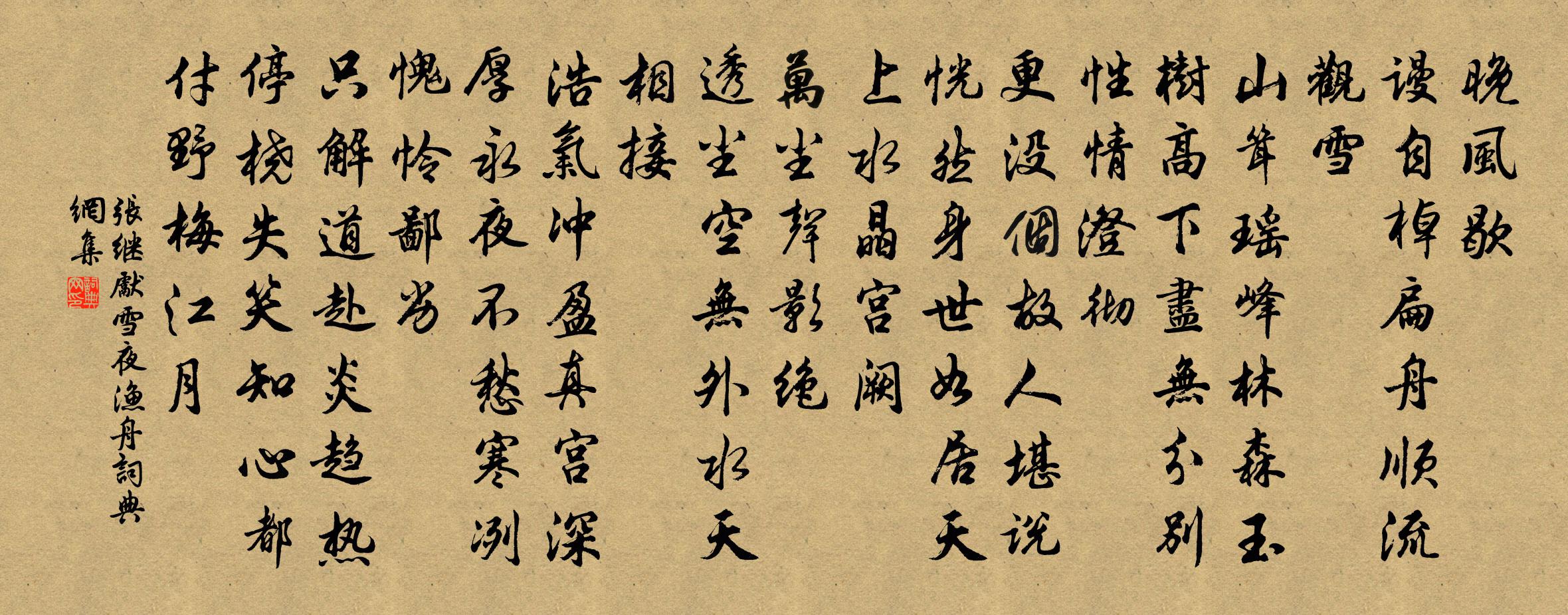 詩詞名句歷史字典書法欣賞書法字典國語詞典說文解字康熙字典古漢語字典標 題 作 者 詩 句 雪夜漁舟作者:張繼先 朝代:宋代雪夜漁舟原文晚風歇。謾自棹扁舟,順流觀雪。山聳瑤峰,林森玉樹,高下盡無分別。性情澄徹。更沒個、故人堪說。恍然身世,如居天上,水晶宮闕。萬塵聲影絕。透塵空無外,水天相接。浩氣沖盈,真宮深厚,永夜不愁寒冽。愧憐鄙劣。只解道、赴炎趨熱。停橈失笑,知心都付,野梅江月。詩詞問答問:雪夜漁舟的作者是誰?答:張繼先問:雪夜漁舟寫於哪個朝代?答:宋代問:雪夜漁舟是什麼體裁?答:詞張繼先雪夜漁舟書法欣賞雪夜漁舟書法作品詩詞推薦偈頌一百零四首釋紹曇〔宋代〕三伏炎蒸,汗流如雨。一莖草上建瓊樓,徹骨貧窮敵國富。驀山溪呂渭老〔宋代〕元宵燈火。月淡遊人可。攜手步長廊,又說道、傾心向我。歸來一夢,整整十年餘,人似舊,去無因,牽惹情懷破酒泉子韋莊〔唐代〕月落星沉,樓上美人春睡。綠雲傾,金枕膩,畫屏深。子規啼破相思夢,曙色東方才動。柳煙輕,花露重,思難任偶置小園因題王禹偁〔宋代〕偶營菜圃為盤飱,淮瀆祠前水北村。泉響靜連衙鼓響,柴門深近子城門。濛濛細雨春蔬甲,亹亹寒流老樹根。從此偈六十三首釋道寧〔宋代〕經入藏,禪歸海。未足衲僧親道底,拂袖前行歸去來。擊碎重關門大啟。長安夜夜家家月,幾處笙歌幾處愁。秋懷五首孫嵩〔宋代〕何處秋聲多,竹外聲歷歷。淒切不禁寒,蕭蕭舊時碧。此中白髮愁,餉與秋風客。題漱玉館王宗賢〔宋代〕寓館欣傳漱玉名,泉流古竇響琮琤。幽窗偃息驚回夢,誤聽虛檐雨滴聲。句姚孝錫〔宋代〕節物先後南北異,人情冷暖古今同。損窗釋普濟〔宋代〕六處虛明不假修,七穿八穴有來由。霜風霰雪縱橫入,不是愁人也著愁。謁禹廟宋之問〔唐代〕夏王乘四載,茲地發金符。峻命終不易,報功疇敢渝。先驅總昌會,後至伏靈誅。玉帛空天下,衣冠照海隅。旋聞館中夏日孔武仲〔宋代〕珍簟舒明玉,涼窗納碧天。殿樓傳遠鼓,宮井取深泉。竹籜風頻脫,榴房晚更鮮。卻驚非故國,五月未聞蟬。詠史馮必大〔宋代〕亭長何曾識帝王,入關便解約三章。只消一勺清冷水,冷卻秦鍋百沸湯。夕霽杜陵登樓寄韋繇李白〔唐代〕浮陽滅霽景,萬物生秋容。登樓送遠目,伏檻觀群峰。原野曠超緬,關河紛雜重。清暉映竹日,翠色明雲松。蹈海謝君植矮梅百許株蟠屈如輪臘至皆著花灑灑可喻良能〔宋代〕孤竹低回首陽下,許由偃蹇箕山巔。謝君雅有林泉趣,種得江梅如二賢。南州臘月溫和早,賴有冰花除熱惱。鱗差登玉霄亭曾幾〔宋代〕老荷君恩付赤城,瘦筇扶上玉霄亭。懸知地接溟溟海,坐見天橫兩兩星。作賦興公虛想像,謫官司戶實飄零。衰翁游靈岩富言〔宋代〕聞說靈岩境最幽,乘閒艤棹共追游。飛泉翠滴半空雨,古樹陰連萬壑秋。縹緲香菸籠梵榻,嵯峨山勢枕江流。登臨頌古三首釋心月〔宋代〕百年將底作津梁,直指心田是道場。八萬四千安樂法,只於此處{指胸}可承當。過商山貫休〔唐代〕吟緣橫翠憶天台,嘯狖啼猿見盡猜。四個老人何處去,一聲仙鶴過溪來。皇城宮闕回頭盡,紫閣煙霞為我開。天際小兒生日蒲壽宬〔宋代〕今年二十八,細憶始生時。漸喜山多樹,尤憐水滿池。相寬吾老大,自教爾童兒。佛誕明朝是,然香共展眉。滿庭芳·堠雪翻鴉納蘭性德〔清代〕堠雪翻鴉,河冰躍馬,驚風吹度龍堆。陰燐夜泣,此景總堪悲。待向中宵起舞,無人處、那有村雞。只應是,金笳名句推薦事在四方,要在中央。韓非及後人《韓非子·揚權》 重賞之下,必有勇夫。畢沅《續資治通鑑·宋紀·宋紀十七》 水滿池塘花滿枝。亂香深里語黃鸝。趙令疇《浣溪沙·水滿池塘花滿枝》 斜陽照墟落,窮巷牛羊歸。王維《渭川田家》 何時更杯酒,再得論心胸。李白《魏郡別蘇明府因北游》 秋江帶雨,寒沙縈水,人瞰畫閣愁獨。史達祖《八歸·秋江帶雨》 成大功者不小苛。劉向《說苑·政理》 在上不驕,高而不危;制節謹度,滿而不溢。孔子及其弟子《孝經·諸侯》 暝色入高樓,有人樓上愁。李白《菩薩蠻·平林漠漠煙如織》 高議而不可及,不若卑論之有功也。劉向《說苑·談叢》