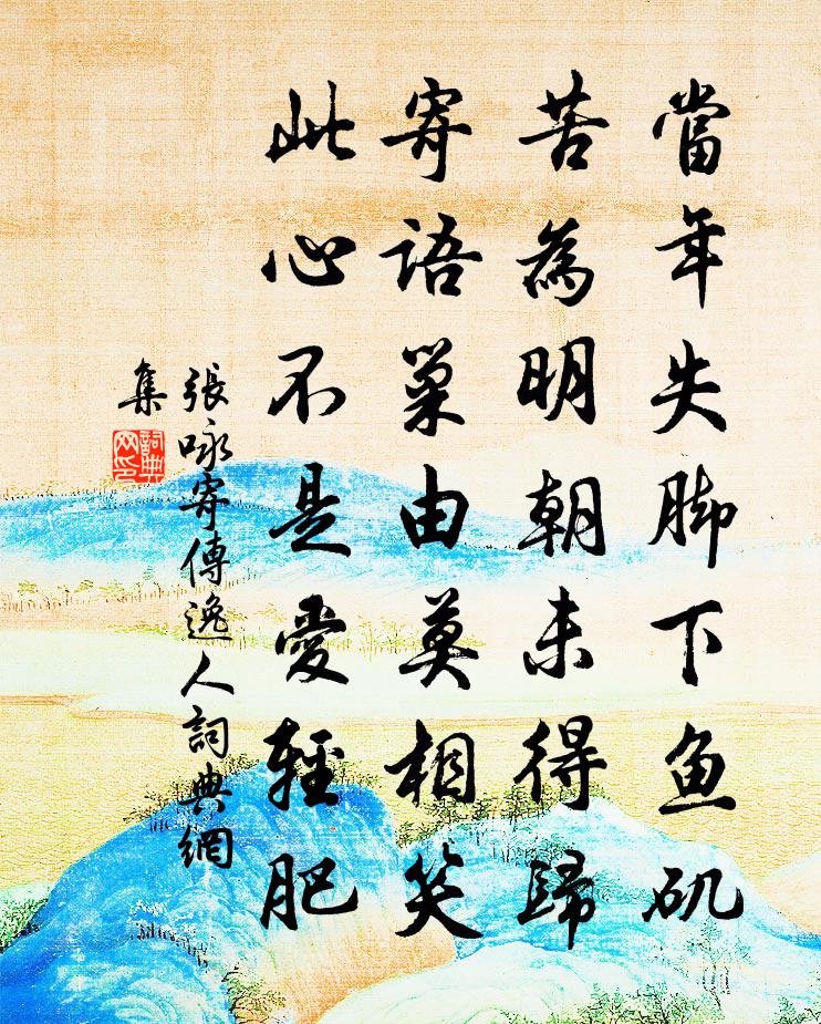 詩詞名句歷史字典書法欣賞書法字典國語詞典說文解字康熙字典古漢語字典標 題 作 者 詩 句 寄傳逸人作者:張詠 朝代:宋代寄傳逸人原文當年失腳下魚磯,苦為明朝未得歸。寄語巢由莫相笑,此心不是愛輕肥。詩詞問答問:寄傳逸人的作者是誰?答:張詠問:寄傳逸人寫於哪個朝代?答:宋代張詠寄傳逸人書法欣賞寄傳逸人書法作品詩詞推薦同辛兗州巢父虛副端岳相思獻酬…兼呈辛魏二院長楊長寧戎昱〔唐代〕暮角發高城,情人坐中起。臨觴不及醉,分散秋風裡。雖有明月期,離心若千里。前歡反惆悵,後會還如此。焉得十月菊潘牥〔宋代〕夕陽西去一憑欄,眼底黃花自歲寒。姚魏終皆非正色,請君細把楚騷看。碧沼寺劉大綱〔宋代〕地僻人稀到,唐賢句尚存。觀魚尋曲沼,弔古入名園。山翠沾夜袂,苔紋印屐痕。暫陪尊俎樂,簫鼓出丘樊。偈頌五首釋亮〔宋代〕金風起,樹葉落,體露堂堂活鱍鱍。報君知,快領略。回頭轉腦擬思量,錯認笊離作木杓。孫教授輓詩洪咨夔〔宋代〕手織天孫錦,胸吞海吞洋。官卑材不盡,年往慮空長。啼鳥呼春夢,飛花餞夕陽。唯余君子澤,插架簡編香。答贇禪師問宗門三印南修造〔宋代〕印空印泥印水,平地寒濤競起。假饒去就十分,也是靈龜曳尾。十二月二日夜夢與客並馬行黃河上息於古驛陸游〔宋代〕河濱古驛辟重門,雉兔紛紛黍酒渾。吾輩豈應徒醉飽,會傾東海洗中原。游秀府擇勝園周端臣〔宋代〕擇勝前朝錫雅名,不多花木四時榮。樓當列岫仍臨水,地此諸園最傍城。池暖錦鱗冬亦泳,洞寒丹鶴曉先鳴。宗王石芥朱翌〔宋代〕長安官酒甜如蜜,風月雖佳懶舉觴。特送盤蔬還會否,與公新釀斗端方。為慧林沖禪師燒香頌三首黃庭堅〔宋代〕多年破衲不勝針,一曲胡笳無古今。往日聞韶獨忘味,守株人在月西沈。朱文公陳普〔宋代〕嘗思紫陽翁,功德不下禹。平生五人倫。叔世一天柱。海岳久亭毓,二儀厚付與。高明掛秋月,精細破毫縷。舉目寄四二侄吳芾〔宋代〕書來言舊隱,湖上足煙光。樹密交青蔭,花繁溢暗香。紅塵飛不入,綠水去何長。回首千山隔,歸心欲發狂。生查子張泌〔唐代〕相見稀,喜相見,相見還相遠。檀畫荔支紅,金蔓蜻蜓軟。魚雁疏,芳信斷,花落庭陰晚。可惜玉肌膚,消瘦成慵記小圃花果二十首劉克莊〔宋代〕古有如瓶李,得之海上仙。如何阿戎輩,鑽核怕人傳。雲溪雜詠郭印〔宋代〕步屧尋幽勝,亭邊水竹饒。地令人事遠,江遣客愁銷。自是塵難近,誰雲隱可招。洞天無別景,於此日逍遙。新雪二首 寄楊舍人。白居易〔唐代〕不思北省煙霄地,不憶南宮風月天。唯憶靜恭楊閣老,小園新雪暖爐前。不思朱雀街東鼓,不憶青龍寺後鍾。唯憶梨洲戒長老請贊釋大觀〔宋代〕相牽相引,自拈自弄。賺正因人,變滅胡種。業在其中不自知,九成韶集丹山鳳。偈頌八十七首釋慧開〔宋代〕烈焰亘天,洪濤輥底。眨上眉毛,劍去久矣。過小孤李曾伯〔宋代〕孤立江淮地,中分南北天。洪漢沖巨塊,對峙束平川。屹若壁千仞,過錯螺一拳。誰將牛女比,斯事豈其然。晚過象之葆光亭步月韓維〔宋代〕浮沉閭裡間,放志謝維摯。行貪月色靜,歸犯霜華濕。寒鼓出城重,飛星過樓急。卻想竹亭下,主人猶獨立。名句推薦話別情多聲欲戰,玉著痕留紅粉面。顧敻《玉樓春·拂水雙飛來去燕》 易挑錦婦機中字。難得玉人心下事。劉克莊《玉樓春·戲林推》 安居不用架高堂,書中自有黃金屋。趙恆《勸學詩》 壚邊人似月,皓腕凝霜雪。韋莊《菩薩蠻·人人盡說江南好》 我見君來,頓覺吾廬,溪山美哉。辛棄疾《沁園春·和吳尉子似》 魏都接燕趙,美女夸芙蓉。李白《魏郡別蘇明府因北游》 君子進則能益上之譽,而損下之憂戴聖《大戴禮記·曾子制言中第五十五》 人怕三見面,樹怕一墨線。佚名《增廣賢文·下集》 紅樹青山日欲斜,長郊草色綠無涯。歐陽修《豐樂亭遊春·其三》 讓利精於取利,逃名巧於邀名。陳繼儒《小窗幽記·集靈篇》