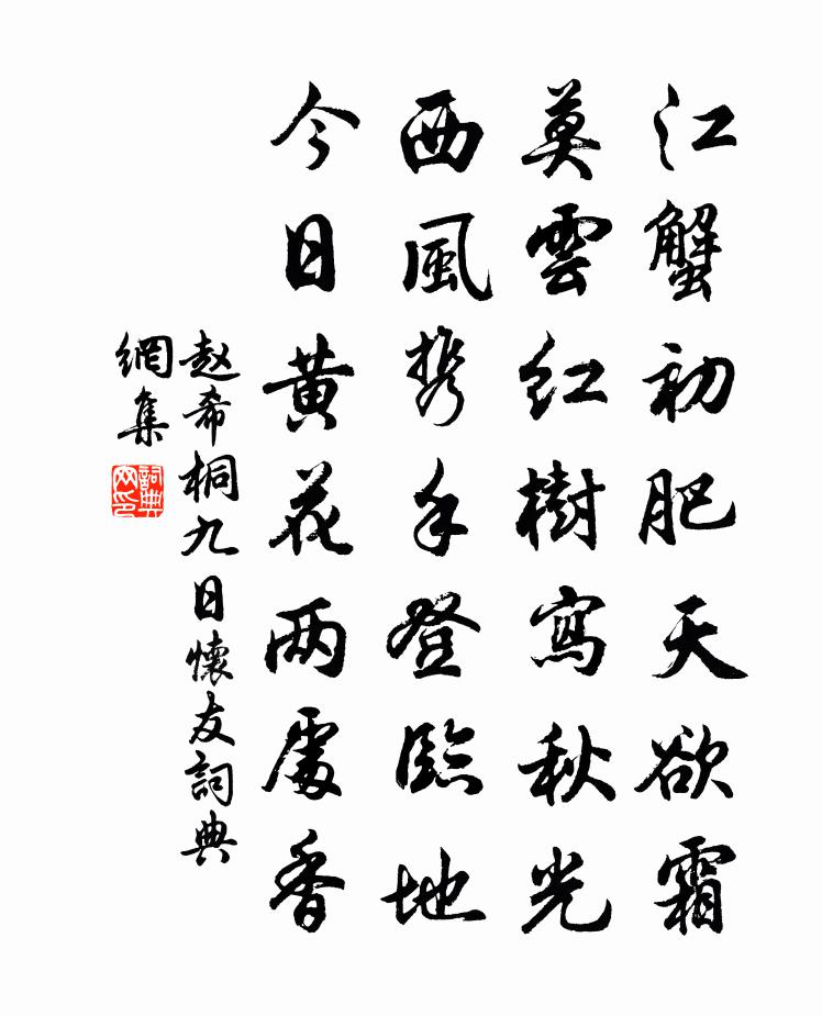 詩詞名句歷史字典書法欣賞書法字典國語詞典說文解字康熙字典古漢語字典標 題 作 者 詩 句 九日懷友作者:趙希桐 朝代:宋代九日懷友原文江蟹初肥天欲霜,莫雲紅樹寫秋光。西風攜手登臨地,今日黃花兩處香。詩詞問答問:九日懷友的作者是誰?答:趙希桐問:九日懷友寫於哪個朝代?答:宋代趙希桐九日懷友書法欣賞九日懷友書法作品詩詞推薦雨中看山榴落花李郢〔唐代〕山榴逼砌栽,山火一團開。盡日風兼雨,春渠擁作堆。野亭三韻送錢員外李端〔唐代〕野菊開欲稀,寒泉流漸淺。幽人步林後,嘆此年華晚。倚杖送行雲,尋思故山遠。戲寇君二首陳師道〔宋代〕南鄰歌舞隔牆聽,想對朝窗暈倒青。莫望喚人看娜嫋,只憑幽夢寄丁寧。和楊大年館直詩張表臣〔宋代〕翰林歷歷侵華蓋,禁掖明朝侍紫微。自昔詞臣最清切,帝宸高拱借光輝。贈爭相士三首姚勉〔宋代〕玉帳元戎過福州,誰擔此擔向邊頭。中宵欹枕難成寐,底道儂無隔夜愁。題懶庵二首劉子翬〔宋代〕地偏賓至稀,晝靜門常掩。深房紙瓦明,宴坐薄團穩。庭花落未掃,徑草繁不剪。林泉倦出遊,況乃市朝遠。廣曾敬仲王柏〔宋代〕功名須少年,老大意終懶。學產順無窮。青春嗟有限。用處不需多,雲霄路坦坦。賈生正英銳,郎潛自羞赧。文字青玉案(殘春)趙長卿〔宋代〕梅黃又見纖纖雨。客里情懷兩眉聚。何處煙村啼杜宇。勸人歸去,早思家轉,聽得聲聲苦。利名縈絆何時住。惱亂頌古十七首釋師觀〔宋代〕比此為津梁,赤體露堂堂。風光都買盡,當處是家鄉。漫書呈幾復三首黃庭堅〔宋代〕秋蟲振羽驚寒夢,河漢西斜夜獨興。欲罷不能呼子起,新涼宜近讀書燈。讀西峰寺壁間詩方鳳〔宋代〕出郭幽探約里程,竹籬小語忽雲生。寺藏密樹磬聲得,客染流霞暑氣清。煮茗每聞松湍落,長苔半與石床平。何來送新羅人及第歸貫休〔唐代〕捧桂香和紫禁菸,遠鄉程徹巨鰲邊。莫言掛席飛連夜,見說無風即數年。衣上日光真是火,島旁魚骨大於船。到鄉予久客思歸以秋光都似宦情薄山色不如歸意濃仇遠〔宋代〕早從方外游,志不在婚宦。採薇陟西山,采藻涉南澗。拄杖僅過眉,短衣不掩骭。一為火宅累,漸覺有憂患。難任浣溪沙 壽李衛尉王惲〔元代〕矍鑠當年漢伏波。紫微垣外待*戈。笑騎天*下天河。華發雅宜麟閣畫,春風先送武城歌。朱顏休惜卷金荷。永遇樂(蔡州移守潁昌,與客會別臨芳觀席上)葉夢得〔宋代〕天末山橫,半空簫鼓,樓觀高起。指點栽成,東風滿院,總是新桃李。綸巾羽扇,一尊飲罷,目送斷鴻千里。攬清蘇幕遮王哲〔元代〕個人人,二旬八。勿肯回頭,性命成搜刷。撲入沉淪常墜壓。鏡子前來,著甚言談答。是神仙,何不察。劈破凡心古人行方岳〔宋代〕古人印二十四,已自取億印。加我三十一,擁褐猿猱逕。古人三十六,已自嘆頭顱。加我十九年,雪頷埋霜須。春初移琪樹羊士諤〔唐代〕愛此丘中物,煙霜盡日看。無窮碧雲意,更助綠窗寒。題畫十首唐寅〔明代〕平村泉石足幽棲,暖著田衣飽青藜。坐看雞蟲笑莊子,勞勞齊物物難齊。酷吏詞貫休〔唐代〕霰雨灂灂,風吼如劚。有叟有叟,暮投我宿。吁嘆自語,雲太守酷。如何如何,掠脂斡肉。吳姬唱一曲,等閒破紅名句推薦亡國至亡而後知亡,至死而後知死荀子《荀子·強國》 倉無備粟,不可以待凶飢。墨子《墨子·05章 七患》 聖賢之所美,莫美乎聰明;聰明之所貴,莫貴乎知人。劉劭《人物誌·序》 黯然銷魂者,唯別而已矣!江淹《別賦》 春色滿園關不住,一枝紅杏出牆來。葉紹翁《遊園不值》 細看茱萸一笑,詩翁健似常年。張可久《風入松·九日》 今古河山無定據。納蘭性德《蝶戀花·出塞》 心似已灰之木,身如不系之舟。蘇軾《自題金山畫像》 四面邊聲連角起,千嶂里,長煙落日孤城閉。范仲淹《漁家傲·秋思》 水遠煙微,一點滄洲白鷺飛歐陽修《採桑子·何人解賞西湖好》