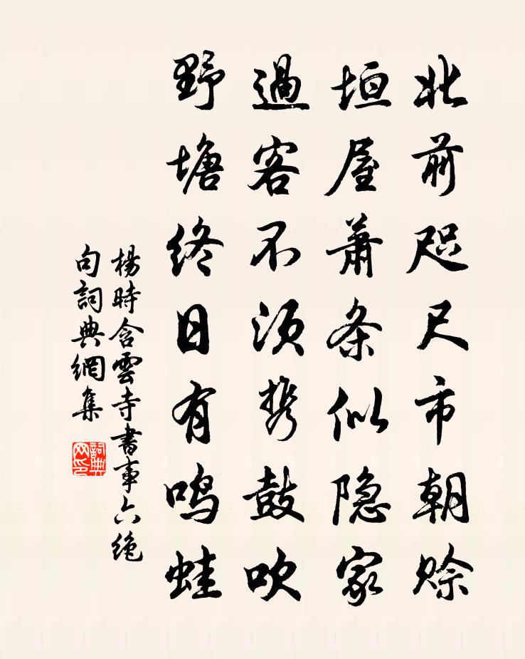 詩詞名句歷史字典書法欣賞書法字典國語詞典說文解字康熙字典古漢語字典標 題 作 者 詩 句 含雲寺書事六絕句作者:楊時 朝代:宋代含雲寺書事六絕句原文北前咫尺市朝賒,垣屋蕭條似隱家。過客不須攜鼓吹,野塘終日有鳴蛙。詩詞問答問:含雲寺書事六絕句的作者是誰?答:楊時問:含雲寺書事六絕句寫於哪個朝代?答:宋代楊時含雲寺書事六絕句書法欣賞含雲寺書事六絕句書法作品詩詞推薦齋中聞急雨陸游〔宋代〕一味疏慵養不才,飯蔬亦已罷銜杯。衡茆終日人聲絕,臥聽芭蕉報雨來。閬州東園十詠曲池文同〔宋代〕水似珠璫入,池如玉磬開。臨流唯自適,魚鳥莫相猜。讀金鑾密記劉克莊〔宋代〕仗下千官走似麇,倉皇誰扈屬車塵。禁中陸九艱危共,殿上朱三苦死嗔。當日橫身抗岐汴,暮年避地客甌閩。小窗雜題陸游〔宋代〕湖堤疏瘦水楊柳,村舍殷紅山石榴。推戶本來隨意入,乞漿因得片時留。句鄭文寶〔宋代〕人辭碧落春風晚,花老朱陵古渡頭。風流子方君遇〔宋代〕春被雨禁持。傷心事、仿佛去年時。記芳徑暮歸,褪妝微醉,暗幃先寢,聞笑佯痴。回首別離容易過,楊柳又依依臨江仙(明日小雨,已而風大作,復晚晴,遂見月,與客再登)葉夢得〔宋代〕捲地驚風吹雨去,卻看香霧輕浮。遙知清影遍南州。萬峰橫玉立,誰為此山留。邂逅一歡須共惜,年年長記今秋。東林寺寄包侍御靈澈〔唐代〕古殿清陰山木春,池邊跂石一觀身。誰能來此焚香坐,共作壚峰二十人。菩薩蠻吳泳〔宋代〕鶯花舊恨憑誰雪。也須管句燈時節。黃已上眉峰。小槽初滴紅。好天佳月夕。結佩飛霞客。醒恐不如酲。何妨獨屢如夢令姚述堯〔宋代〕雅淡輕盈如語。碧玉枝頭嬌處。鉤月襯凌波,仿佛湘江煙路。凝佇。凝佇。不似梨花帶雨。禮湘山佛和別駕叔韻李曾伯〔宋代〕自得湘南一派奇,禪舂元熟不須師。幾千億化如來相,五百年將再出時。翠壁雲連秋樹老,寶坊香靜午齋遲。我來三洲岩唐弼〔宋代〕峒里光陰經幾春,峒前蒼木垂千尋。不知空谷當年事,誰識龐眉處士心。殘月照人吞遠徼,晚風吹夢入幽岑。我來寄答張五丈夔明府張頡〔宋代〕舊訟龍溪有去思,移家喜與上風宜。人傳張籍妙樂府,我識王維真畫師。火米夏收畬稻早,海椒春放瘴花遲。客查李翱見藥山圖贊釋紹曇〔宋代〕天本藏雲,瓶元貯水。不會看經。那堪指示。寄語唐朝李相公,只須著眼聽松風。秋書晁說之〔宋代〕秋為棗多暑,天因禾未霜。吁嗟爾凶虜,宜亦畏皇綱。減字木蘭花黃庭堅〔宋代〕中秋無雨。醉送月銜西嶺去。笑口須開。幾度中秋見月來。前年江外。兒女傳杯兄弟會。此夜登樓。小謝清吟慰白葉西廬惠冬菊三絕王柏〔宋代〕誰知造化用工深,處士隱潛得返魂。白髮書生留晚節,從今歲歲典刑存。偈頌七十六首釋師範〔宋代〕千峰萬峰濃潑眼,十溪五溪深沒腰。只有山翁喜相接,聲聲慚愧與難消。且道還有所得也,蝦蟆口裹一粒椒。大丘至黎坑口葛紹體〔宋代〕重嵐浮動光相射,峭壁橫斜罅欲開。比似雁山多秀髮,豐稜那復讓天台。嘲春風溫庭筠〔唐代〕春風何處好,別殿饒芳草。苒裊轉鸞旗,萎蕤吹雉葆。揚芳歷九門,澹蕩入蘭蓀。爭奈白團扇,時時偷主恩。名句推薦到家應是,童稚牽衣,笑我華顛。吳激《訴衷情·夜寒茅店不成眠》 王母歡闌瓊宴罷,仙人淚滿金盤側。文天祥《滿江紅·代王夫人作》 問世間,情是何物,直教生死相許?元好問《摸魚兒·雁丘詞 / 邁陂塘》 謝亭離別處,風景每生愁。李白《謝公亭·蓋謝朓范雲之所游》 彼竊鉤者誅,竊國者為諸侯,諸侯之門而仁義存焉莊子《莊子·外篇·胠篋》 能近取譬,可謂仁之方也已。孔子弟子《論語·雍也篇》 況復煩促倦,激烈思時康。杜甫《夏夜嘆》 形相雖惡而心術善,無害為君子也。荀子《荀子·非相》 灞涘望長安,河陽視京縣。謝朓《晚登三山還望京邑》 人心不足蛇吞象。馮夢龍《警世通言·卷二十五》