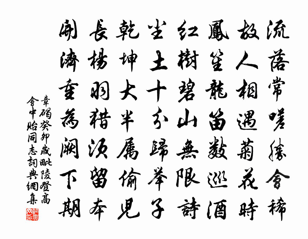 詩詞名句歷史字典書法欣賞書法字典國語詞典說文解字康熙字典古漢語字典標 題 作 者 詩 句 癸卯歲毗陵登高會中貽同志作者:章碣 朝代:唐代癸卯歲毗陵登高會中貽同志原文流落常嗟勝會稀,故人相遇菊花時。鳳笙龍笛數巡酒,紅樹碧山無限詩。塵土十分歸舉子,乾坤大半屬偷兒。長楊羽獵須留本,開濟重為闕下期。詩詞問答問:癸卯歲毗陵登高會中貽同志的作者是誰?答:章碣問:癸卯歲毗陵登高會中貽同志寫於哪個朝代?答:唐代章碣癸卯歲毗陵登高會中貽同志書法欣賞癸卯歲毗陵登高會中貽同志書法作品注釋全唐詩:卷669-24詩詞推薦冬至前月赴季父梅花之集與韓蒲向憲唐乾諸人胡寅〔宋代〕的皪凝懷開自尺,風亭微馥許君知。直須藉草傾松葉,絕勝登樓唱竹枝。韓壽香囊難取似,何郎粉面且隨宜。豈知初移琪樹羊士諤〔唐代〕愛此丘中物,煙霜盡日看。無窮碧雲意,更助綠窗寒。西樓望月張籍〔唐代〕城西樓上月,復是雪晴時。寒夜共來望,思鄉獨下遲。幽光落水塹,淨色在霜枝。明日千里去,此中還別離。喜赦沈佺期〔唐代〕去歲投荒客,今春肆眚歸。律通幽谷暖,盆舉太陽輝。喜氣迎冤氣,青衣報白衣。還將合浦葉,俱向洛城飛。桃花黃靜齋〔宋代〕雨後桃花作片飛,風前柳絮點人衣。春歸不用怨風雨,無雨無風春亦歸。朝中措趙彥端〔宋代〕新涼溪閣暮山重。水月共空濛。九轉不須塵外,三峰只在壺中。他年盛業,雲間可望,林下難逢。記取薌林岩洞,懷中侄釋智圓〔宋代〕一從林下別,倏忽又經年。舊約山空在,相懷月屢圓。郡鍾宵斷夢,江樹晚沈煙。書札憑誰寄,波濤況渺然。楊柳枝盧肇〔唐代〕青鳥泉邊草木春,黃雲塞上是征人。歸來若得長條贈,不憚風霜與苦辛。自訟一首宋庠〔宋代〕左輔朱轓守,南宮革履臣。孤螢難助日,病木獨依春。暗懦疑蛇客,愚忠數馬人。誰知溫省樹,自誡魯堂紳。監令丙申重九前後得今日都無病一句成十首方回〔宋代〕今日都無病,今年粗慰心。西風田畯喜,南斗歲星臨。人老顏如雪,家貧菊似金。典衣作重九,猶可一杯斟。西湖大醉走筆百韻白玉蟾〔宋代〕廼先 * 君,萬有七千祀。迄彼大庭時,對於葛天氏。邈計幾何年,是生余小子。上清太極公,造道窮天髓。有晉玉蝴蝶·晚雨未摧宮樹史達祖〔宋代〕晚雨未摧宮樹,可憐閒葉,猶抱涼蟬。短景歸秋,吟思又接愁邊。漏初長、夢魂難禁,人漸老、風月俱寒。想幽歡黃精鹿蘇軾〔宋代〕太華西南第幾峰,落花流水自重重。幽人只採黃精去,不見春山鹿養茸。再次韻四首陳造〔宋代〕犖确悍頑經數驛,醒然初挹碧嶙峋。眼明驟與真山晤,不比逃虛見似人。麗人賦沈約〔南北朝〕 有客弱冠未仕,締交戚里,馳騖王室,遨遊許史。歸而稱曰:狹邪才女,銅街麗人,亭亭似月,嬿婉如春,凝送聰上人歸四明趙汝鐩〔宋代〕辦得四方游,孜孜討入頭。歸雲起齋缽,高浪送行舟。笠戴天童雨,鞋穿雪竇秋。平常心是道,莫更問人休。梅花尤袤〔宋代〕冷艷天然白,寒香分外清。稍驚春色早,又喚客愁生。待索巡檐笑,嫌聞出塞聲。園林多少樹,見爾眼偏明。使過瑤台寺,有懷圓寂上人顏真卿〔唐代〕上人居此寺,不出三十年。萬法元無著,一心唯趣禪。忽紆塵外軫,遠訪區中緣。及爾不復見,支提猶岌然。題廬山山下湯泉白居易〔唐代〕一眼湯泉流向東,浸泥澆草暖無功。驪山溫水因何事,流入金鋪玉甃中。題安州張全翁大夫溪圖張耒〔宋代〕清溪縈洄流碧玉,散入緣岡萬竿竹。照春四合錦繡林,乾雲直上風霜木。主人吾宗行珪璧,解組歸來鬢猶綠。只知名句推薦隔水氈鄉,落日牛羊下,區脫縱橫。張孝祥《六州歌頭·長淮望斷》 馬者,所以命形也;白者,所以命色也。公孫龍《公孫龍子·白馬論》 人生到處知何似,應似飛鴻踏雪泥。蘇軾《和子由澠池懷舊》 知而好問,然後能才。荀子《荀子·儒效》 酒不醉人人自醉,色不迷人人自迷。馮夢龍《警世通言·卷二十四》 露下旗濛濛,寒金鳴夜刻。李賀《塞下曲》 聖人以智籠群愚,亦猶狙公之以智籠眾狙也。名實不虧,使其喜怒哉。列子及其弟子《列子·黃帝》 似此星辰非昨夜,為誰風露立中宵。黃景仁《綺懷》 對秋深,離恨苦,數夜滿庭風雨。孫光憲《更漏子·對秋深》 舊相思、偏供閒晝。吳文英《夜遊宮·春語鶯迷翠柳》
